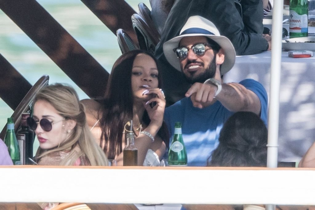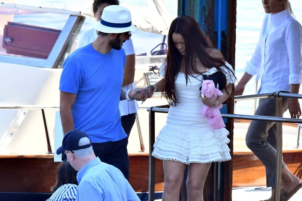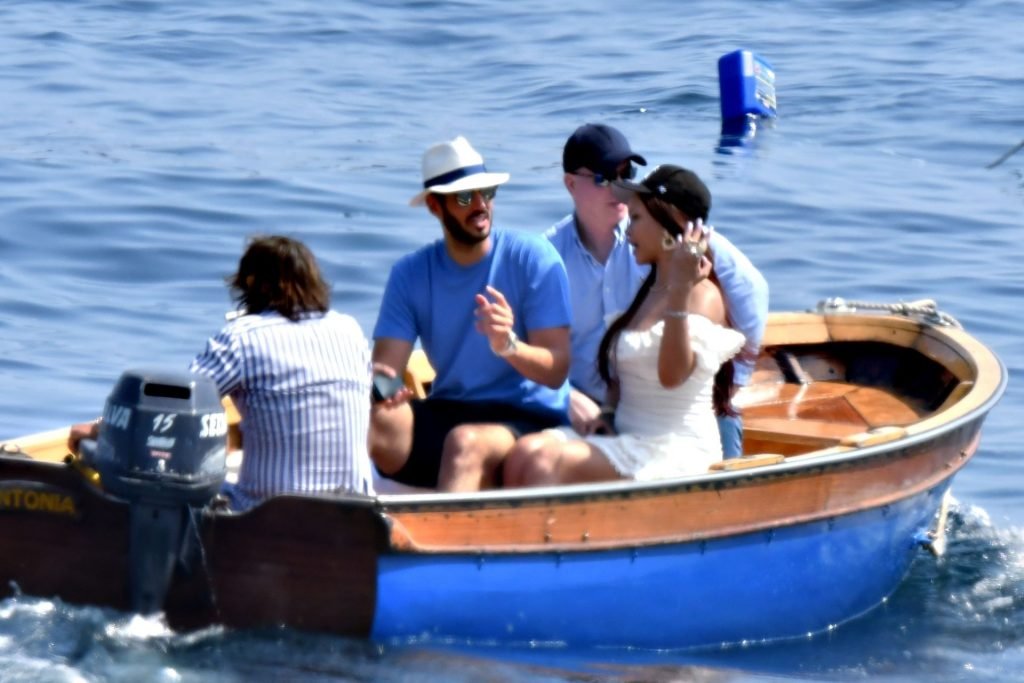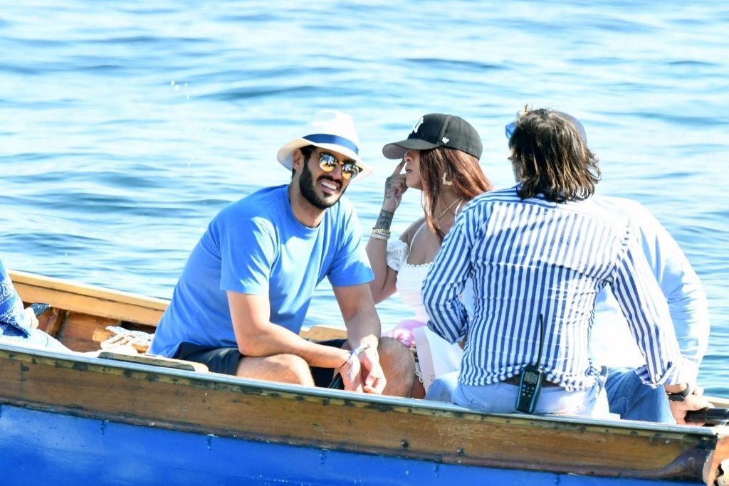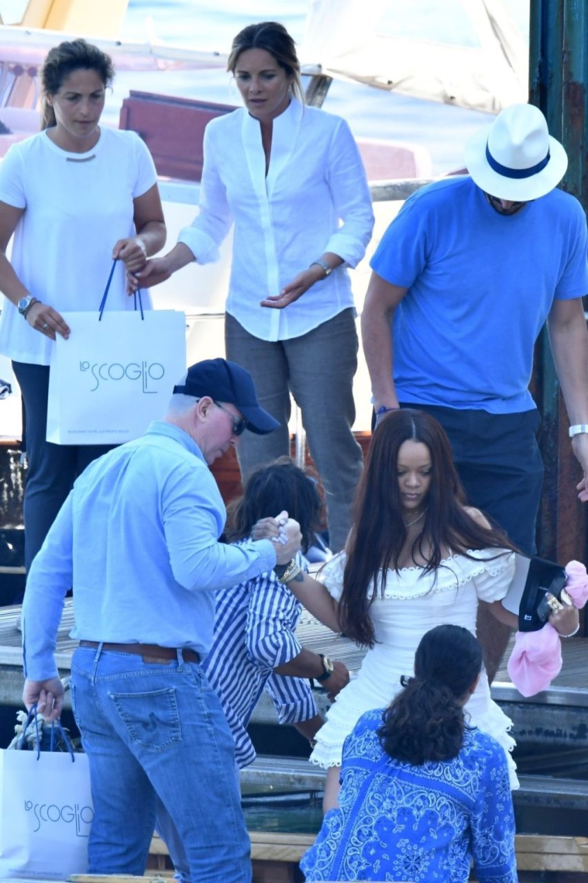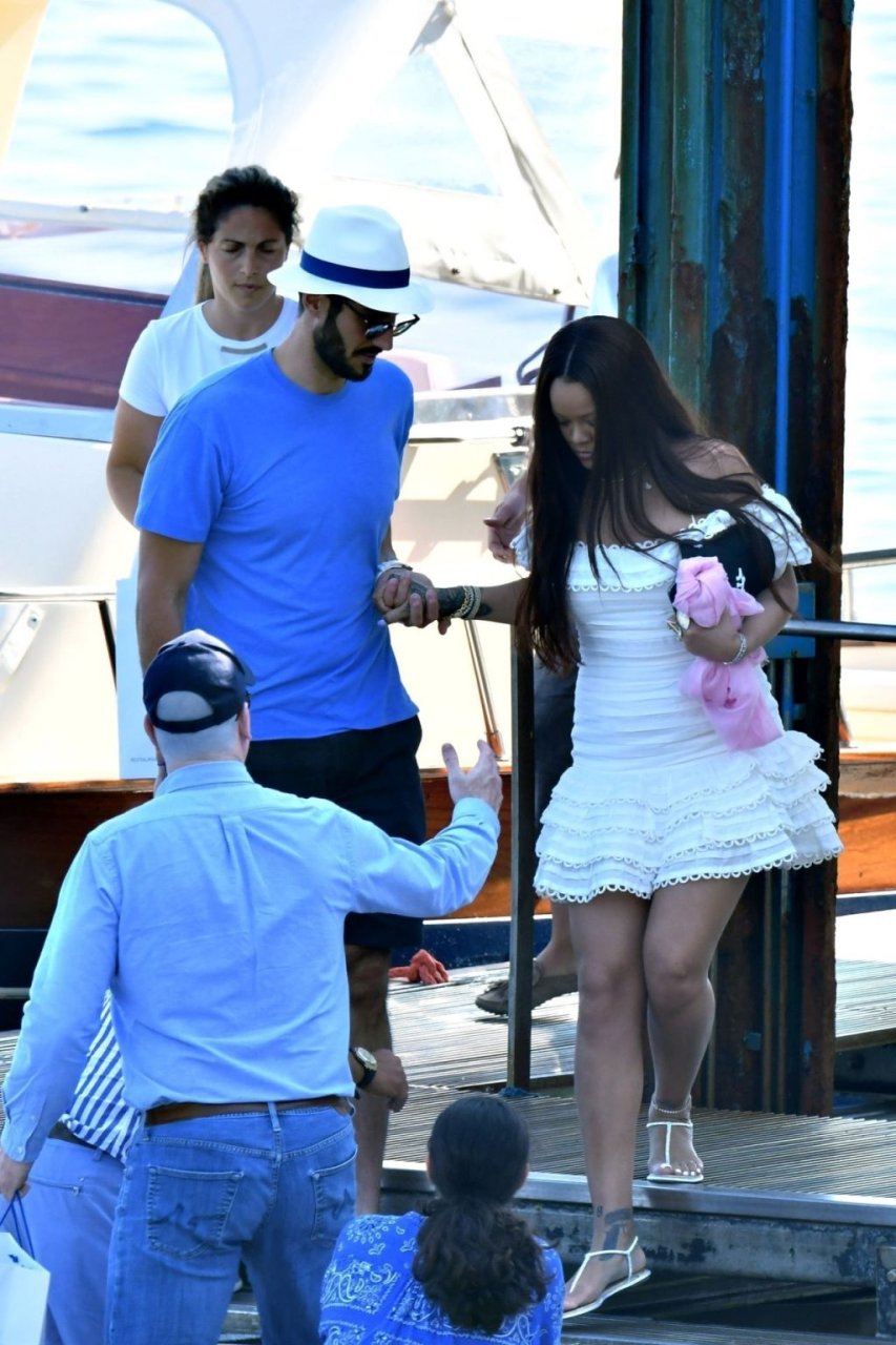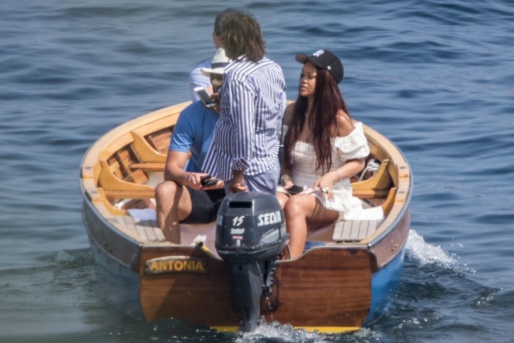 Rihanna e il suo fidanzato Hassan Jameel sono stati visti mostrare un’affettuosa e rara dimostrazione di affetto in pubblico mentre facevano un giro in barca e pranzavano insieme al “Lo Scoglio” a Nerano con un gruppo che si crede fosse la sua famiglia, 06/05/2019.