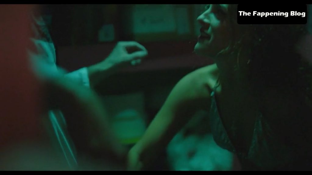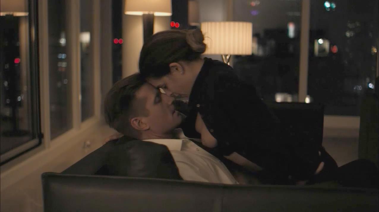 Riley Keough having sex with a guy on a leather sofa, her breasts pulled out of her bra as she rides him in his lap. After they finish, we see Riley standing in her underwear by a window, showing naked breasts.