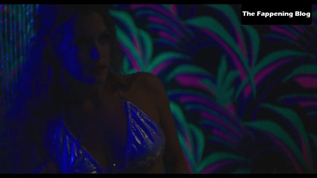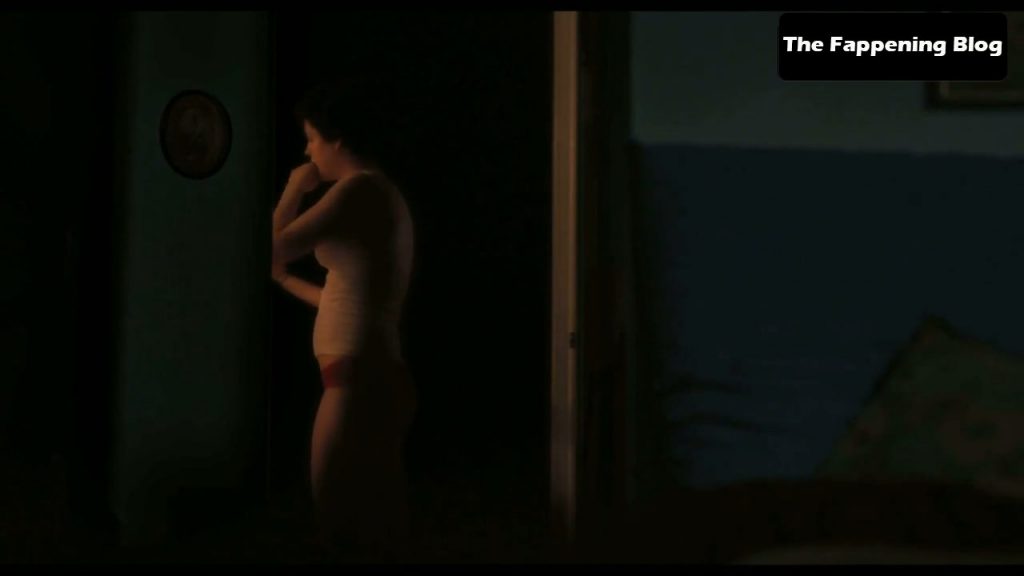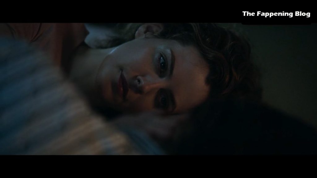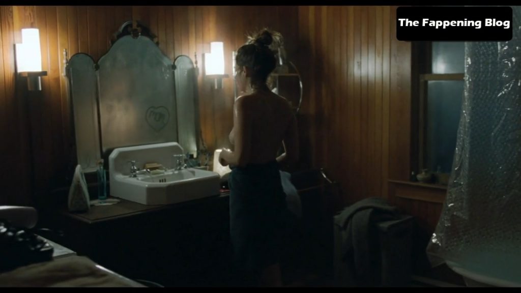 Riley Keough has seen nude in a darkly-lit sex scene with a guy, showing bare breasts. After they finish and the guy gets off the bed, we see a bit of Riley’s butt as she lies on her back with her hips turned, and then sits up to pull her knees to her chest.
