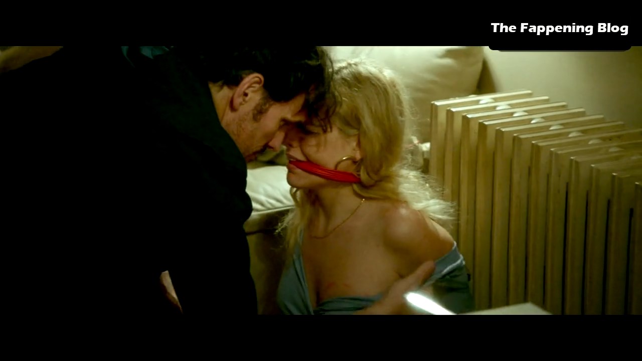 Sexy Riley Keough wearing an unbuttoned shirt that reveals her bra as she walks over to a guy who sitting on a couch. She then hikes her skirt up and shows her bare butt as the guy puts his arms around her and goes down on her. All this, while she stands in front of him. Next, we see Riley lying on the couch by herself, her hand down her panties as she masturbates.