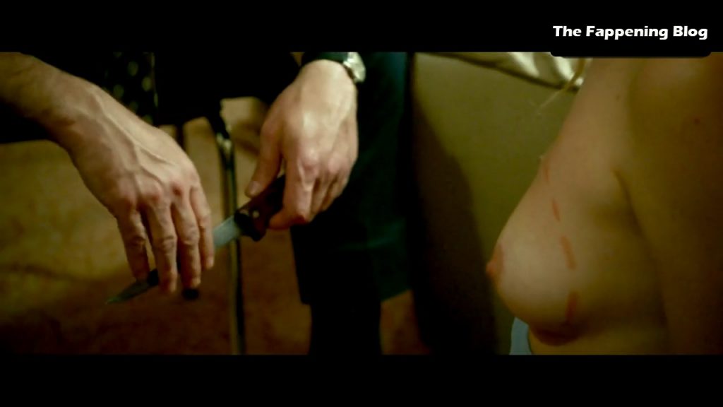 The killer takes down Riley’s top and inspects her round boobs while he playing with a knife. Careful there, buddy!