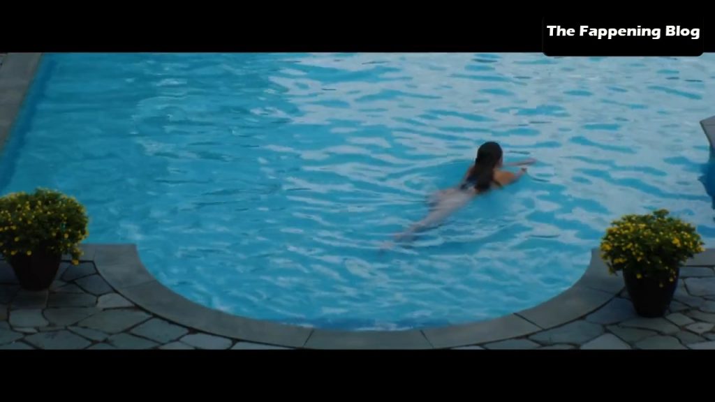 Riley is swimming nude in a pool, eventually breaking the surface of the water to reveal her rack, plus a quick look at her ass as she swims away!