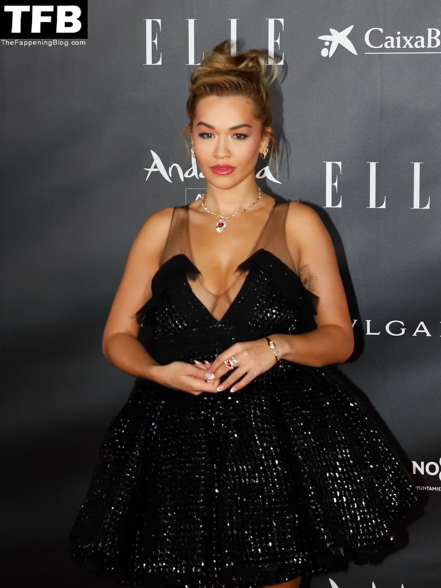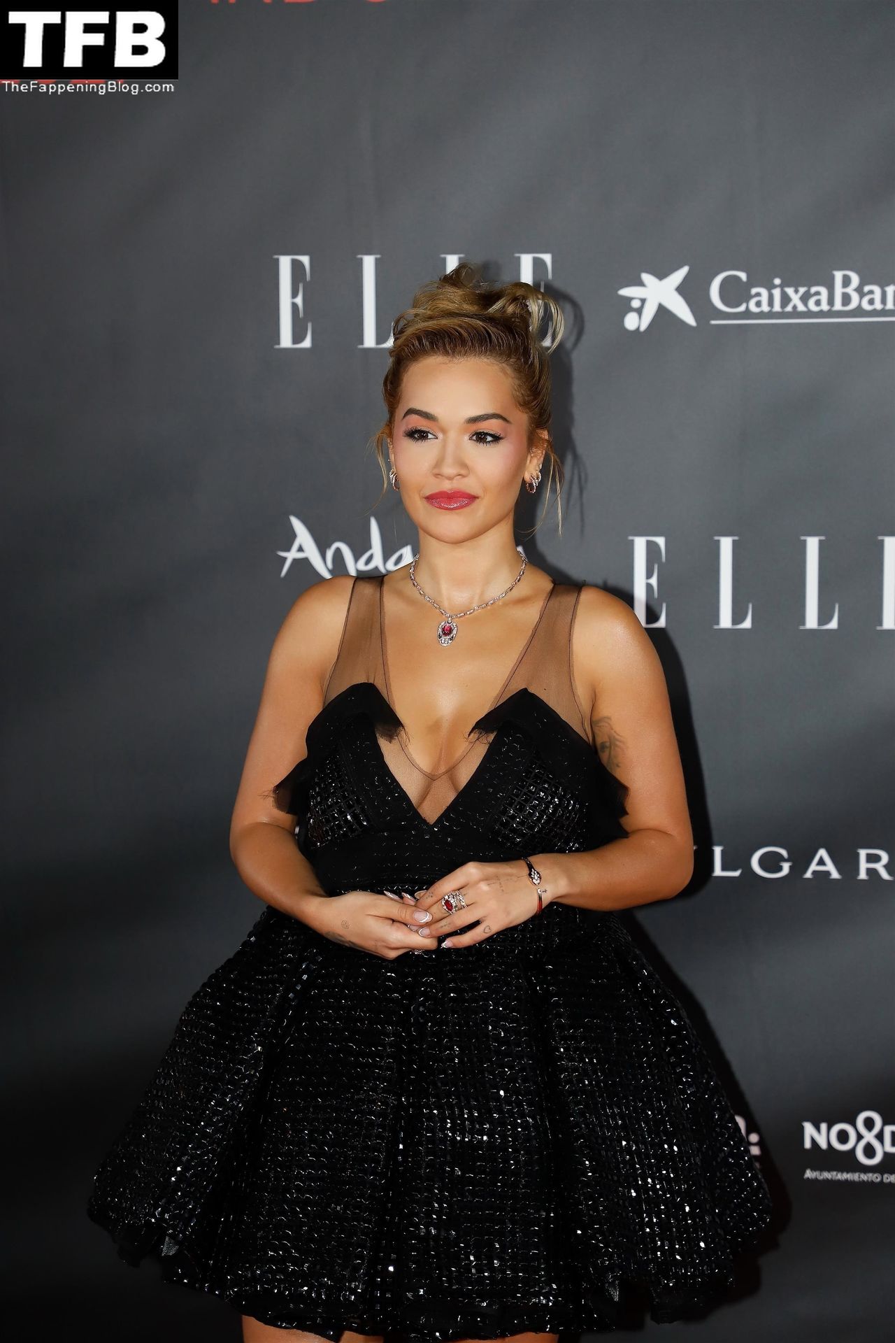 La cantante Rita Ora appare sensuale in un vestito nero con una scollatura profonda mentre posa sul red carpet del Gala degli ELLE Style Awards 2021 a Siviglia, 28/10/2021.