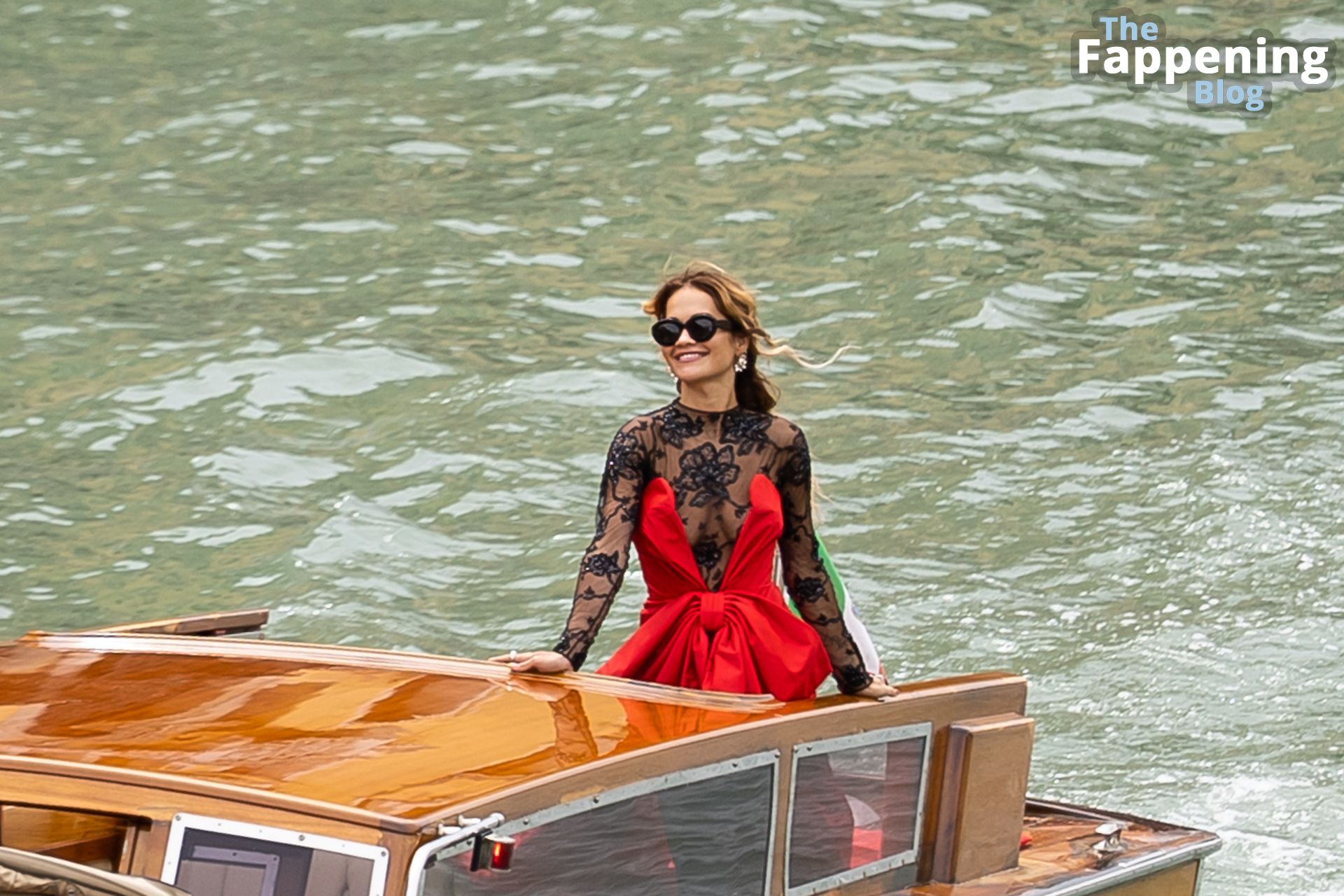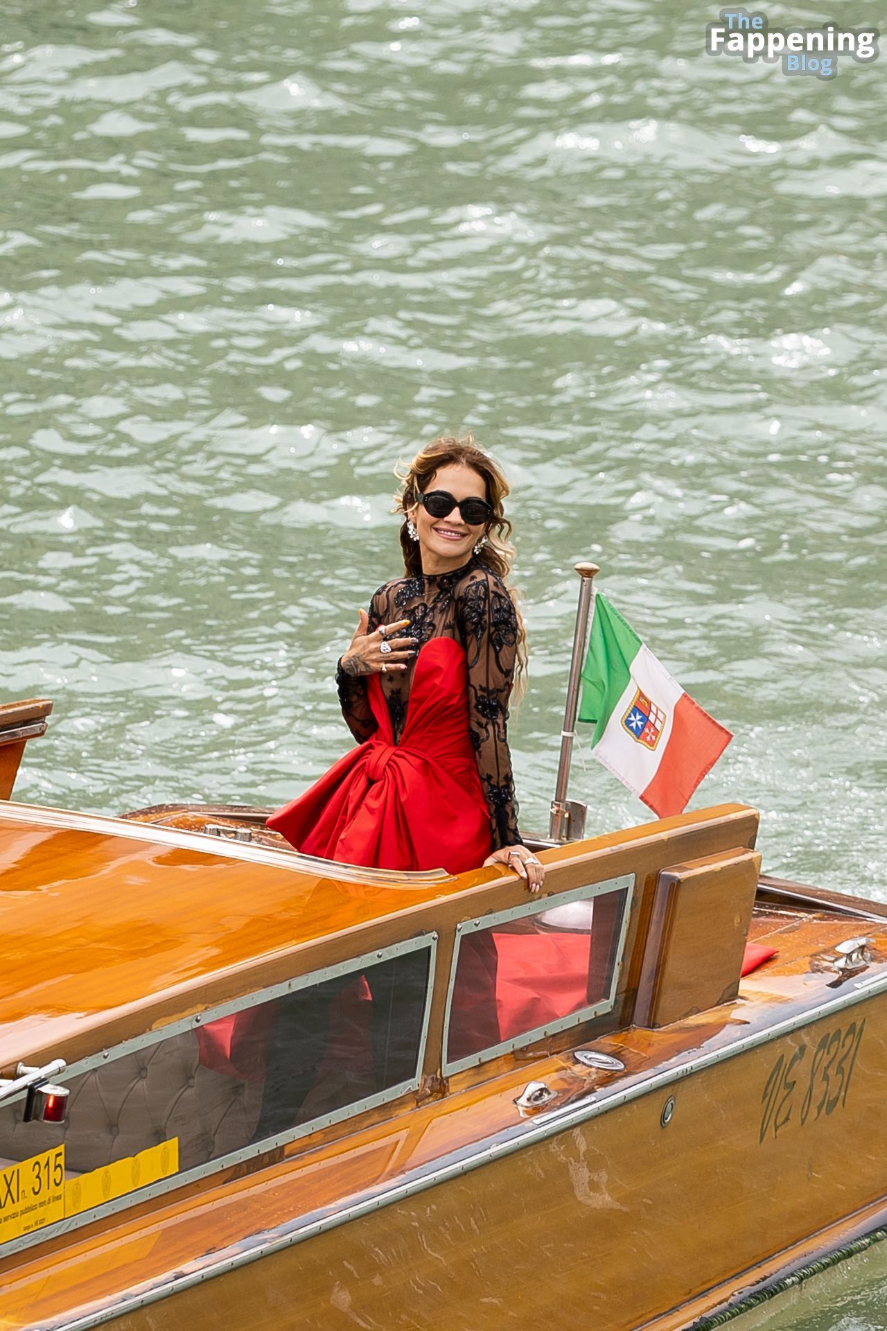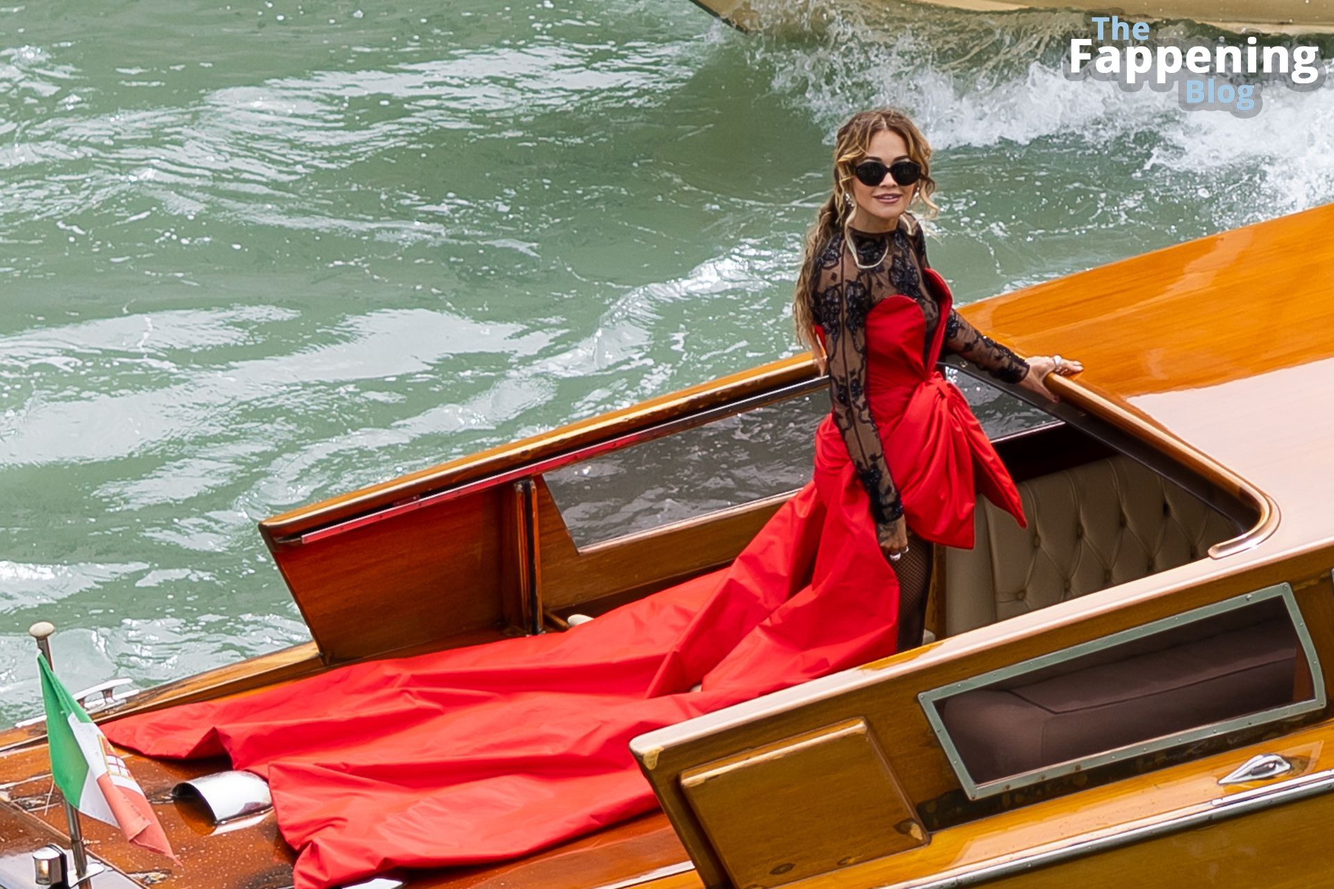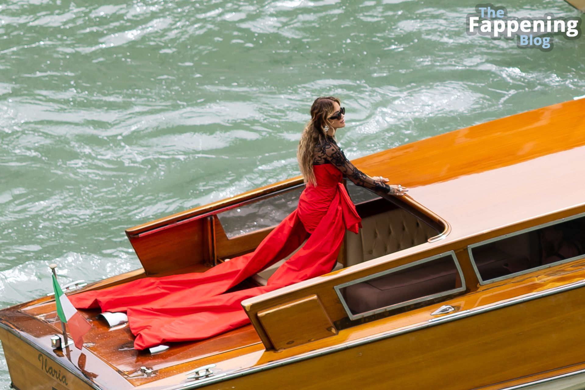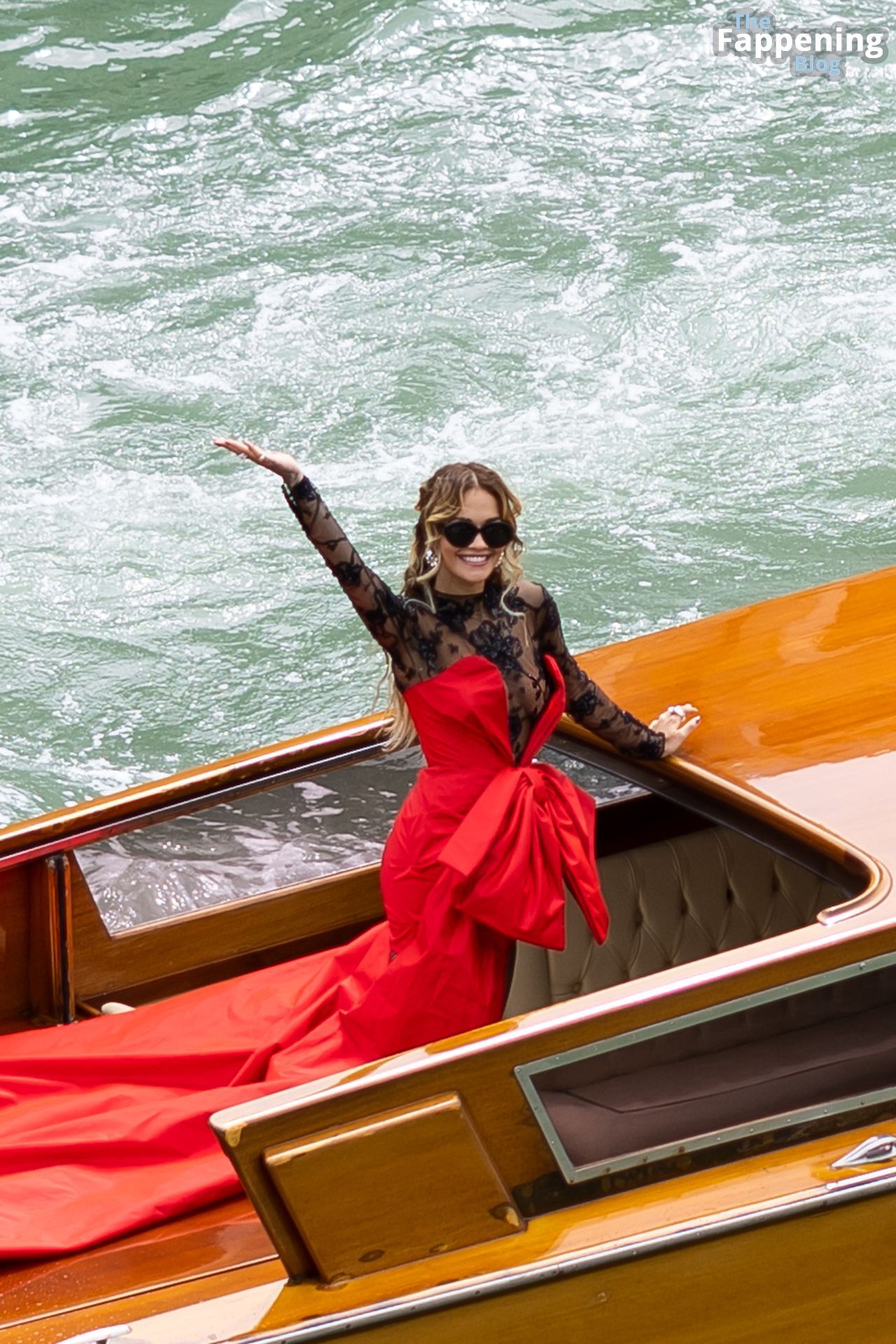 Rita Ora sfoggia un lungo abito rosso Moschino mentre si dirige verso una barca a Venezia, la sua stylist l’ha aiutata sulla barca e poi ha scattato alcune foto veloci, 30/08/2023.