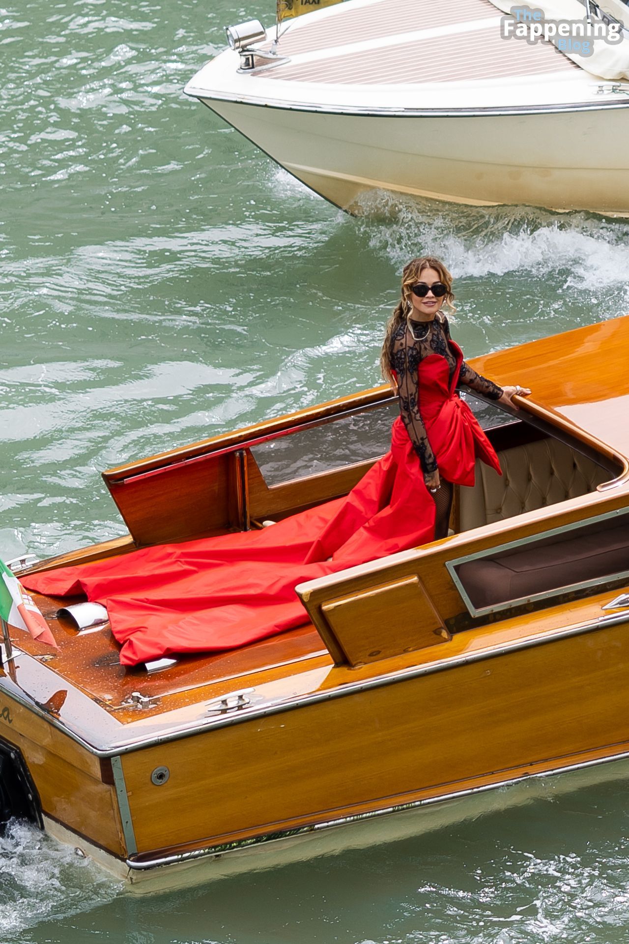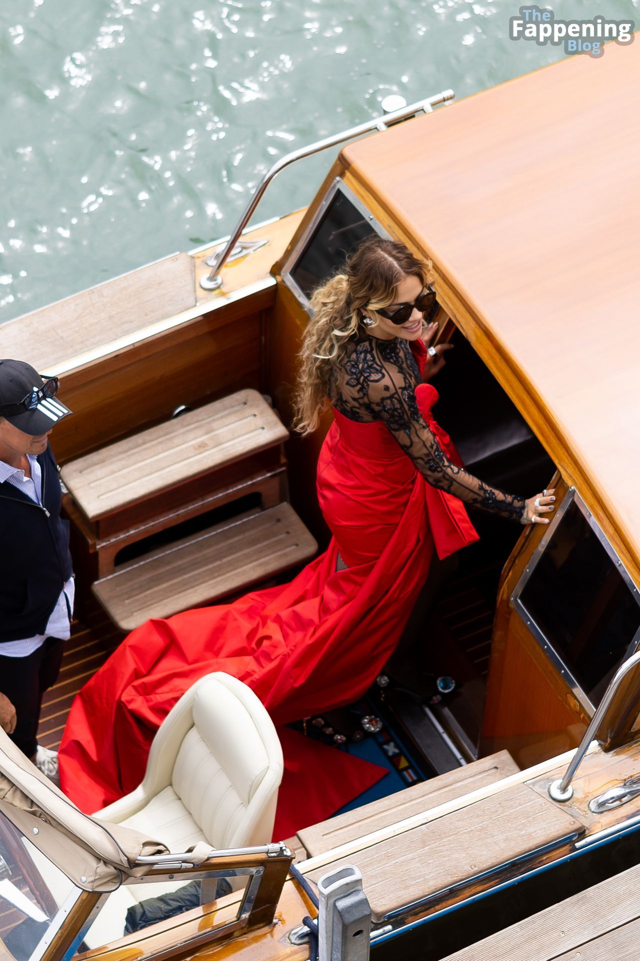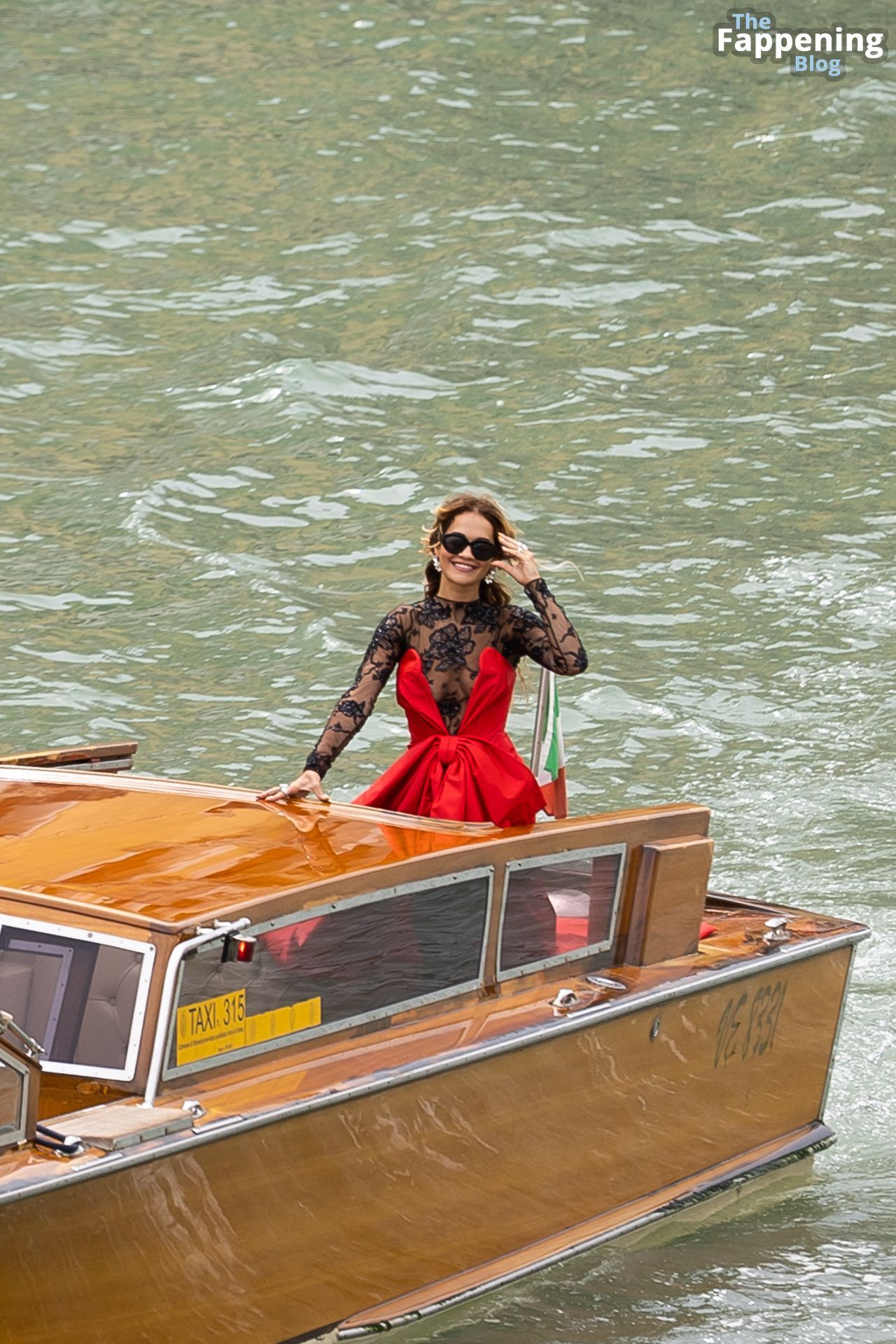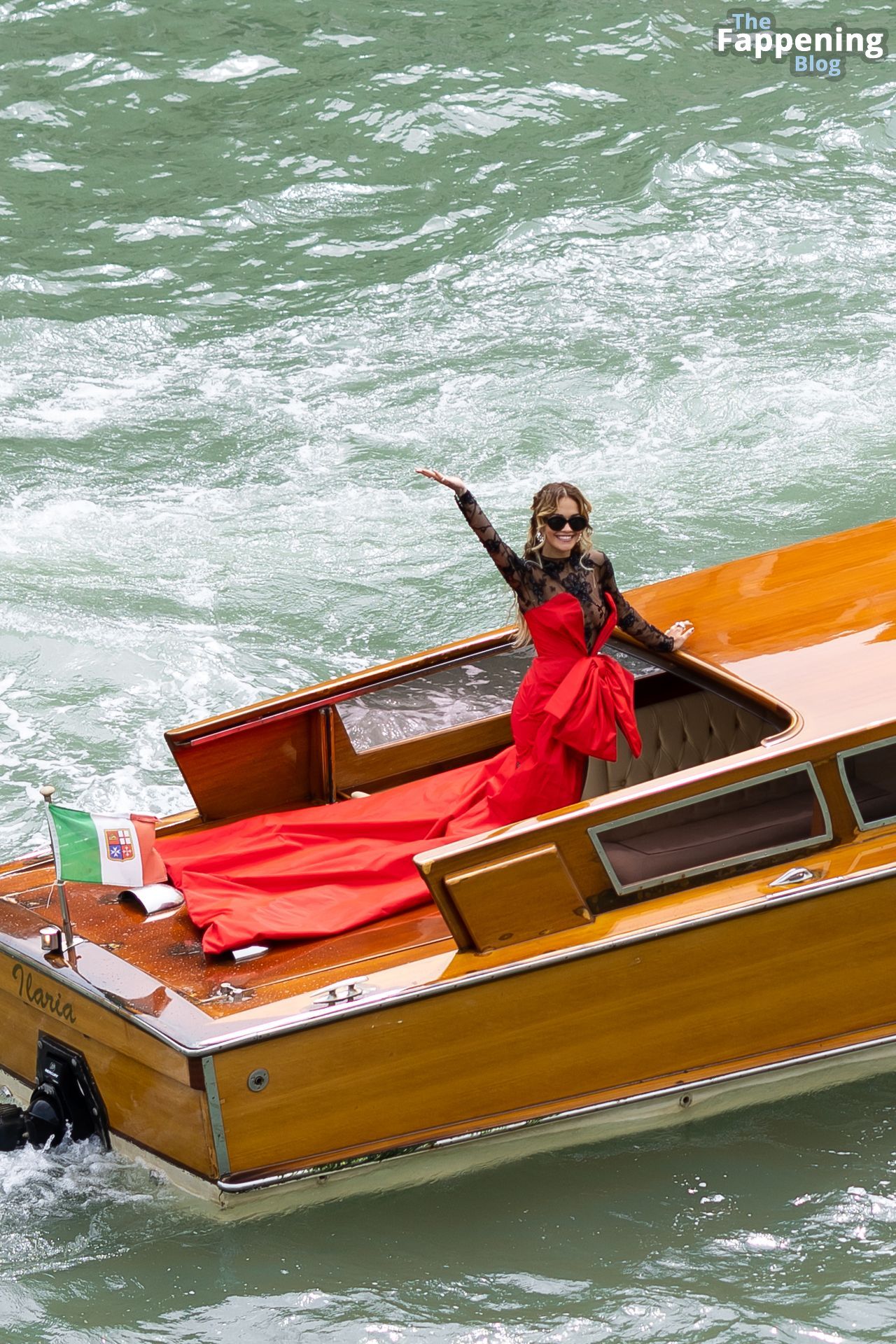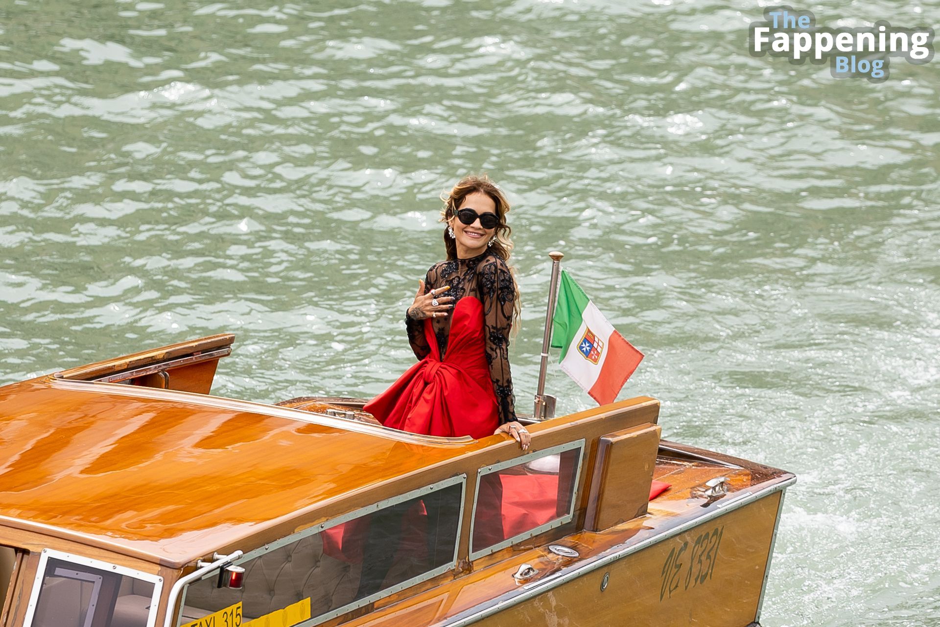 Rita Ora sfoggia un lungo abito rosso Moschino mentre si dirige verso una barca a Venezia, la sua stylist l’ha aiutata sulla barca e poi ha scattato alcune foto veloci, 30/08/2023.