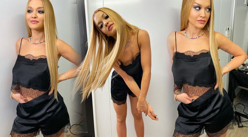 La cantante Rita Ora mostra il suo corpo sexy posando con un pigiama nero a due pezzi – Instagram, 28/03/2021.