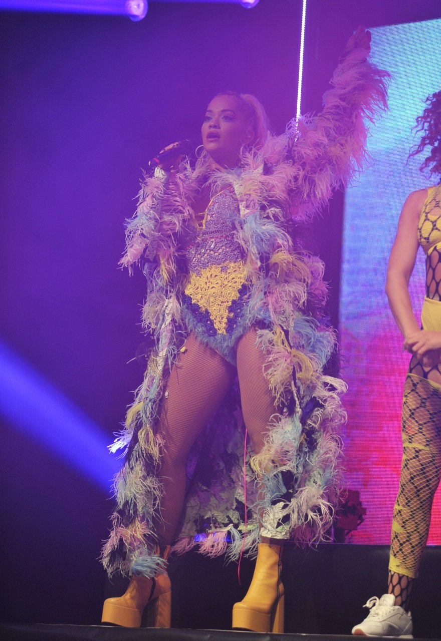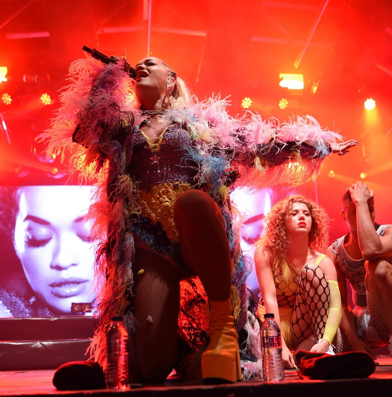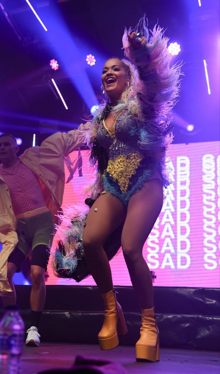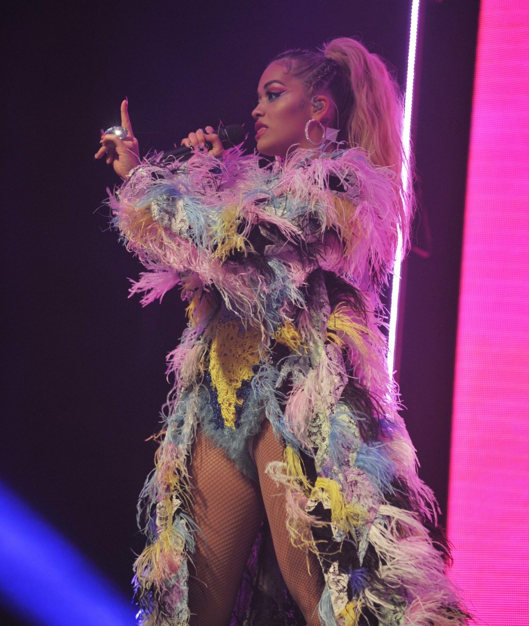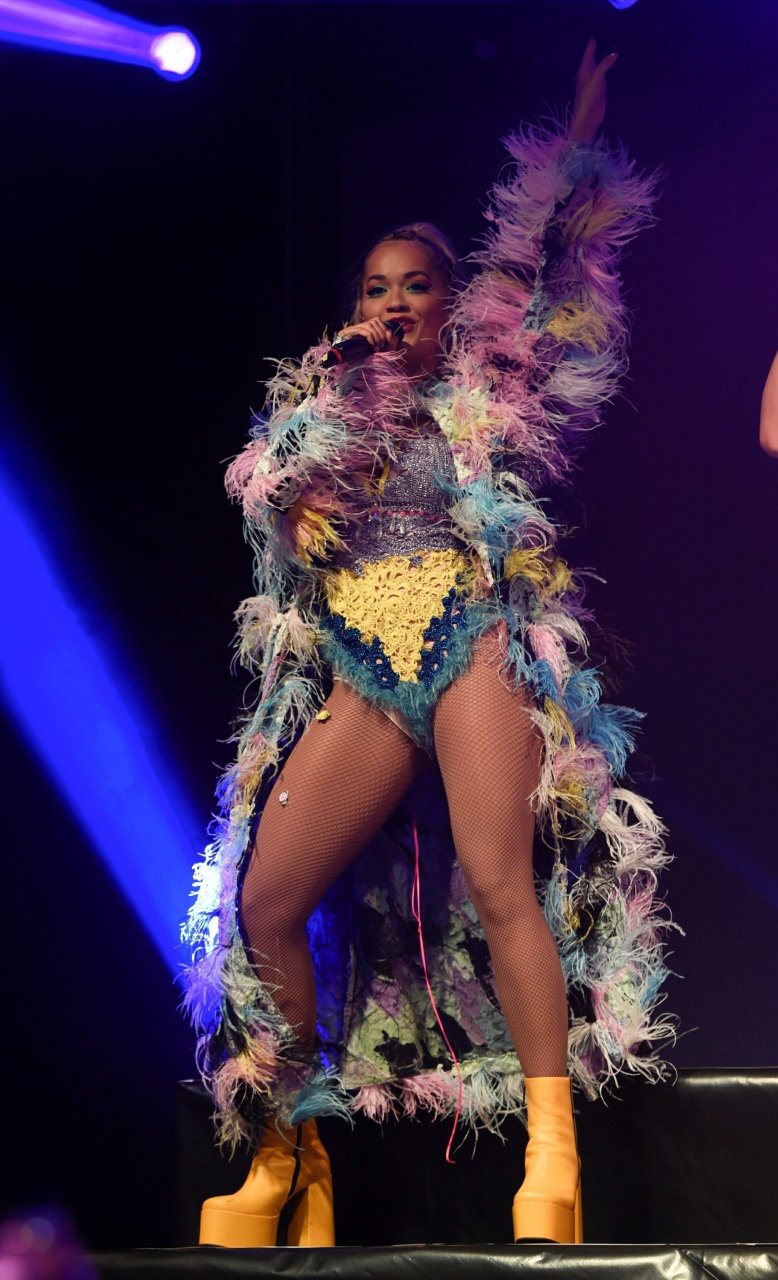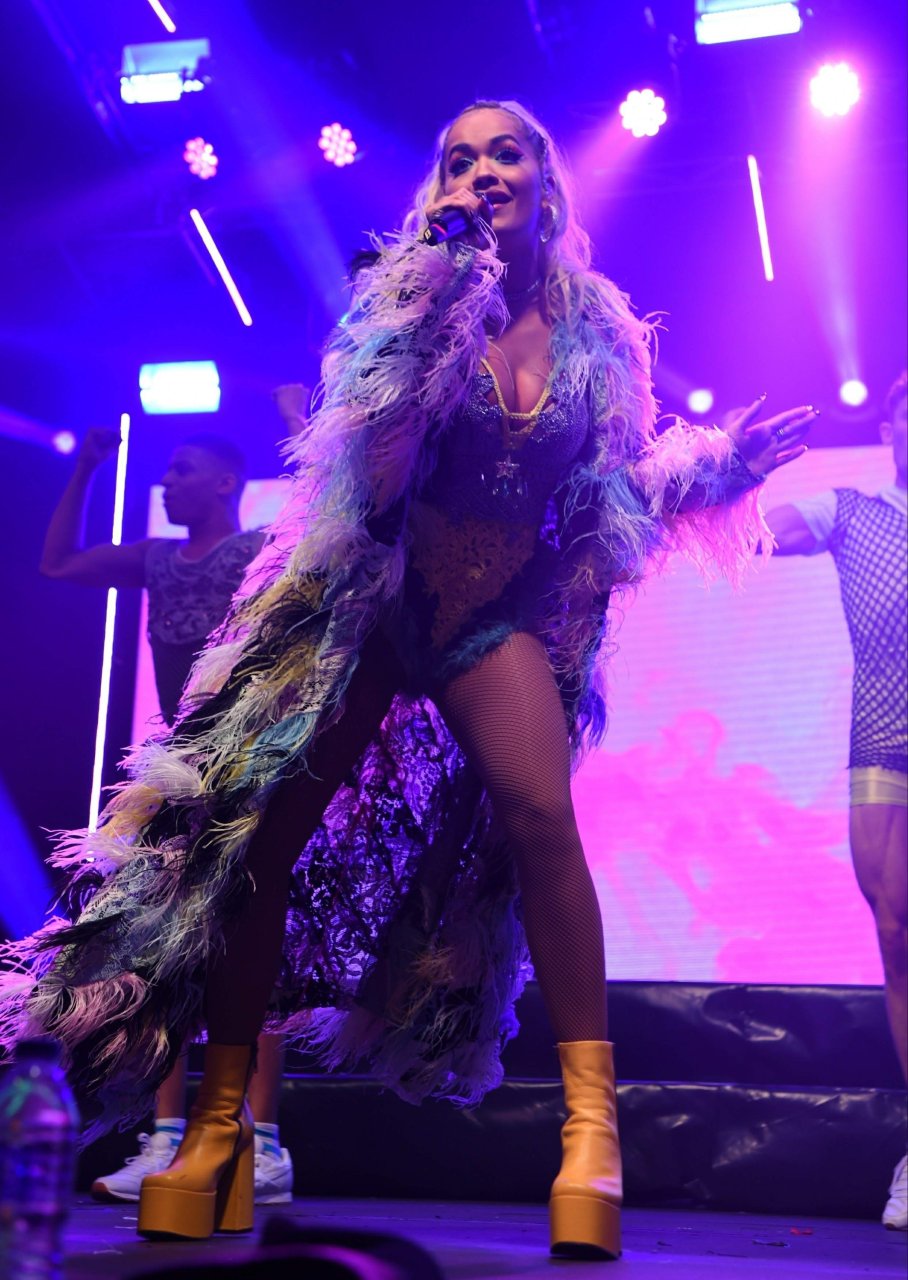 Rita Ora si esibisce sul Main Stage al Big Weekend 2018 di Manchester Pride a Londra, 26/08/2018. La cantante britannica di 27 anni ha scelto un outfit con piume e collant a rete.