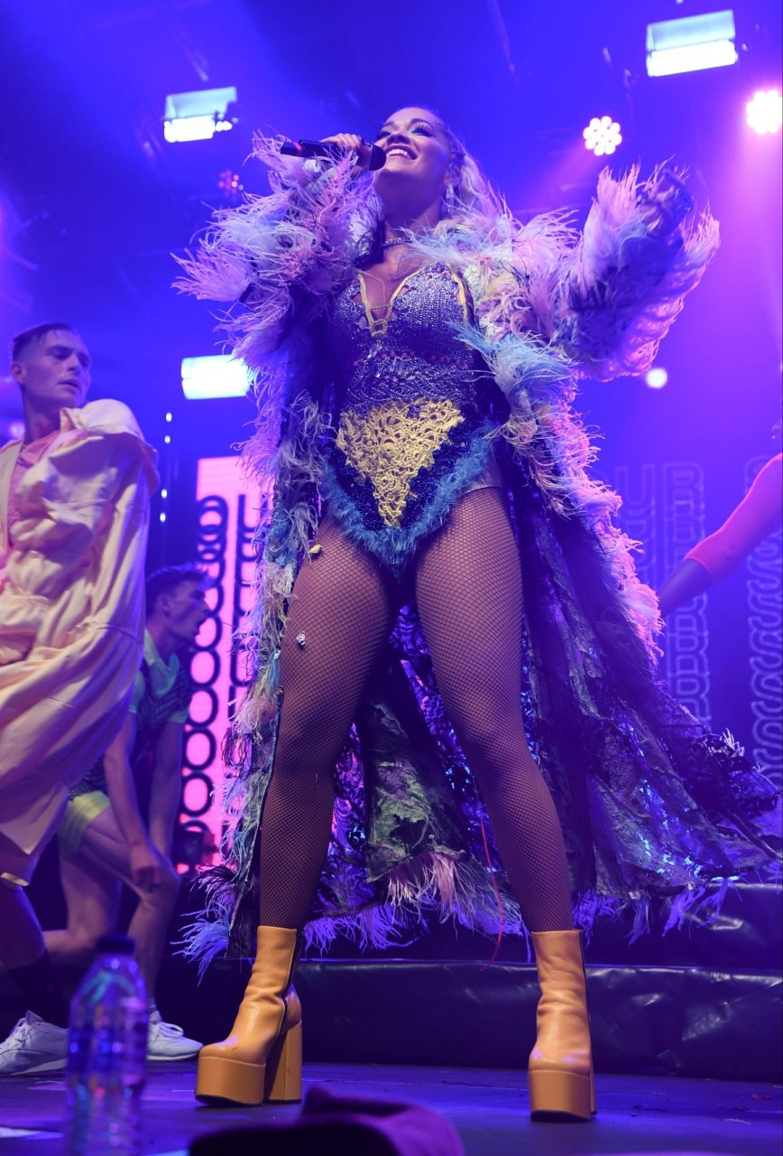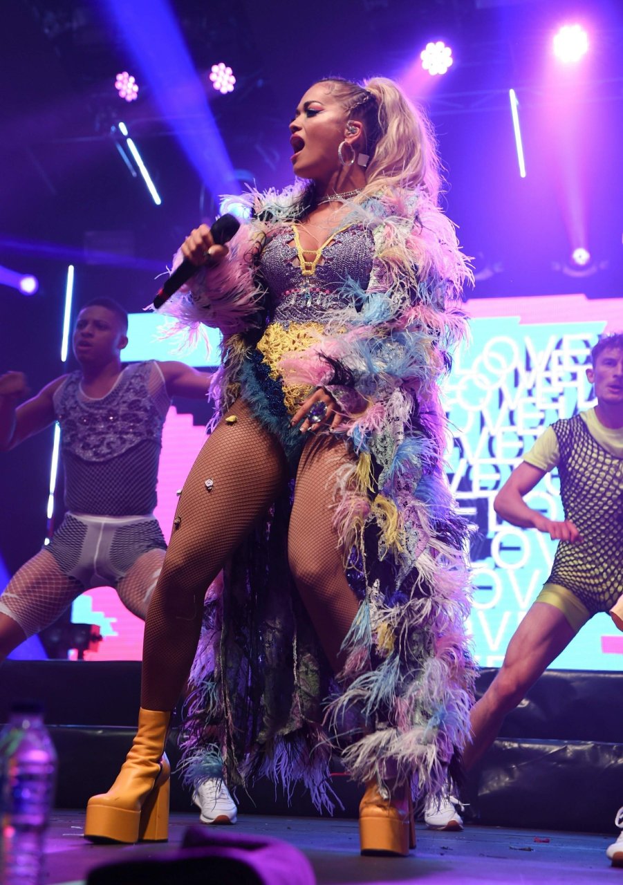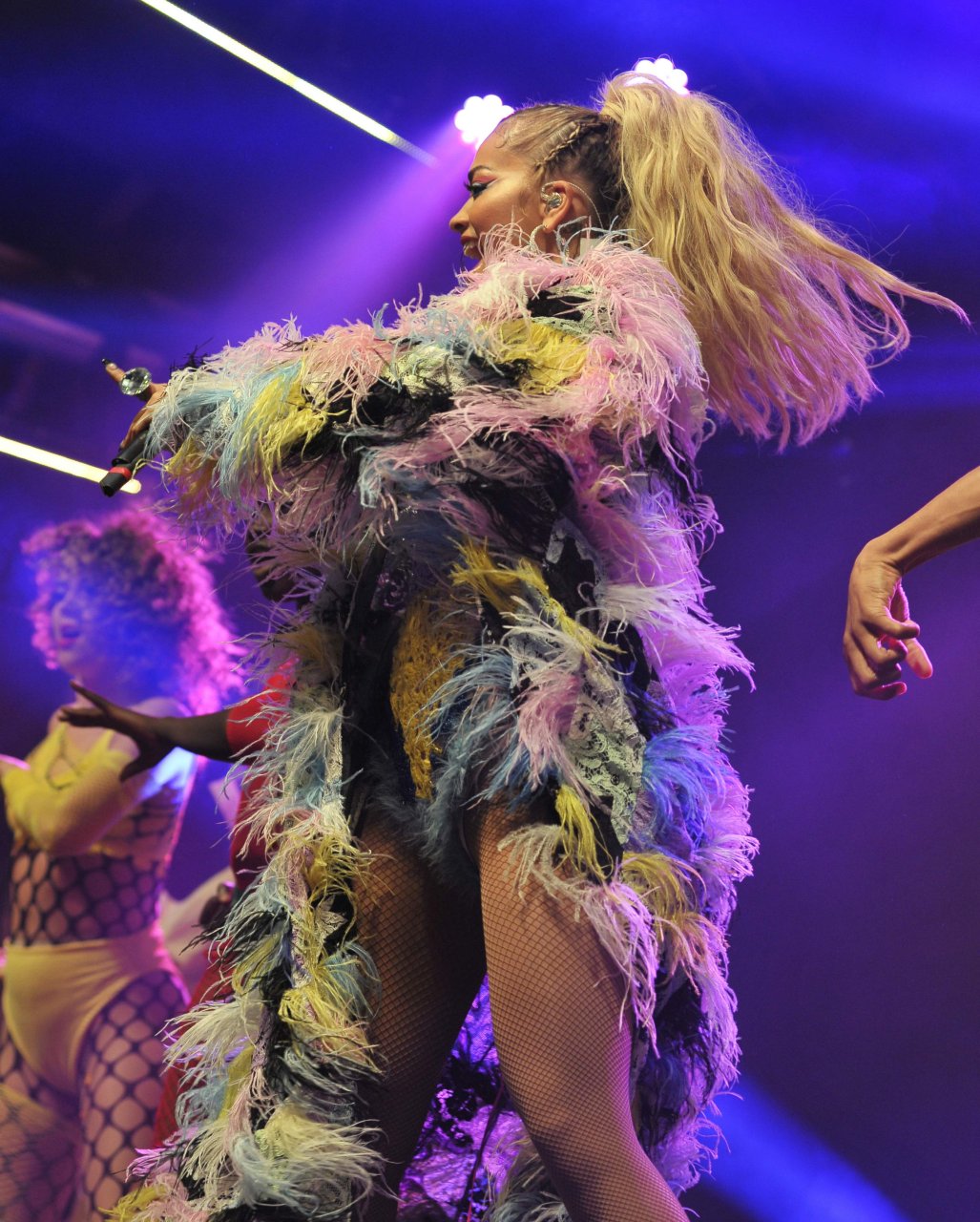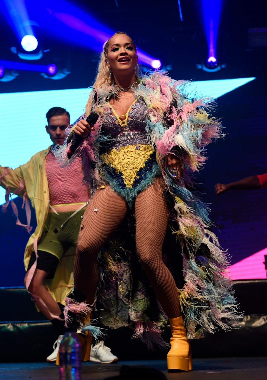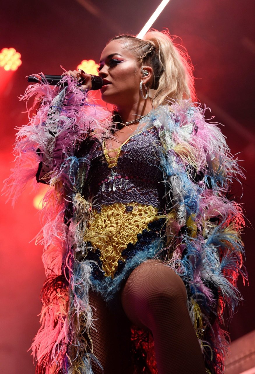 Rita Ora si esibisce sul Main Stage al Big Weekend 2018 di Manchester Pride a Londra, 26/08/2018. La cantante britannica di 27 anni ha scelto un outfit con piume e collant a rete.