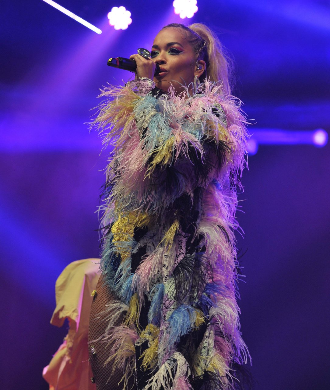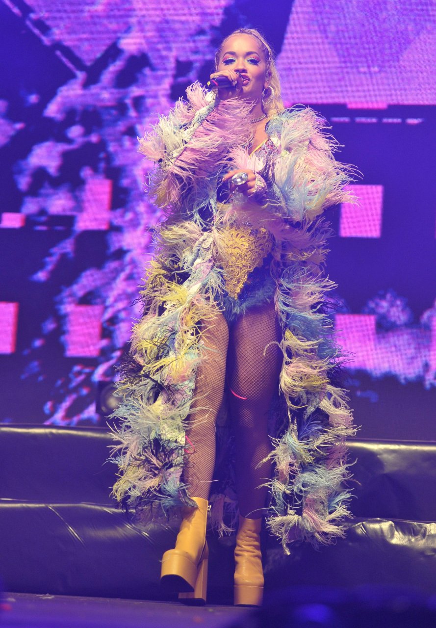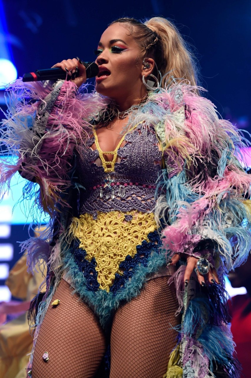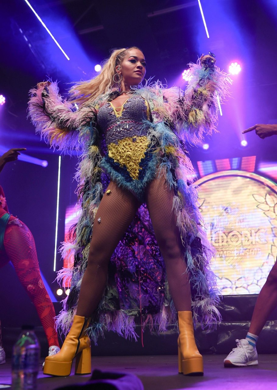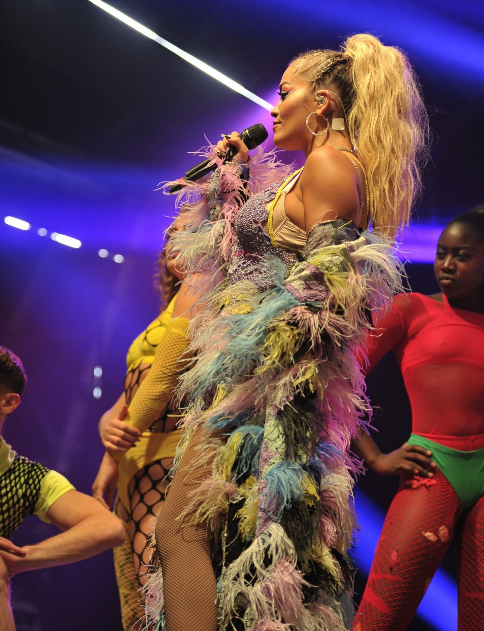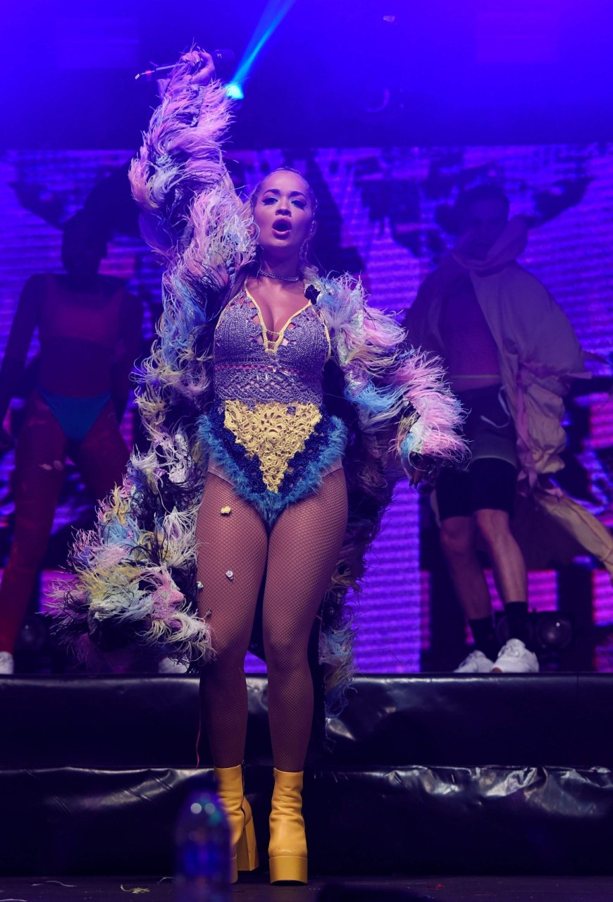 Rita Ora si esibisce sul Main Stage al Big Weekend 2018 di Manchester Pride a Londra, 26/08/2018. La cantante britannica di 27 anni ha scelto un outfit con piume e collant a rete.