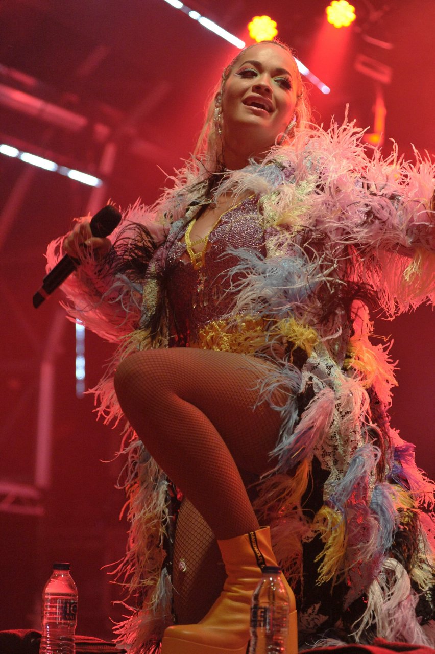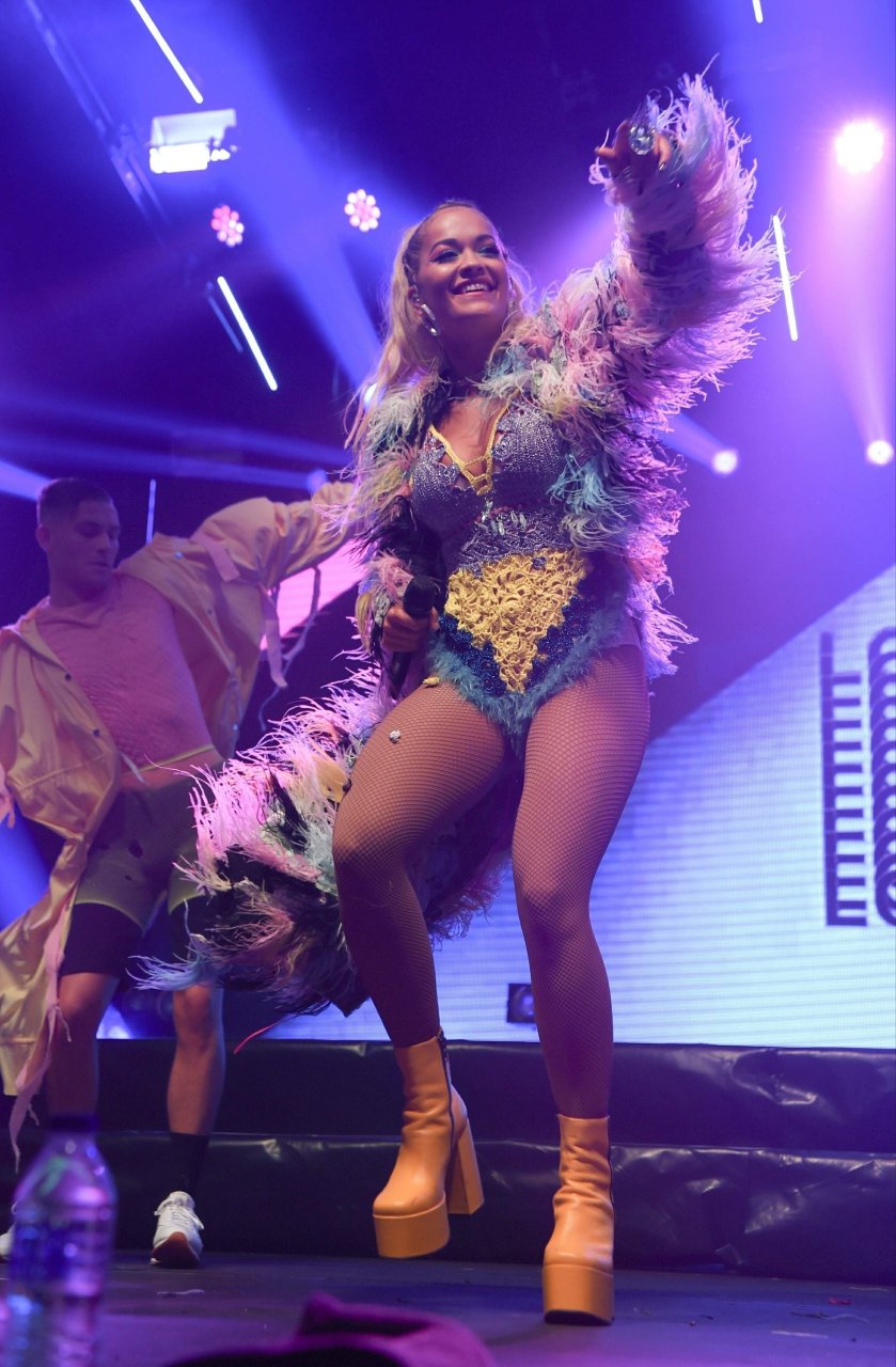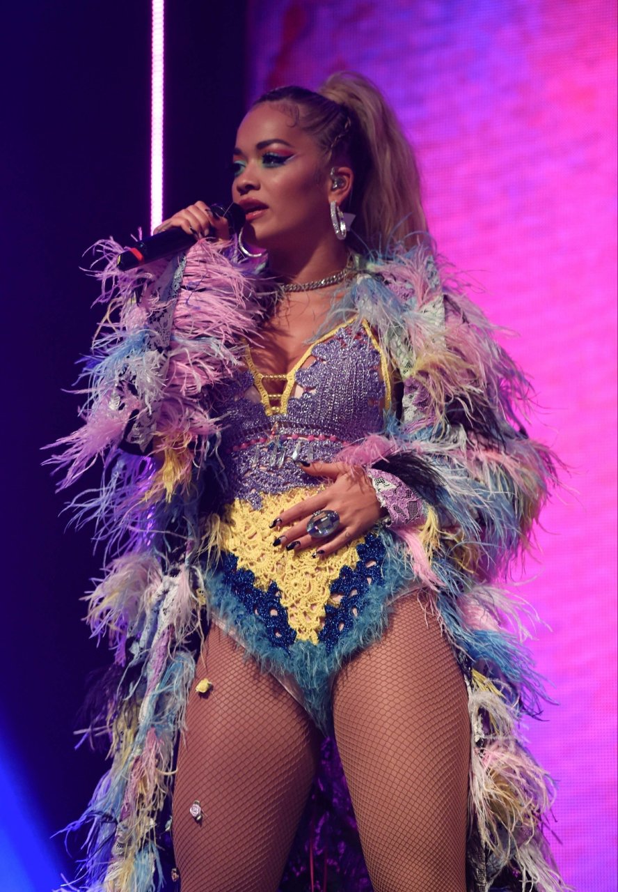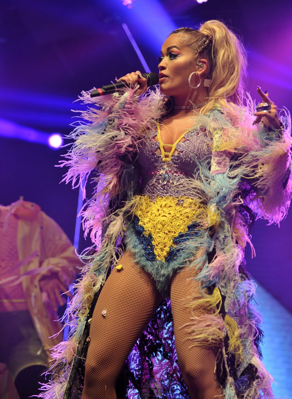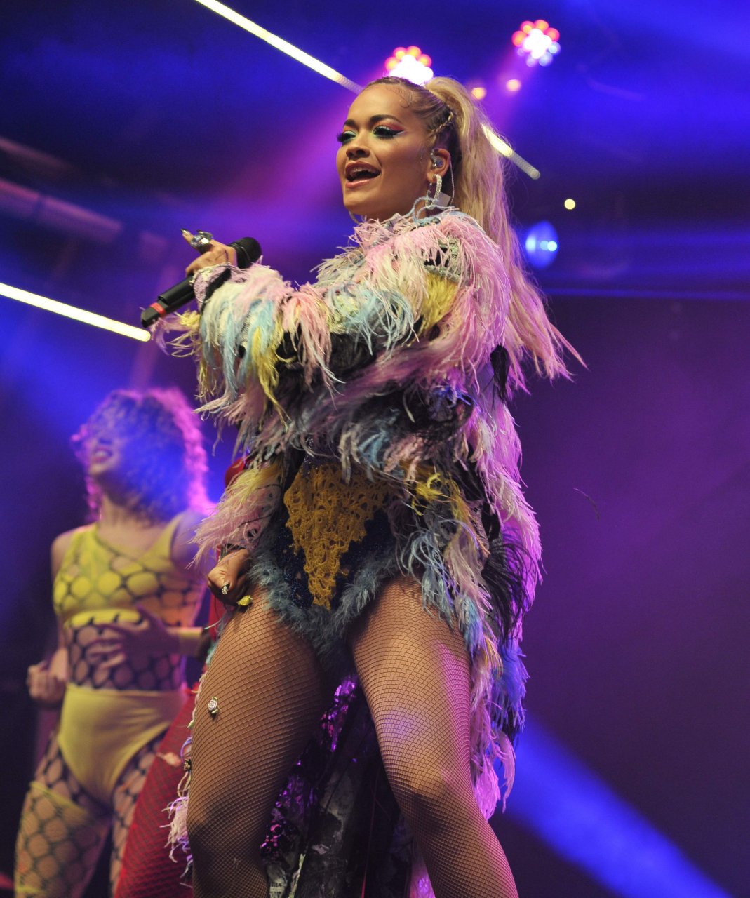Rita Ora si esibisce sul Main Stage al Big Weekend 2018 di Manchester Pride a Londra, 26/08/2018. La cantante britannica di 27 anni ha scelto un outfit con piume e collant a rete.