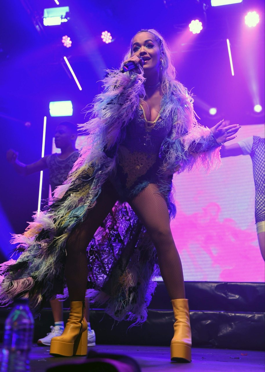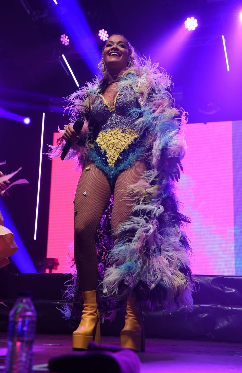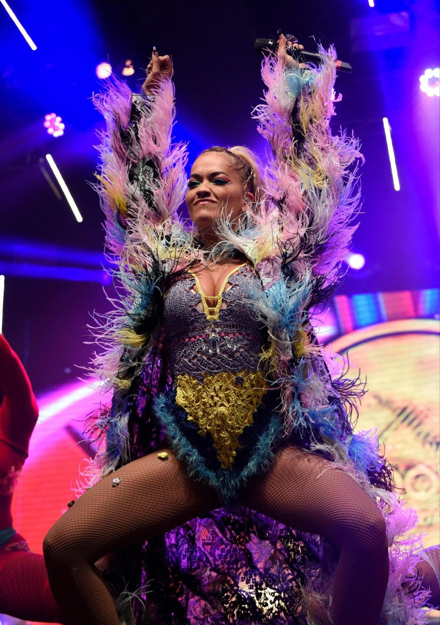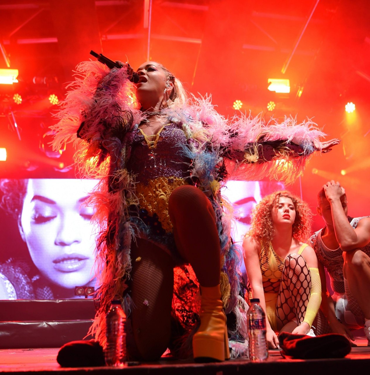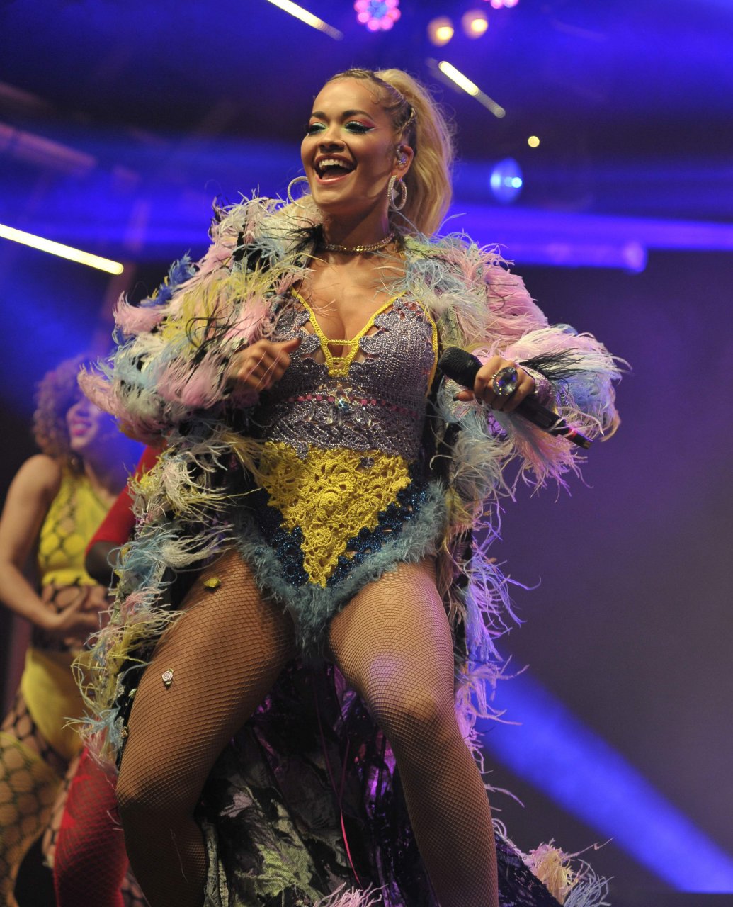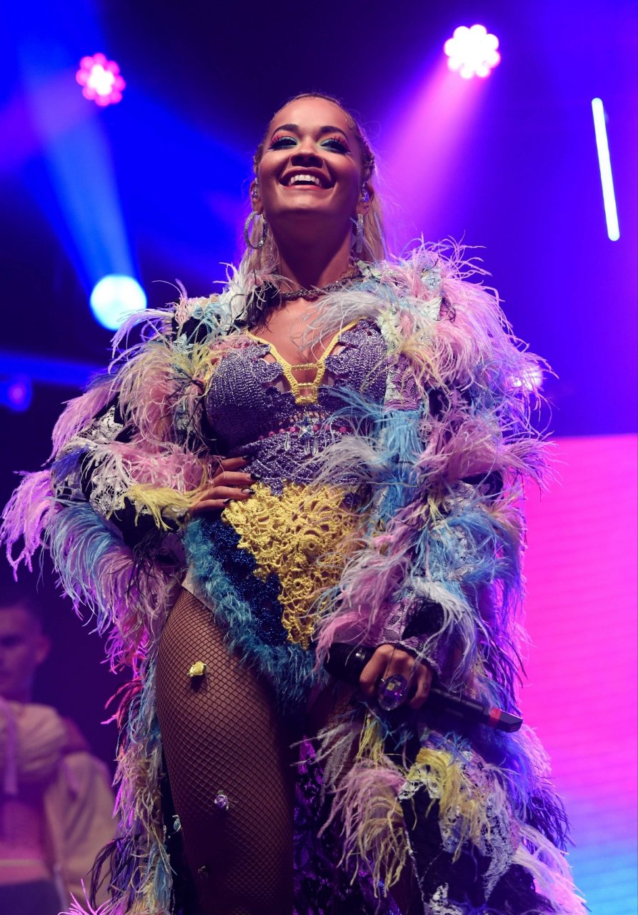 Rita Ora si esibisce sul Main Stage al Big Weekend 2018 di Manchester Pride a Londra, 26/08/2018. La cantante britannica di 27 anni ha scelto un outfit con piume e collant a rete.