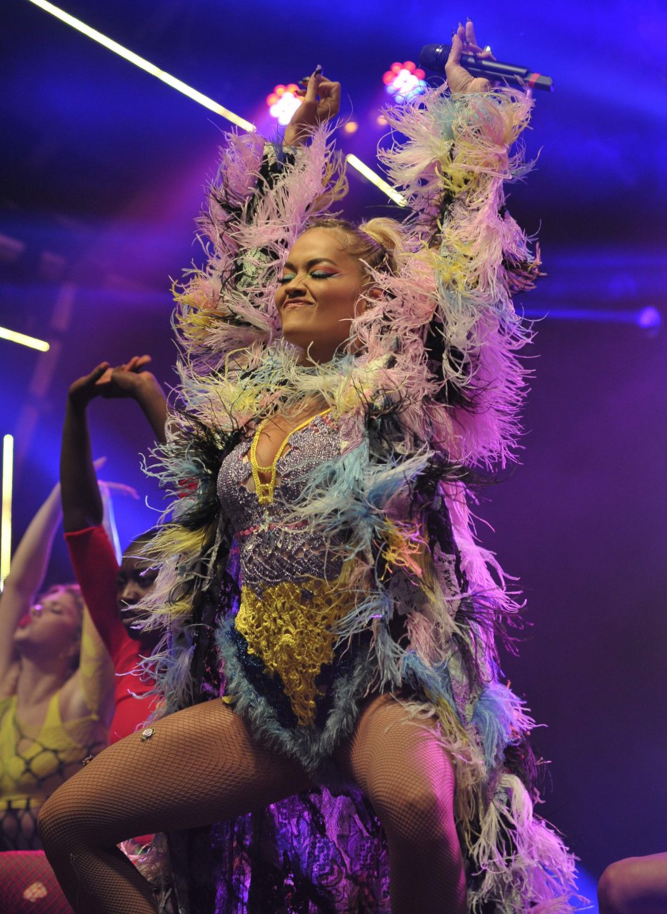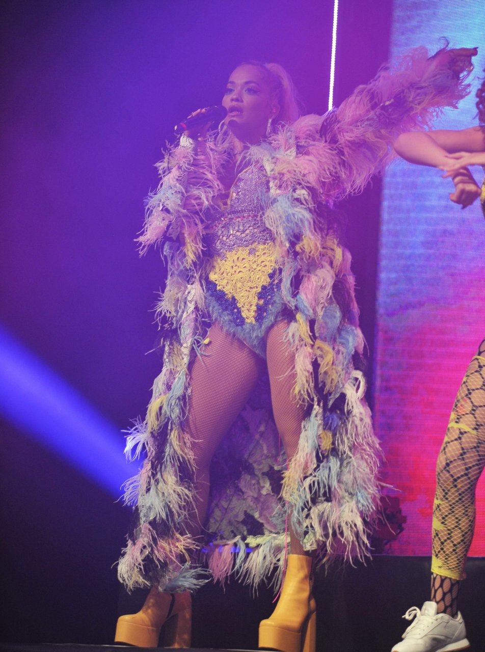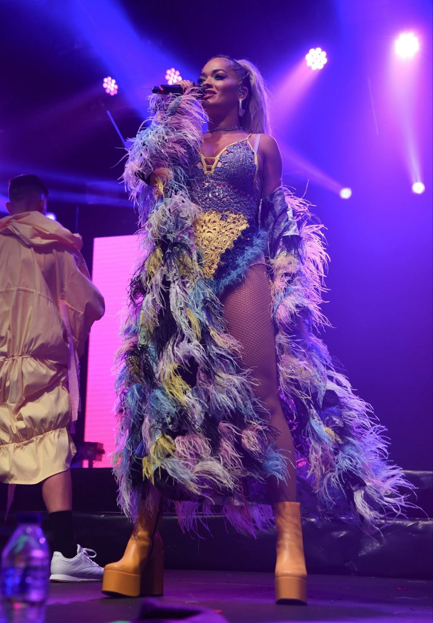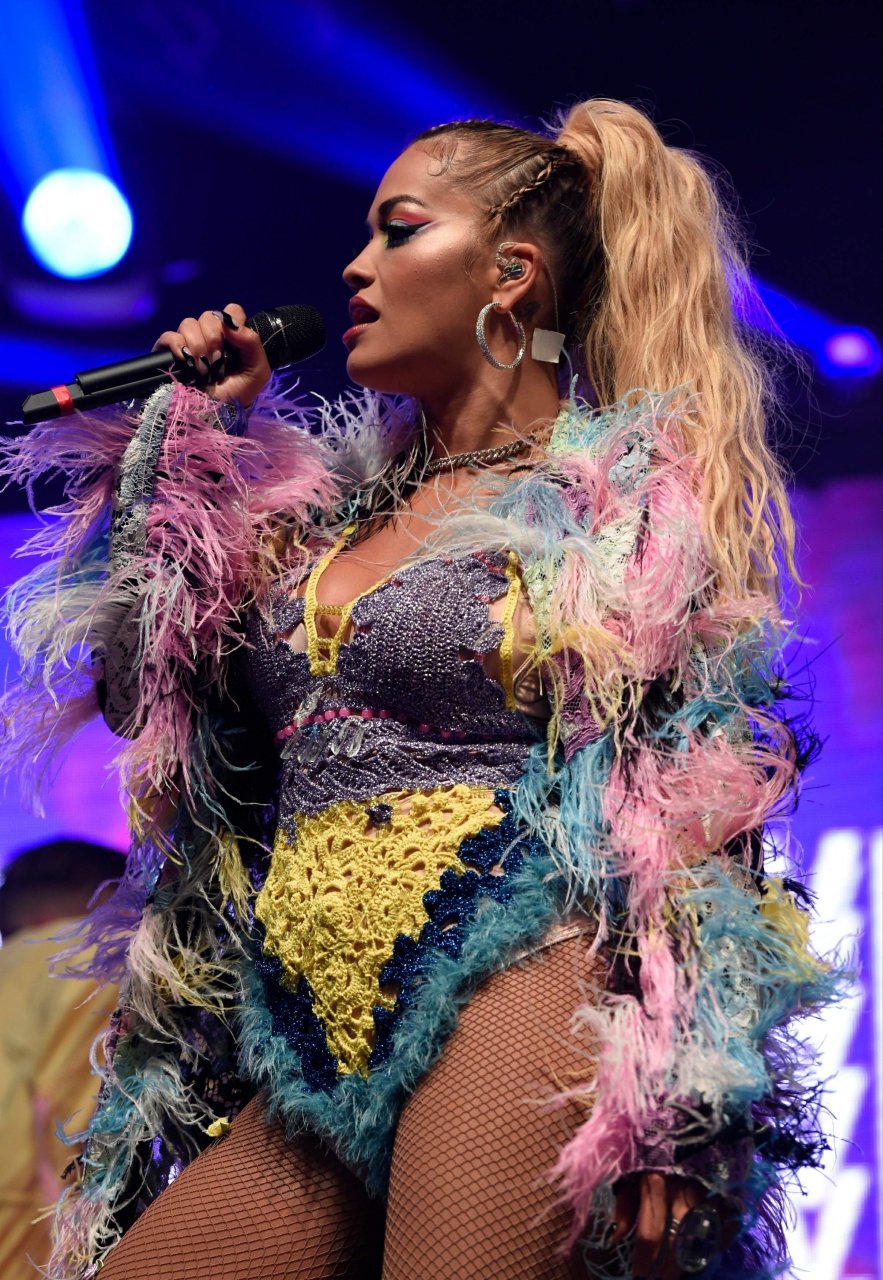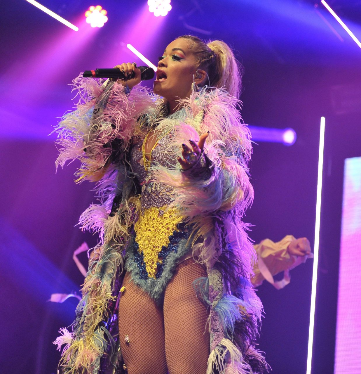 Rita Ora si esibisce sul Main Stage al Big Weekend 2018 di Manchester Pride a Londra, 26/08/2018. La cantante britannica di 27 anni ha scelto un outfit con piume e collant a rete.