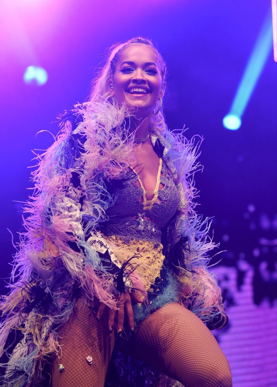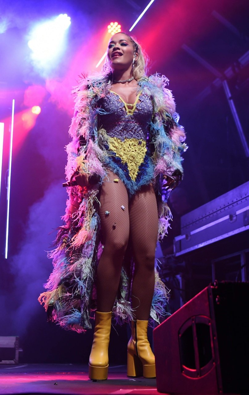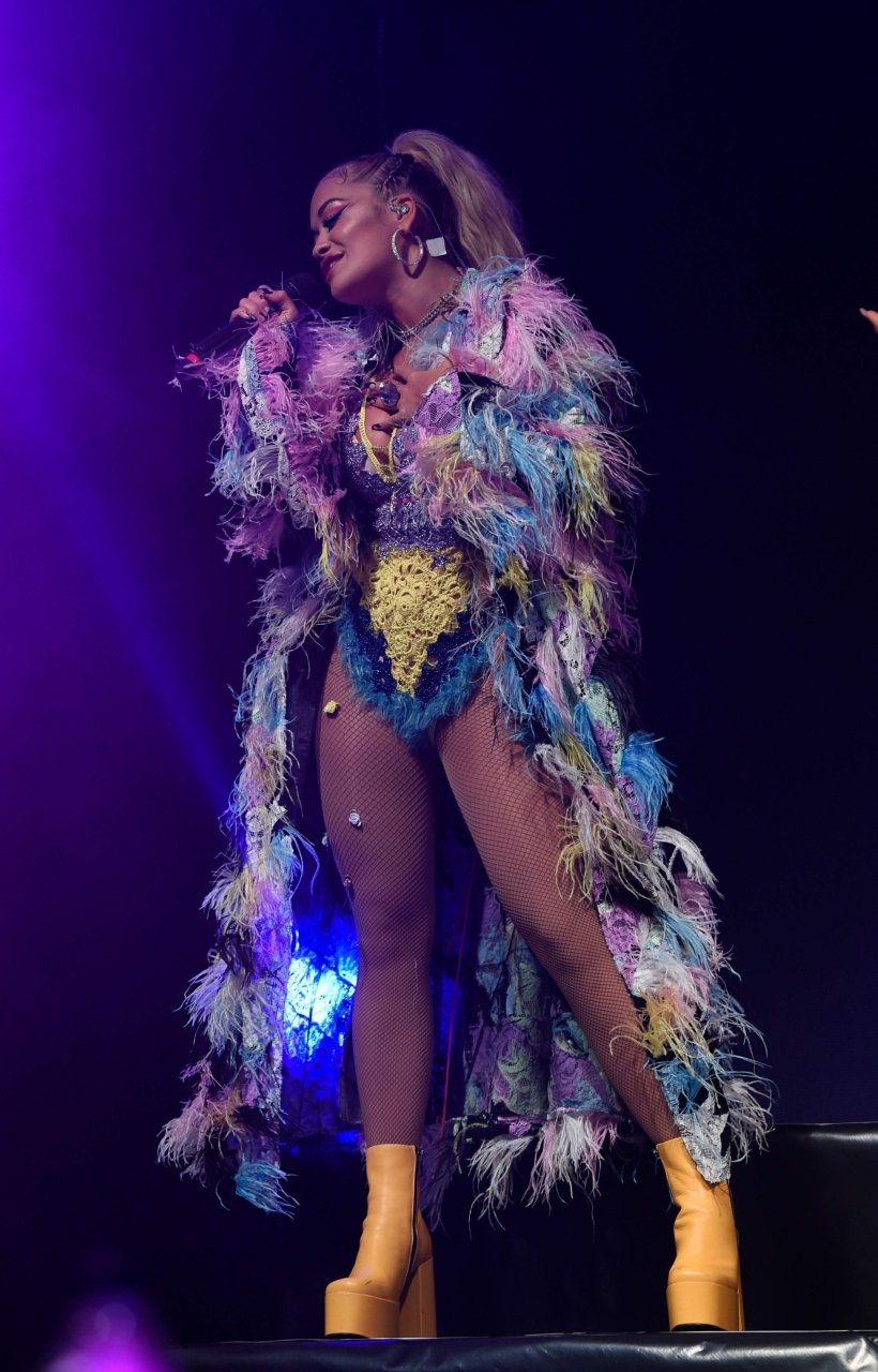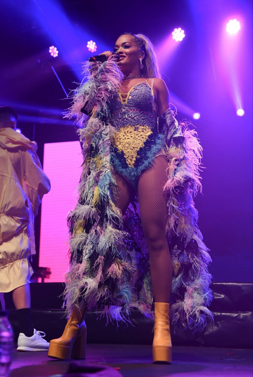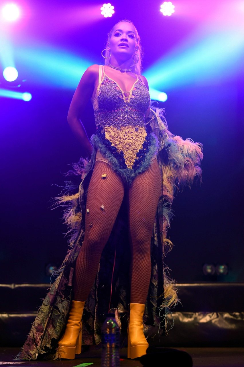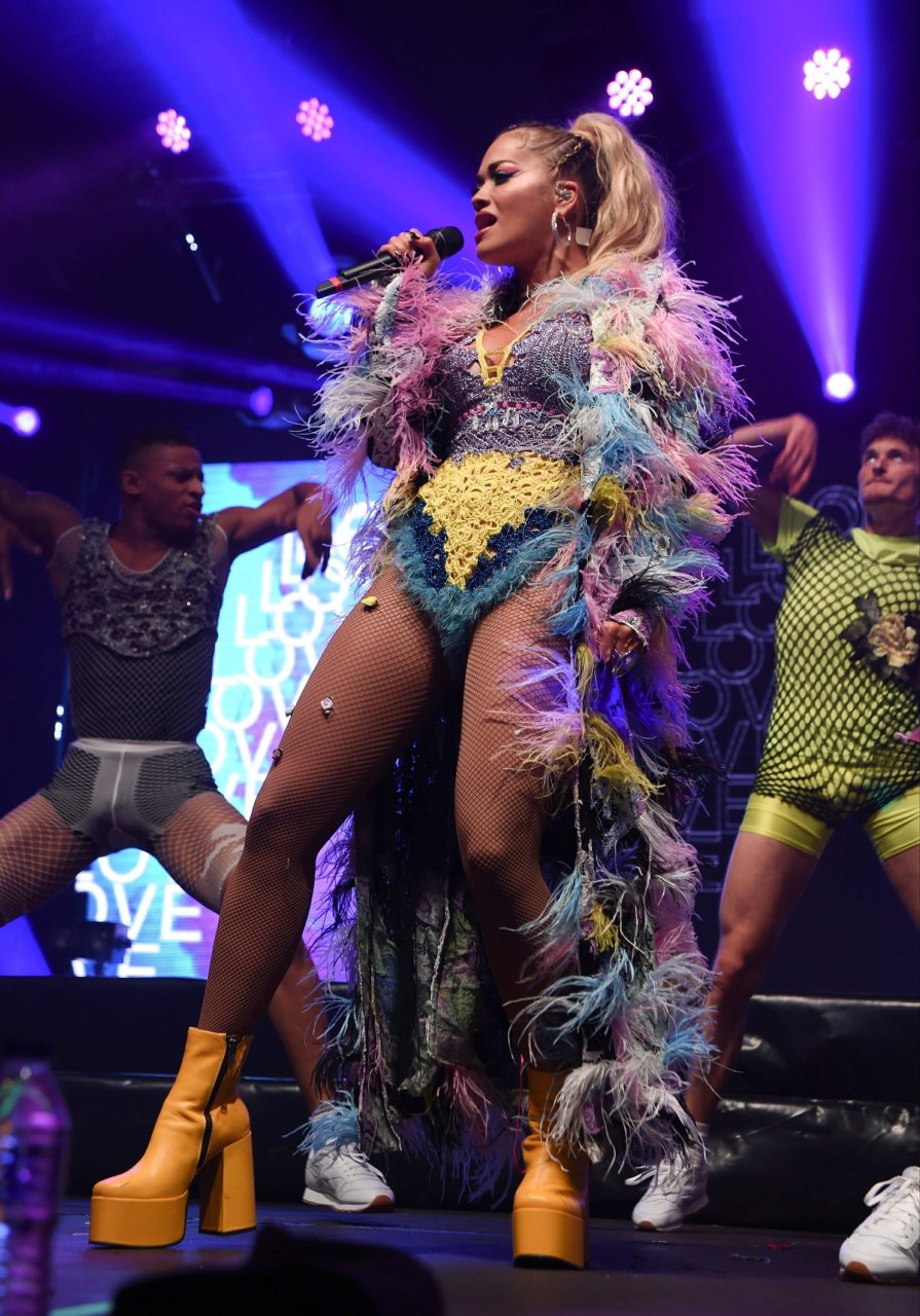 Rita Ora si esibisce sul Main Stage al Big Weekend 2018 di Manchester Pride a Londra, 26/08/2018. La cantante britannica di 27 anni ha scelto un outfit con piume e collant a rete.