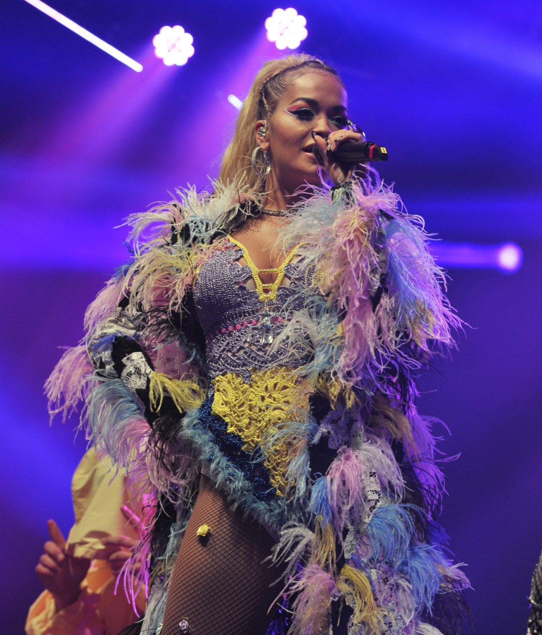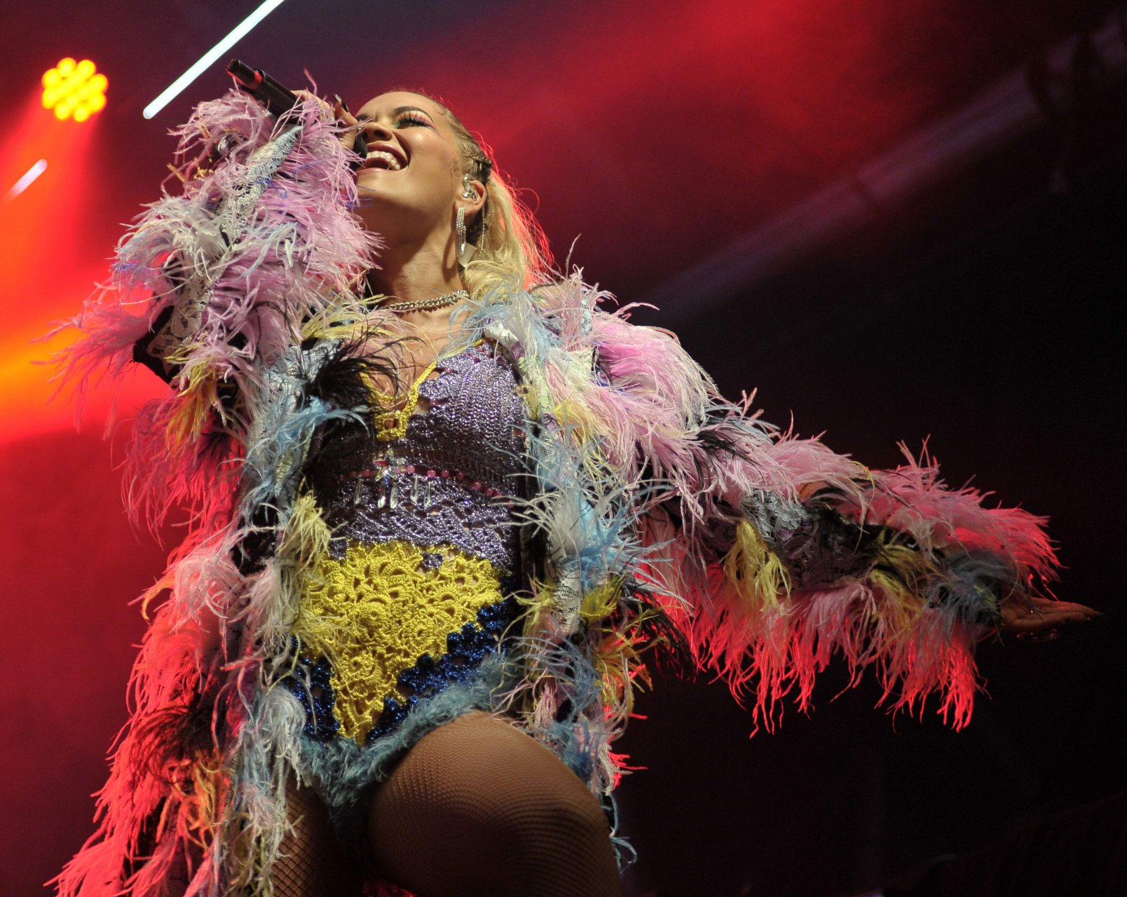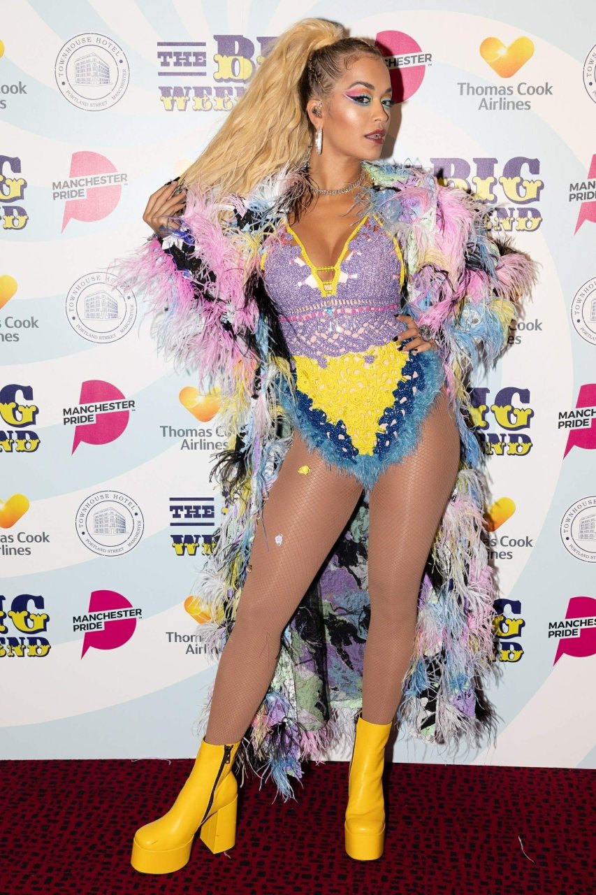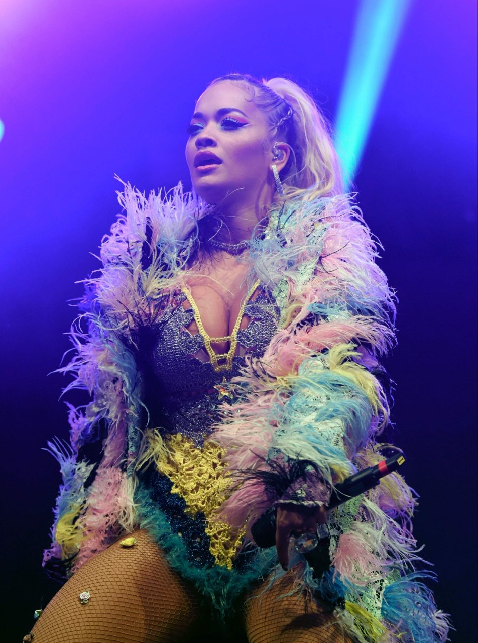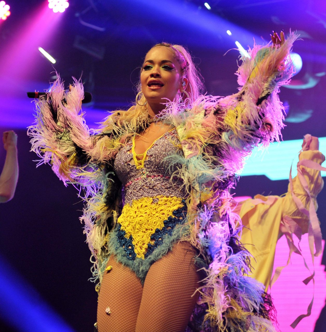 Rita Ora si esibisce sul Main Stage al Big Weekend 2018 di Manchester Pride a Londra, 26/08/2018. La cantante britannica di 27 anni ha scelto un outfit con piume e collant a rete.