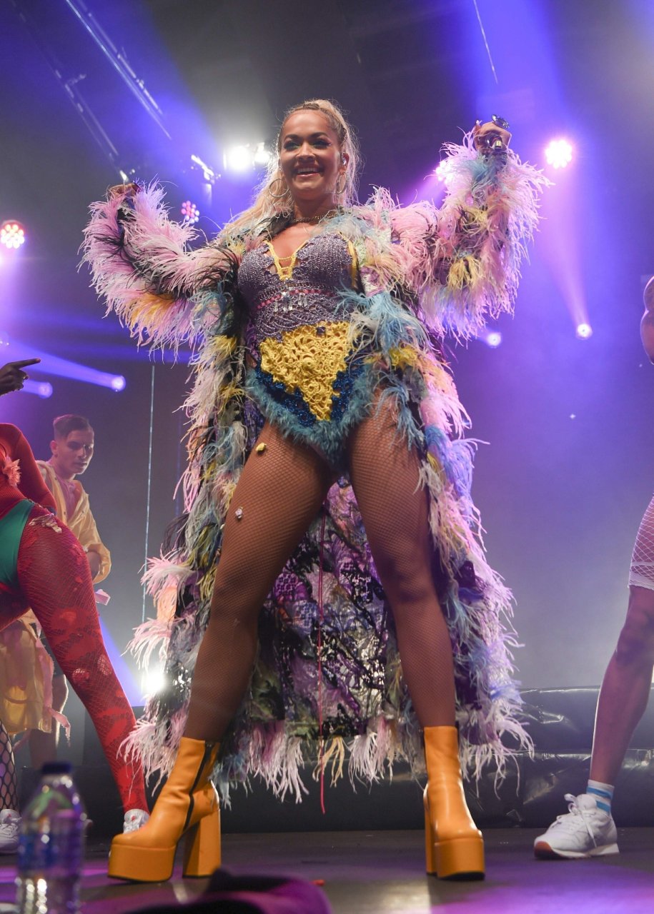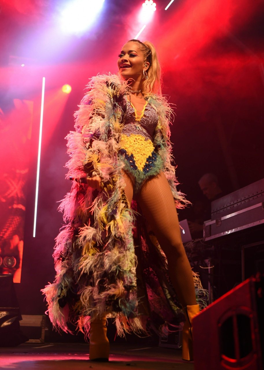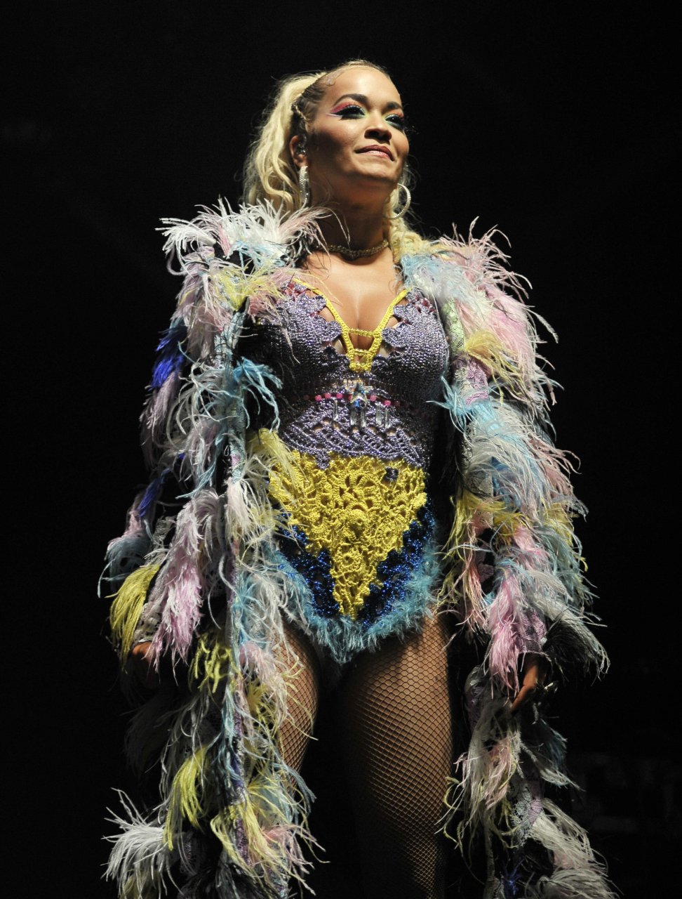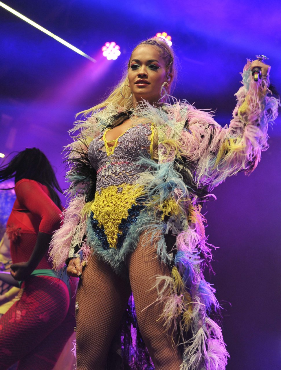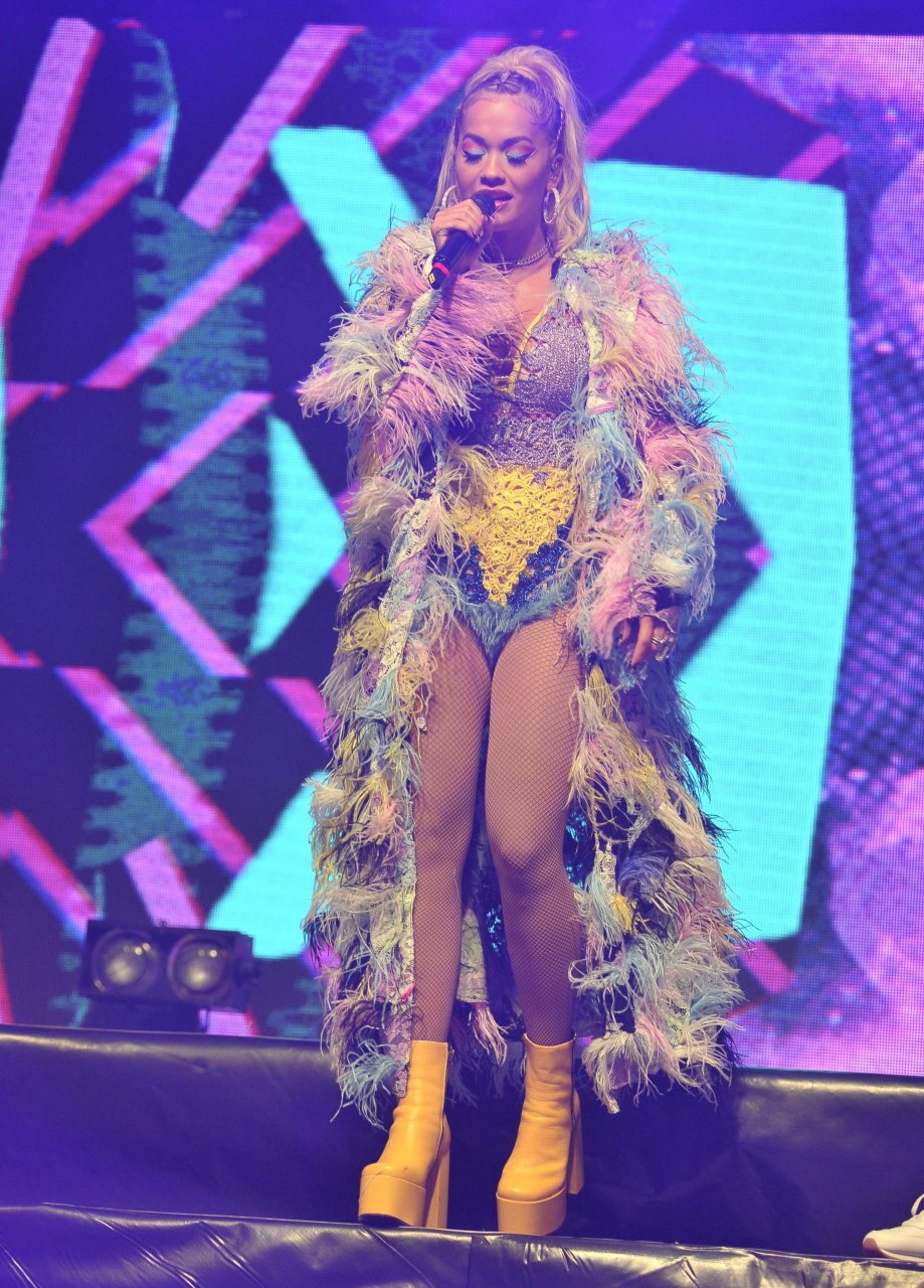 Rita Ora si esibisce sul Main Stage al Big Weekend 2018 di Manchester Pride a Londra, 26/08/2018. La cantante britannica di 27 anni ha scelto un outfit con piume e collant a rete.