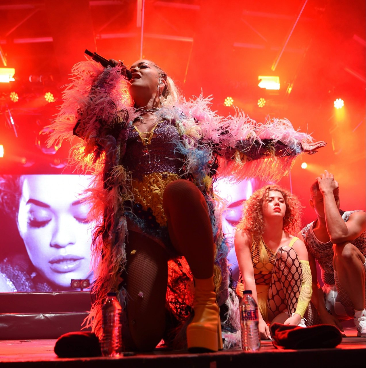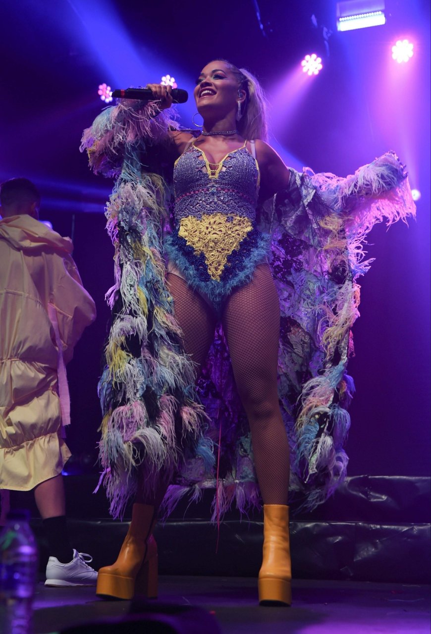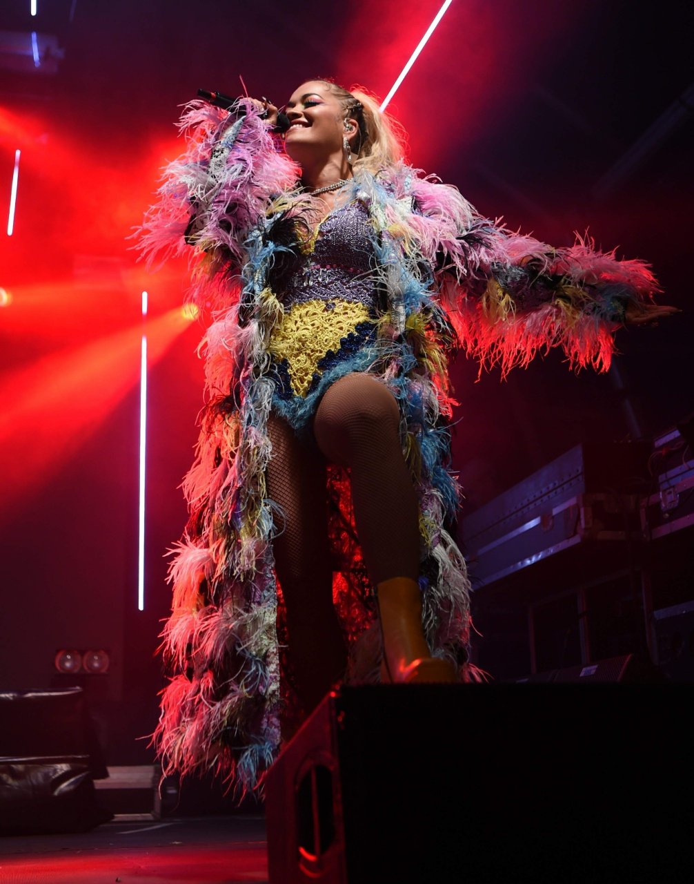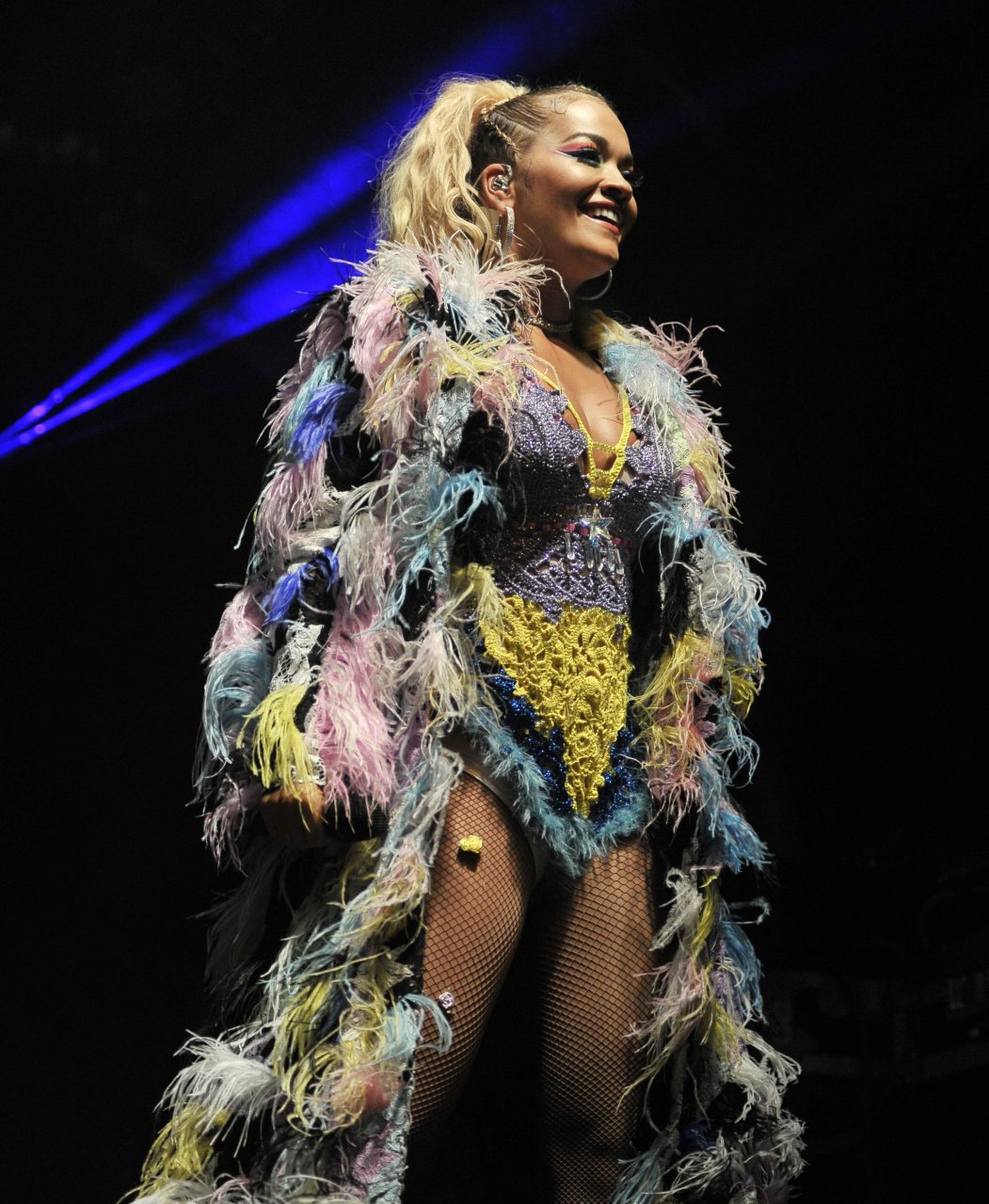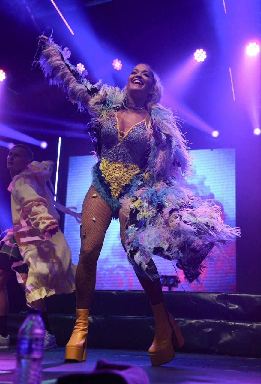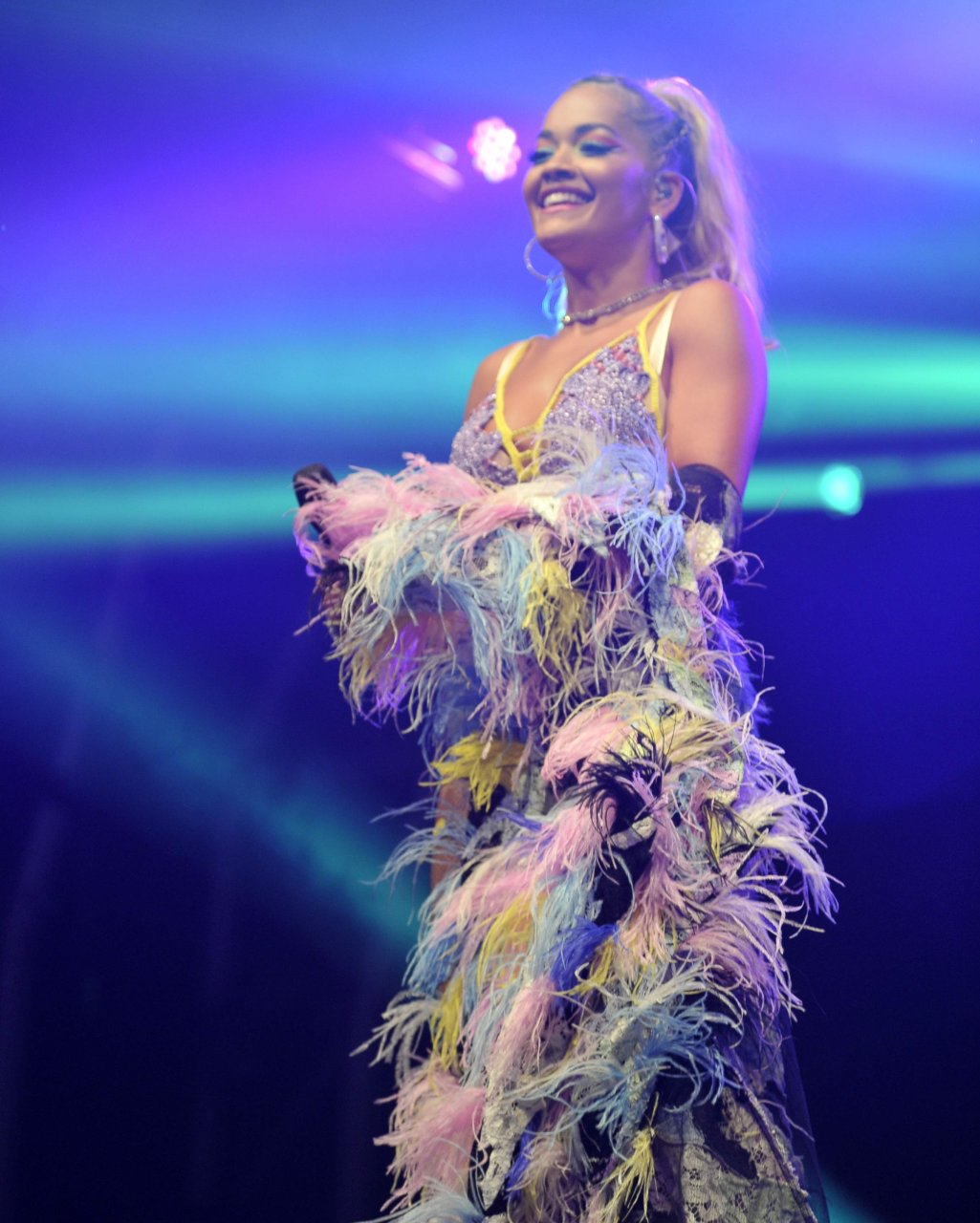 Rita Ora si esibisce sul Main Stage al Big Weekend 2018 di Manchester Pride a Londra, 26/08/2018. La cantante britannica di 27 anni ha scelto un outfit con piume e collant a rete.