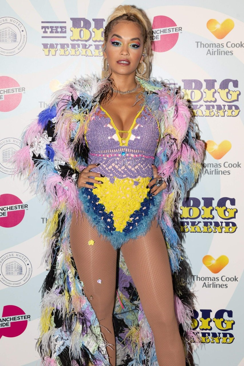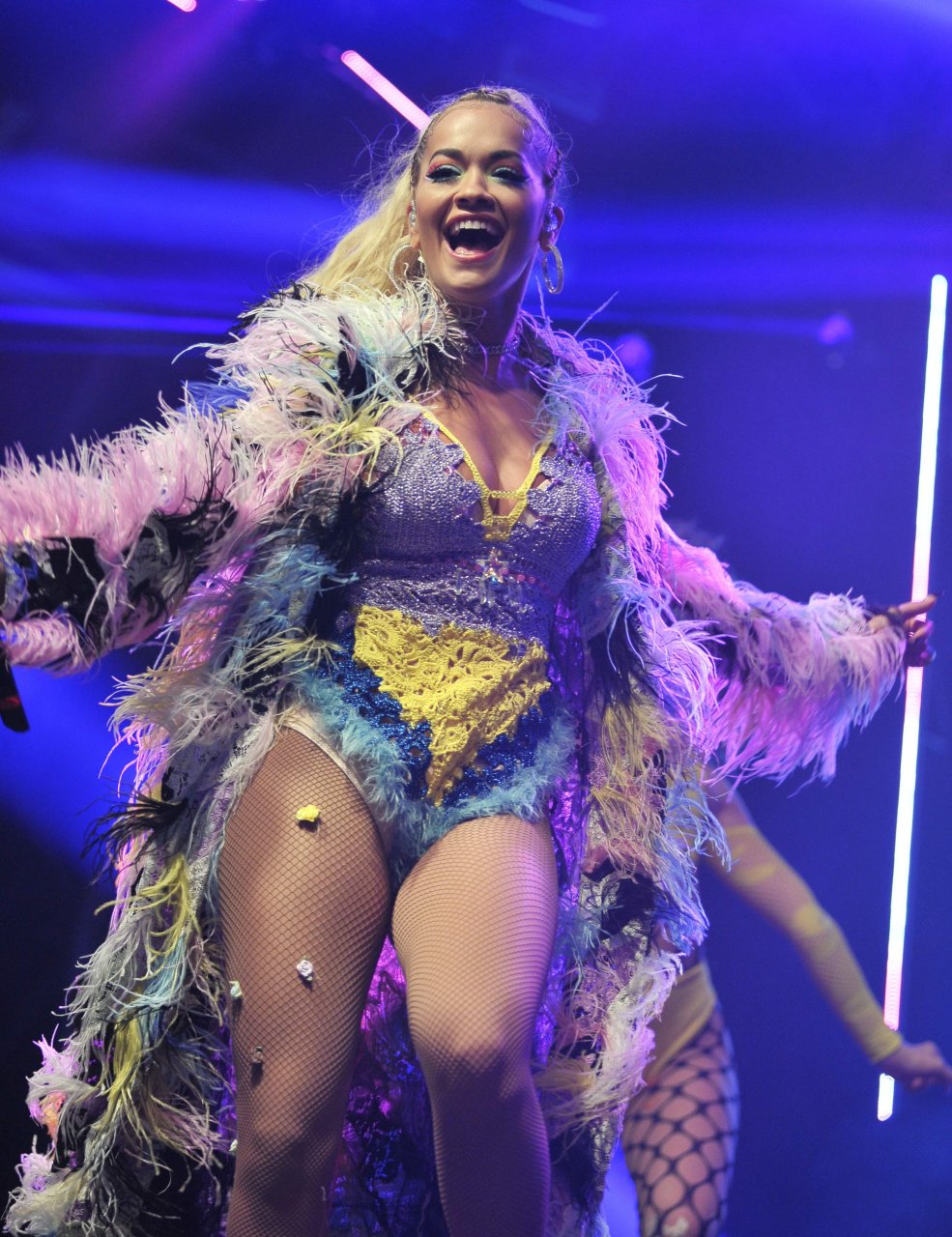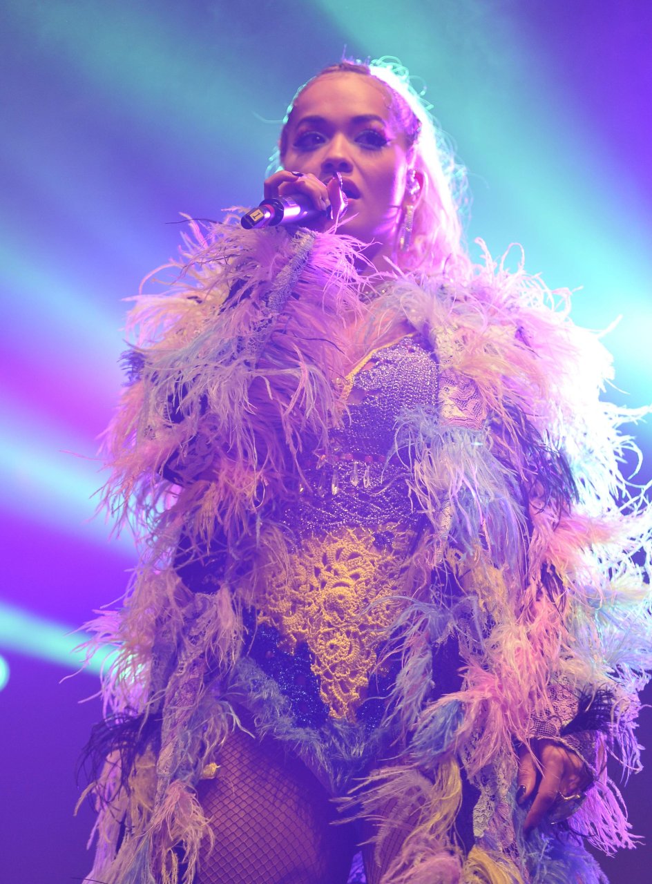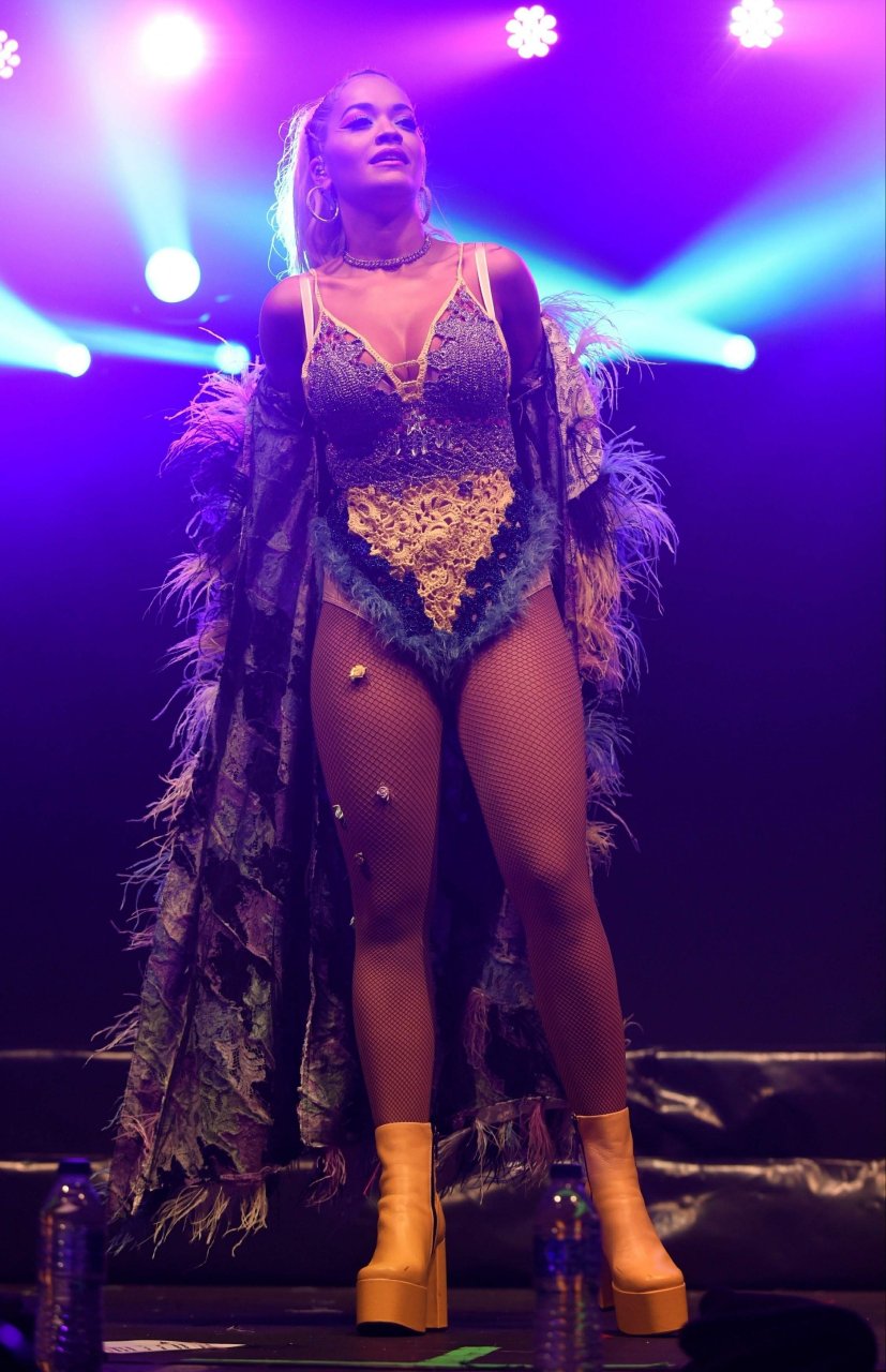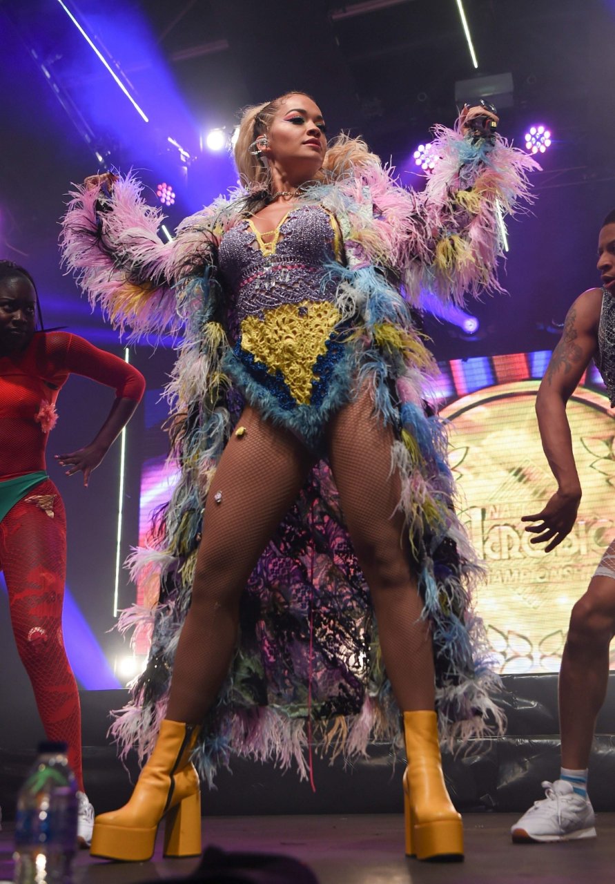 Rita Ora si esibisce sul Main Stage al Big Weekend 2018 di Manchester Pride a Londra, 26/08/2018. La cantante britannica di 27 anni ha scelto un outfit con piume e collant a rete.
