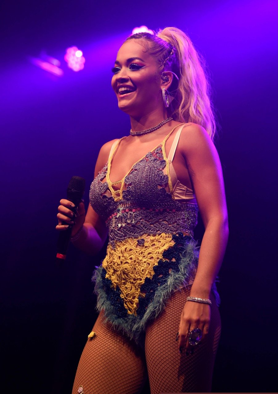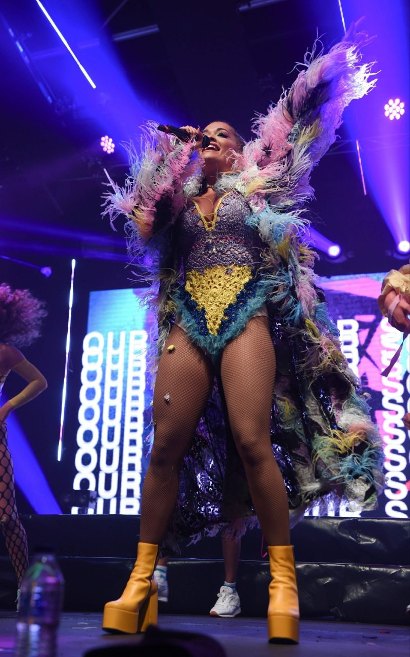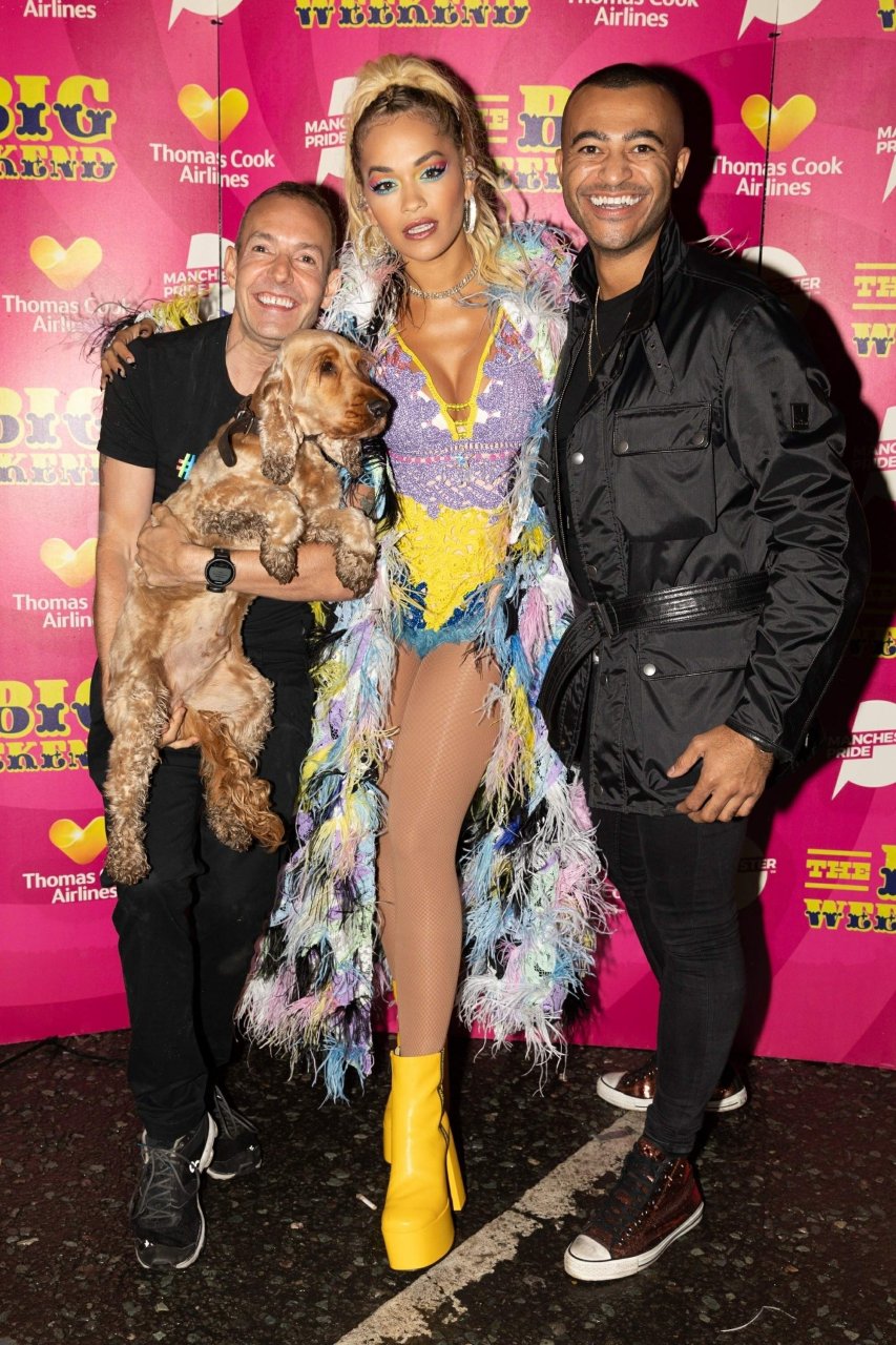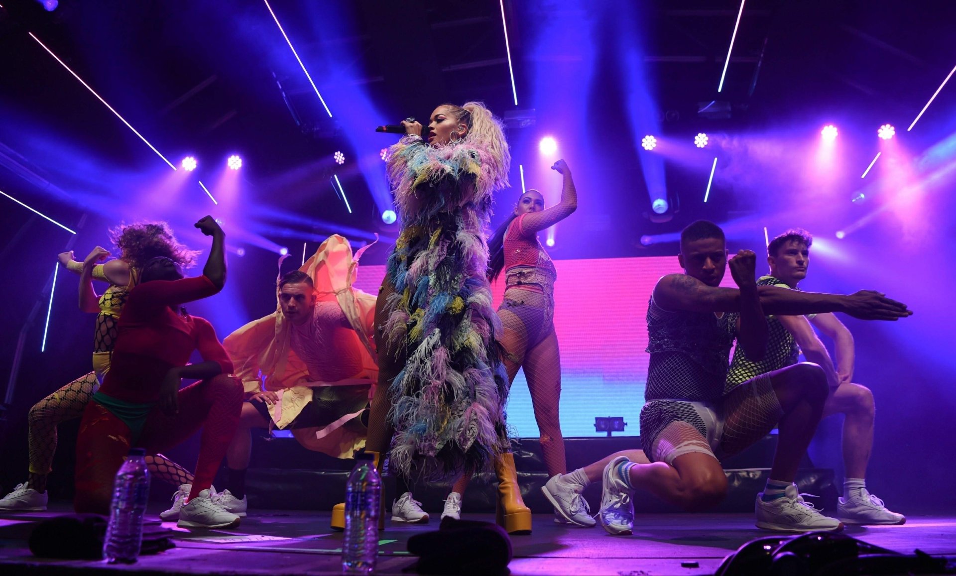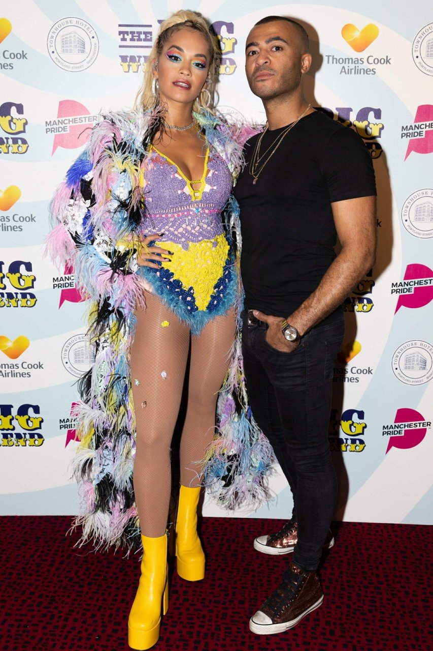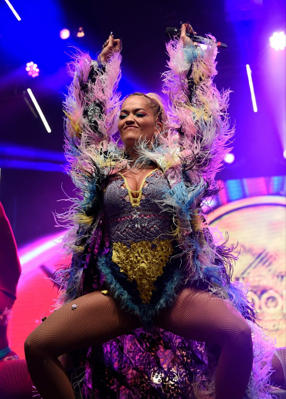 Rita Ora si esibisce sul Main Stage al Big Weekend 2018 di Manchester Pride a Londra, 26/08/2018. La cantante britannica di 27 anni ha scelto un outfit con piume e collant a rete.