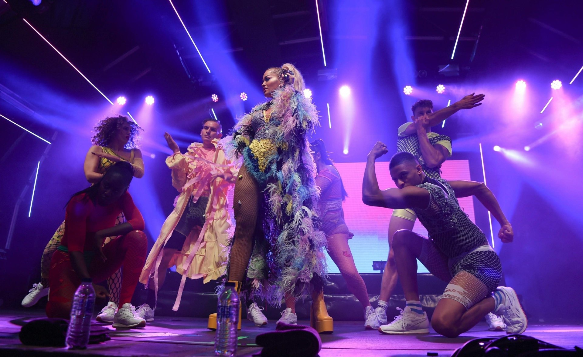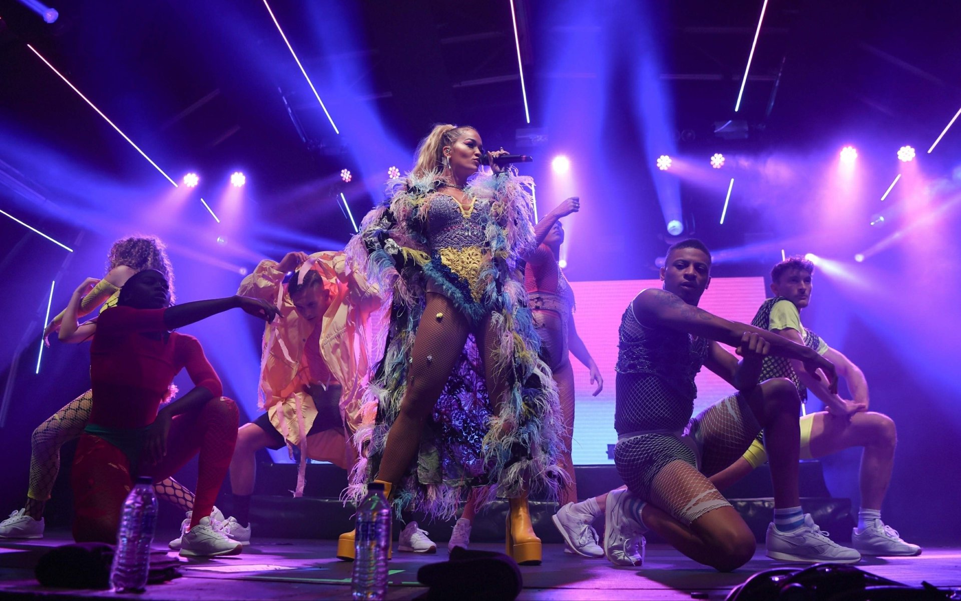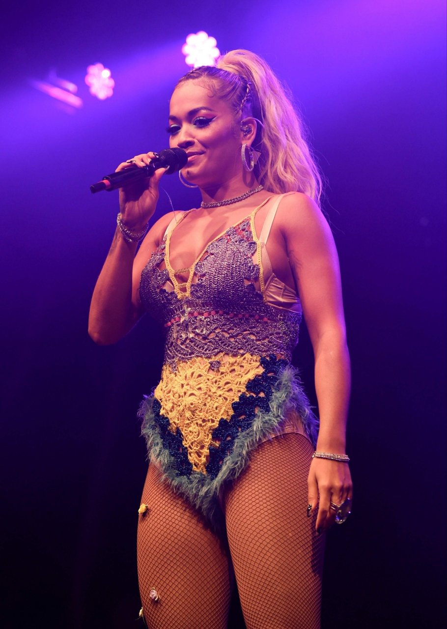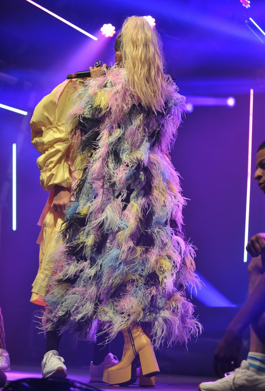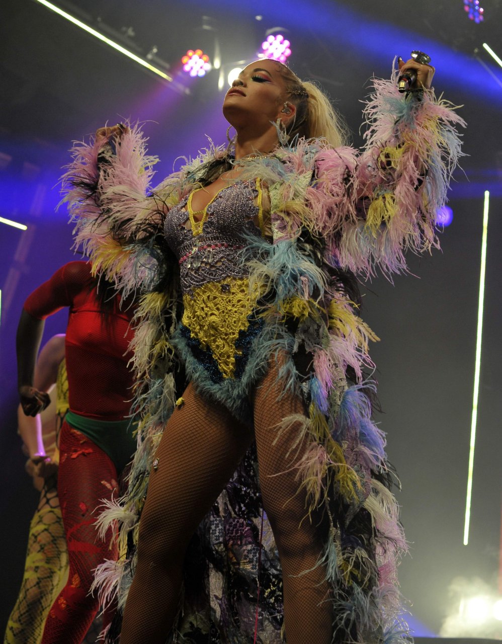 Rita Ora si esibisce sul Main Stage al Big Weekend 2018 di Manchester Pride a Londra, 26/08/2018. La cantante britannica di 27 anni ha scelto un outfit con piume e collant a rete.