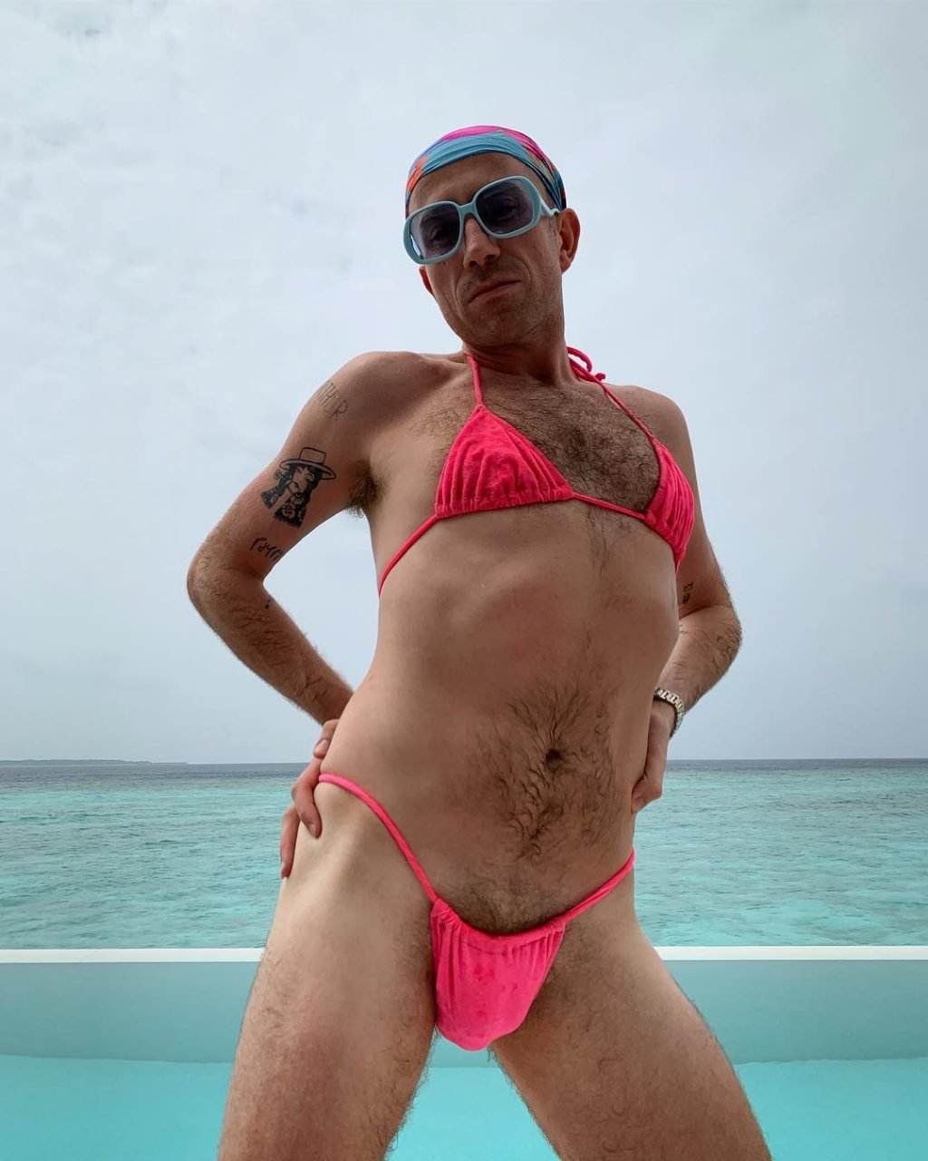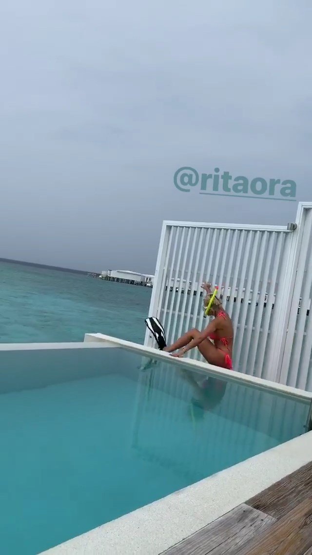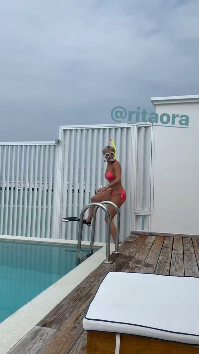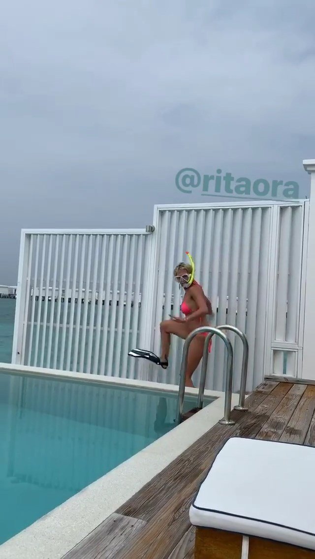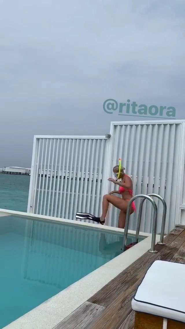 Questa volta la cantante Rita Ora ha mostrato il suo seno in un bikini rosa durante la sua vacanza alle Maldive – Instagram, 01/01/2019.