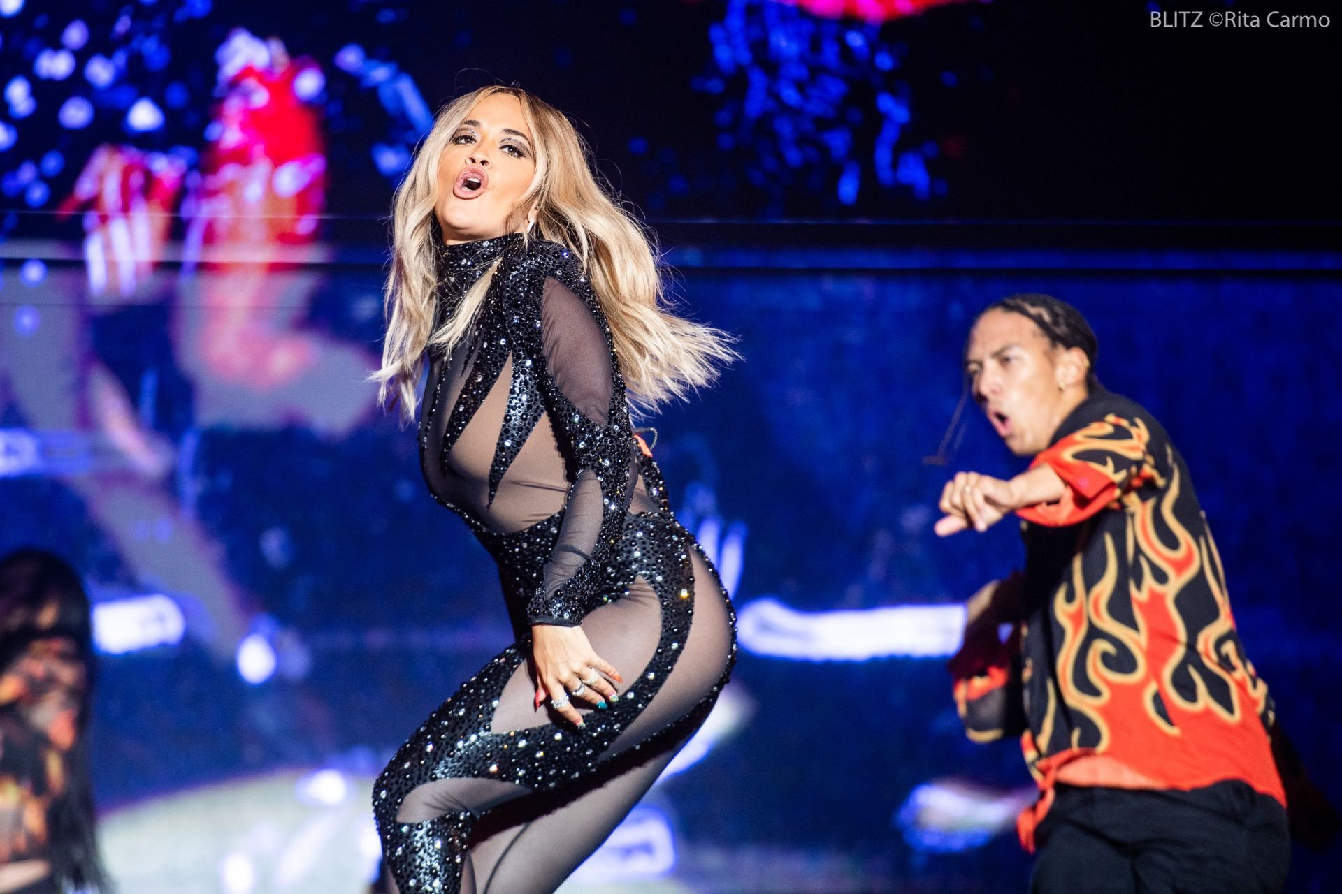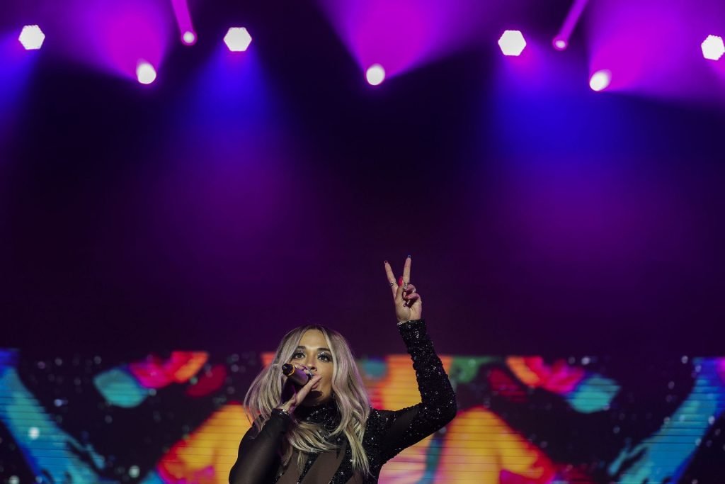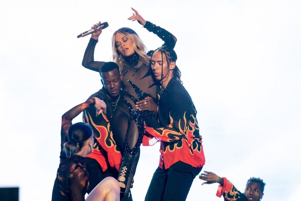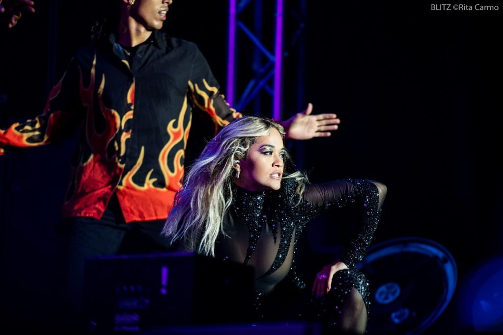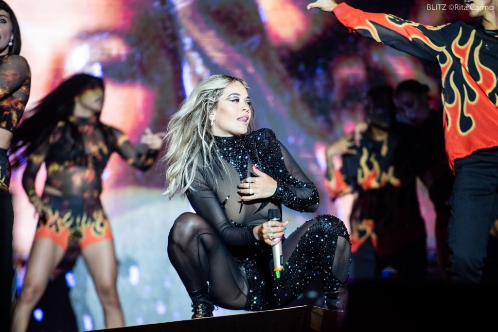 Rita Ora si esibisce alla 23ª edizione del Meo Sudoeste Festival a Zambujeira do Mar, Portogallo, 08/10/2019. La cantante ha scelto per il concerto un outfit nero aderente.