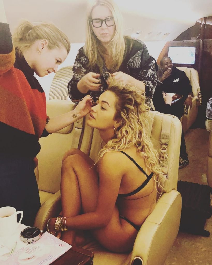 La cantante Rita Ora si spoglia in lingerie sexy su un jet privato prima di una sfilata di moda – Instagram, 22/02/2018.