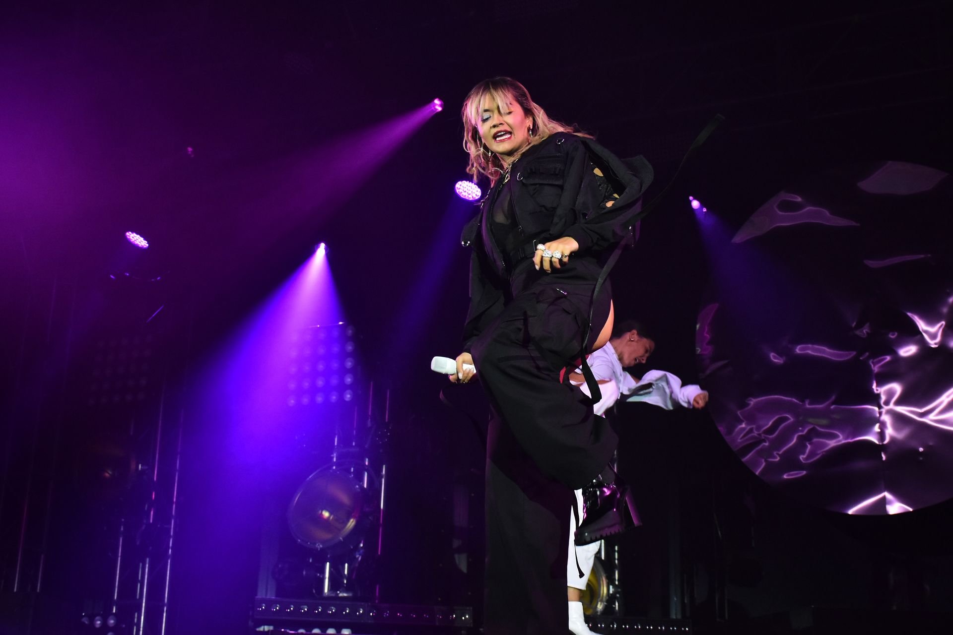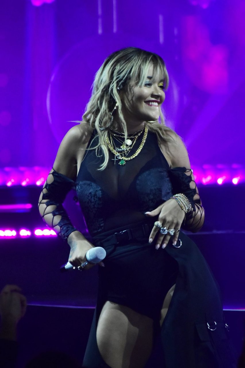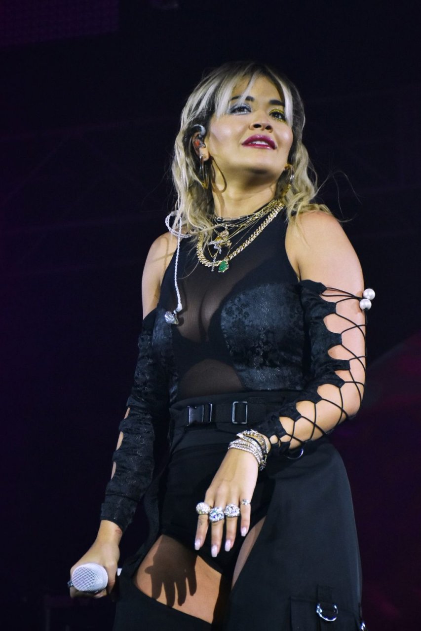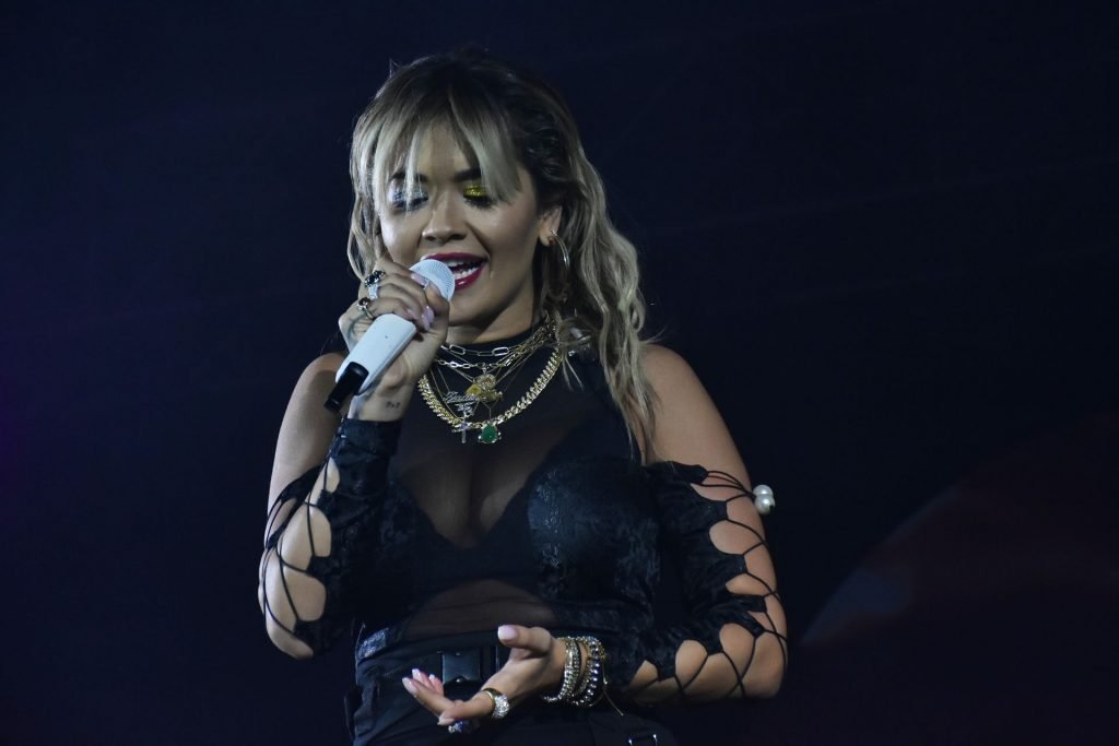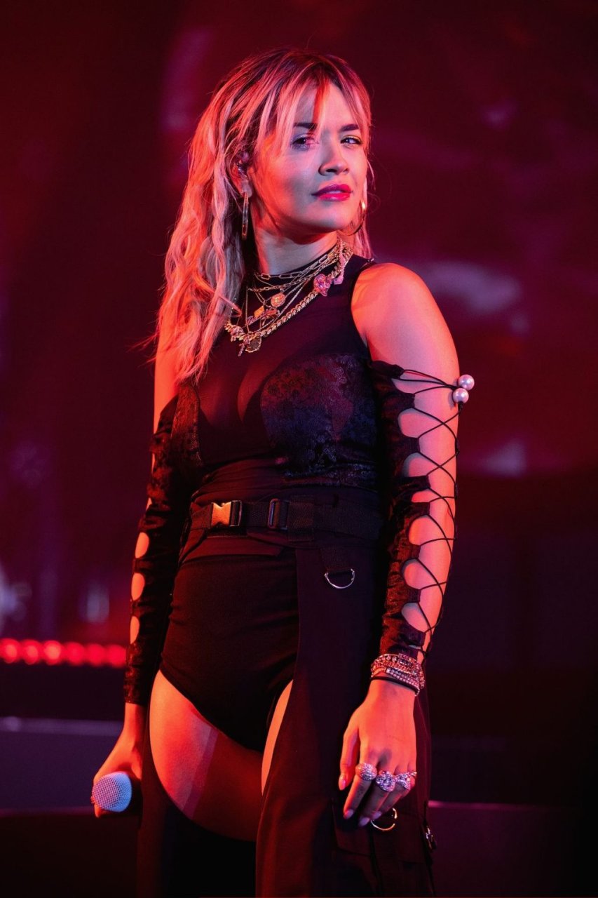 Singer Rita Ora si esibisce al lancio di American Express Gold a Città del Messico, 17/10/2019. Ha mostrato il suo décolleté e il sedere sul palco.