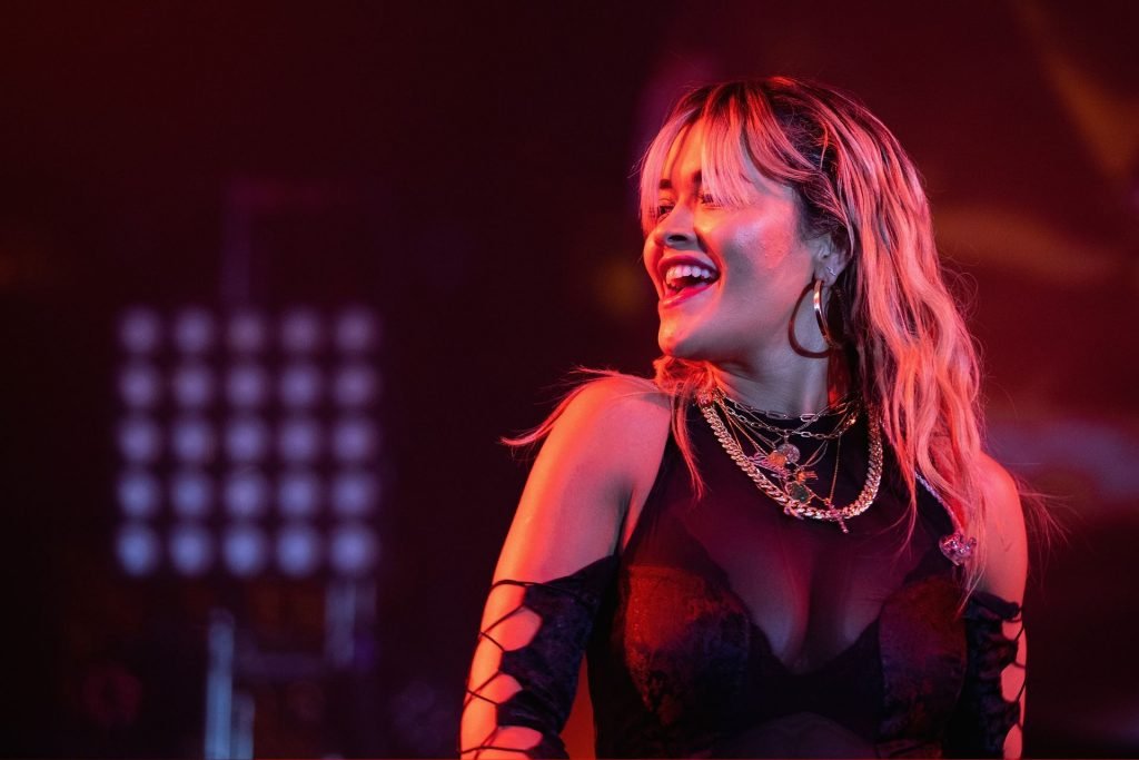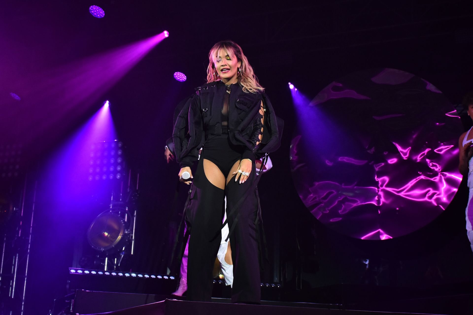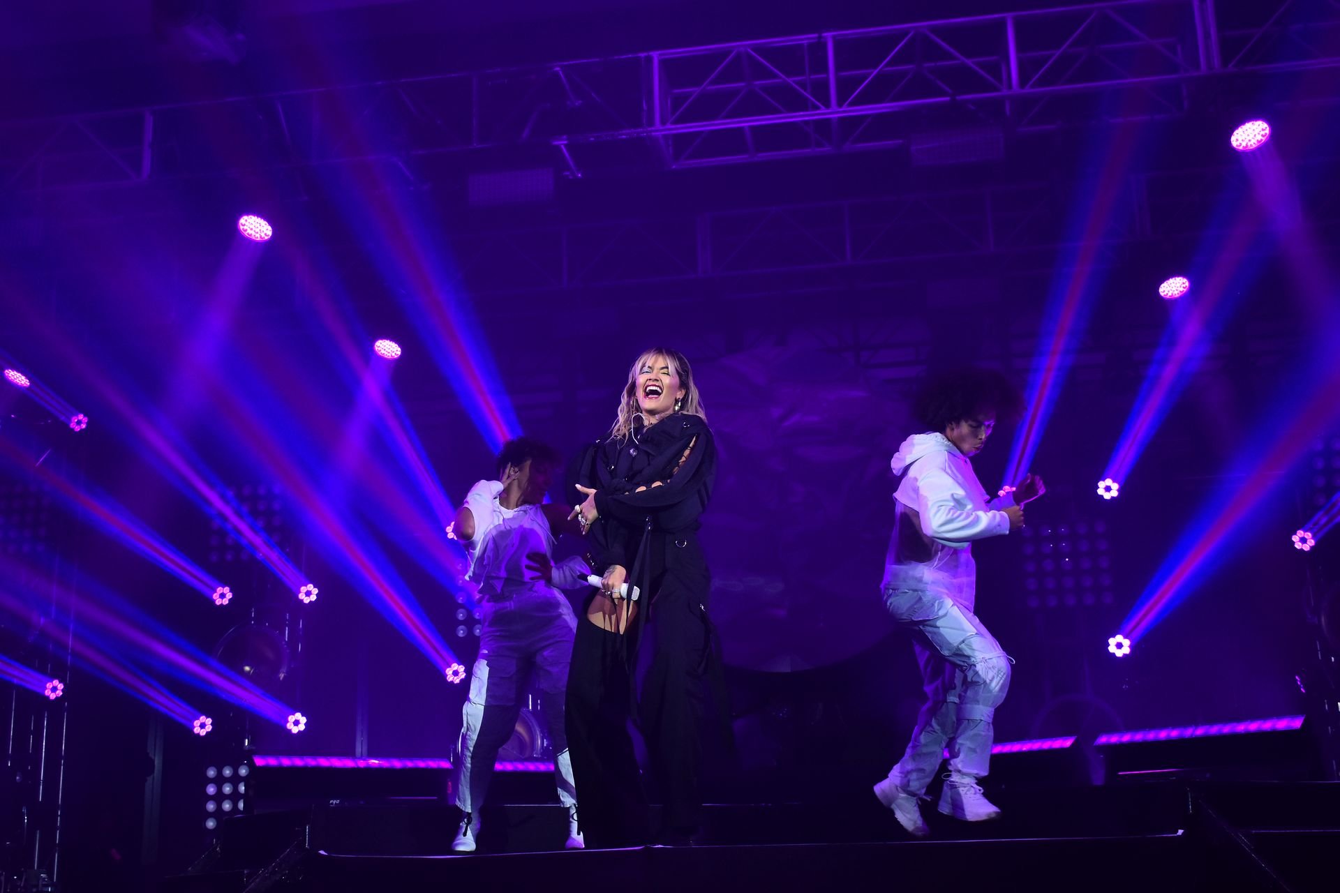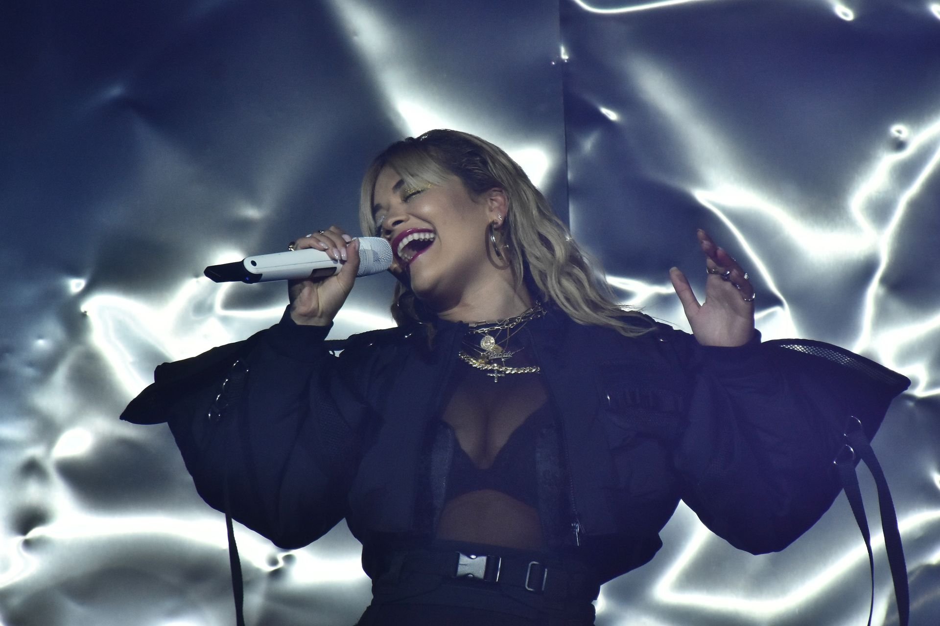 Singer Rita Ora si esibisce al lancio di American Express Gold a Città del Messico, 17/10/2019. Ha mostrato il suo décolleté e il sedere sul palco.