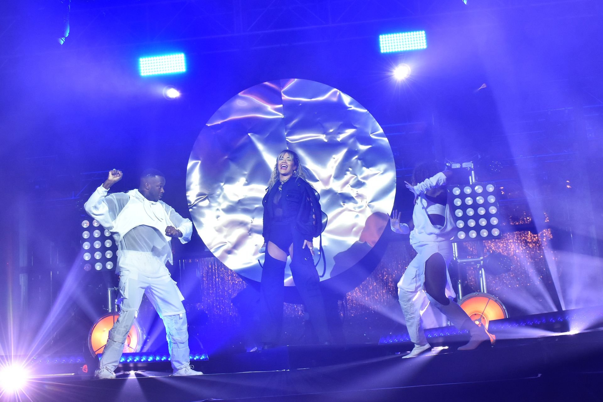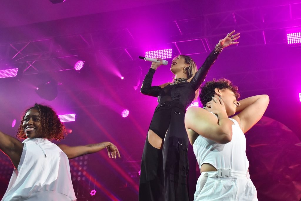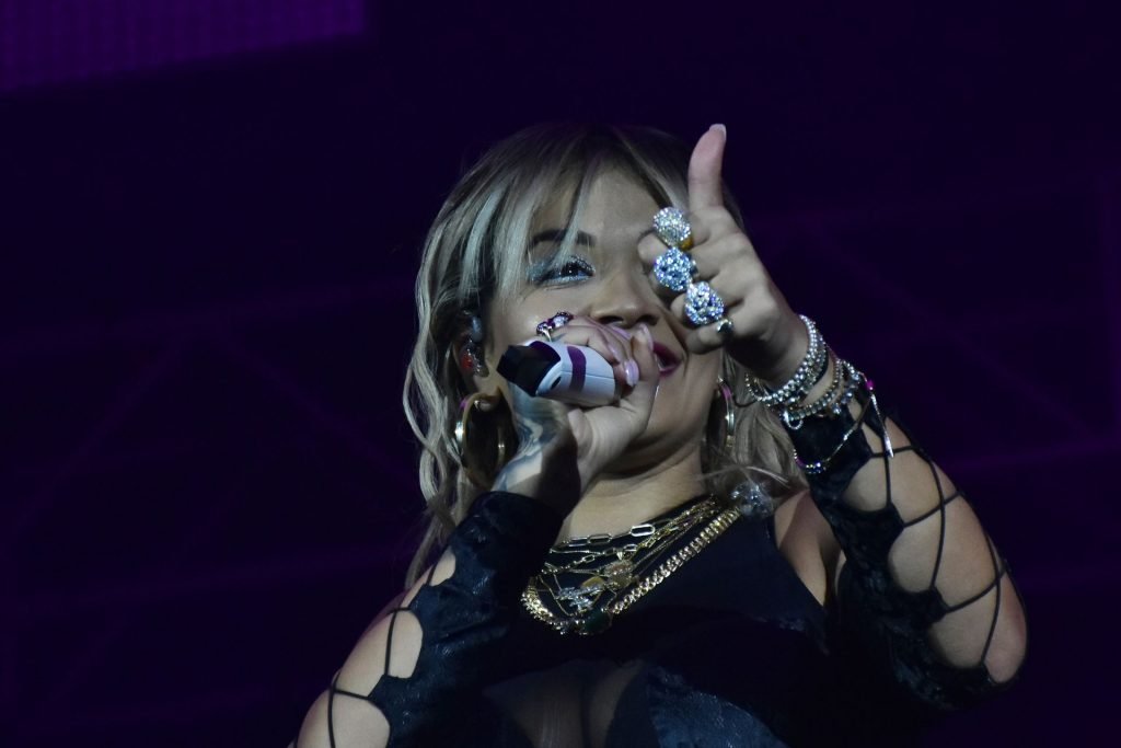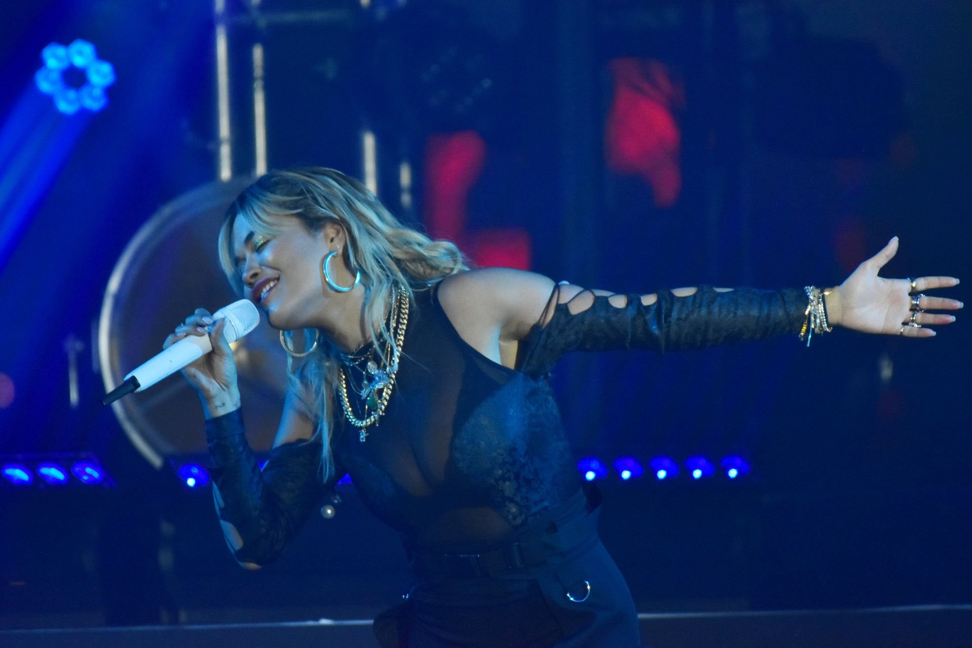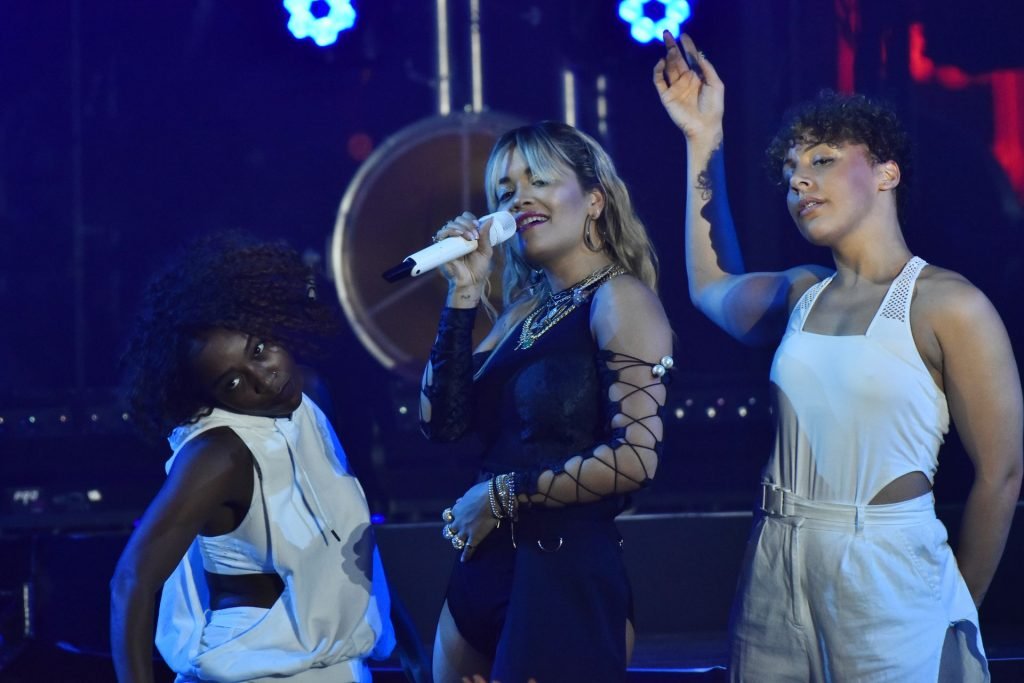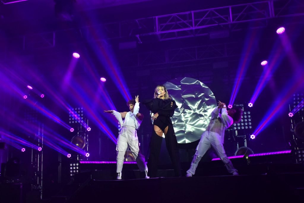 Singer Rita Ora si esibisce al lancio di American Express Gold a Città del Messico, 17/10/2019. Ha mostrato il suo décolleté e il sedere sul palco.