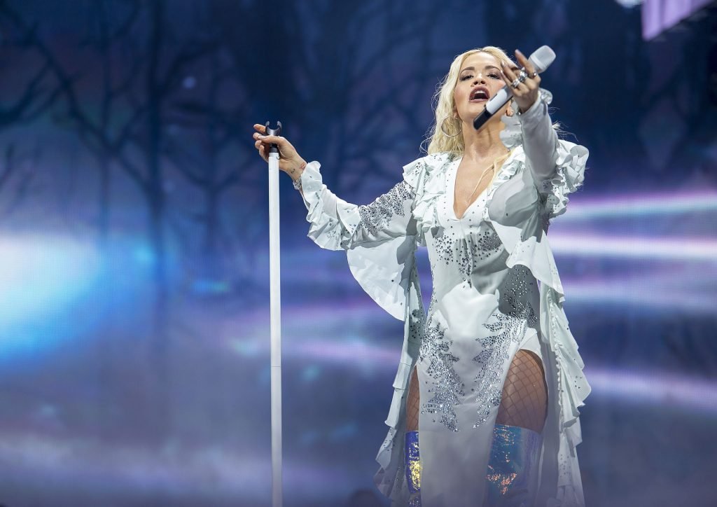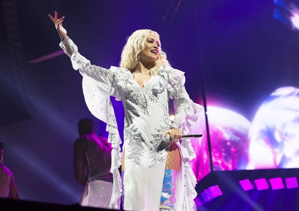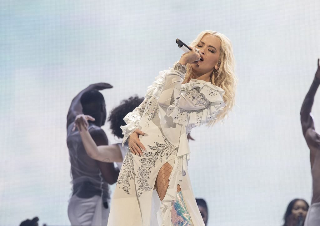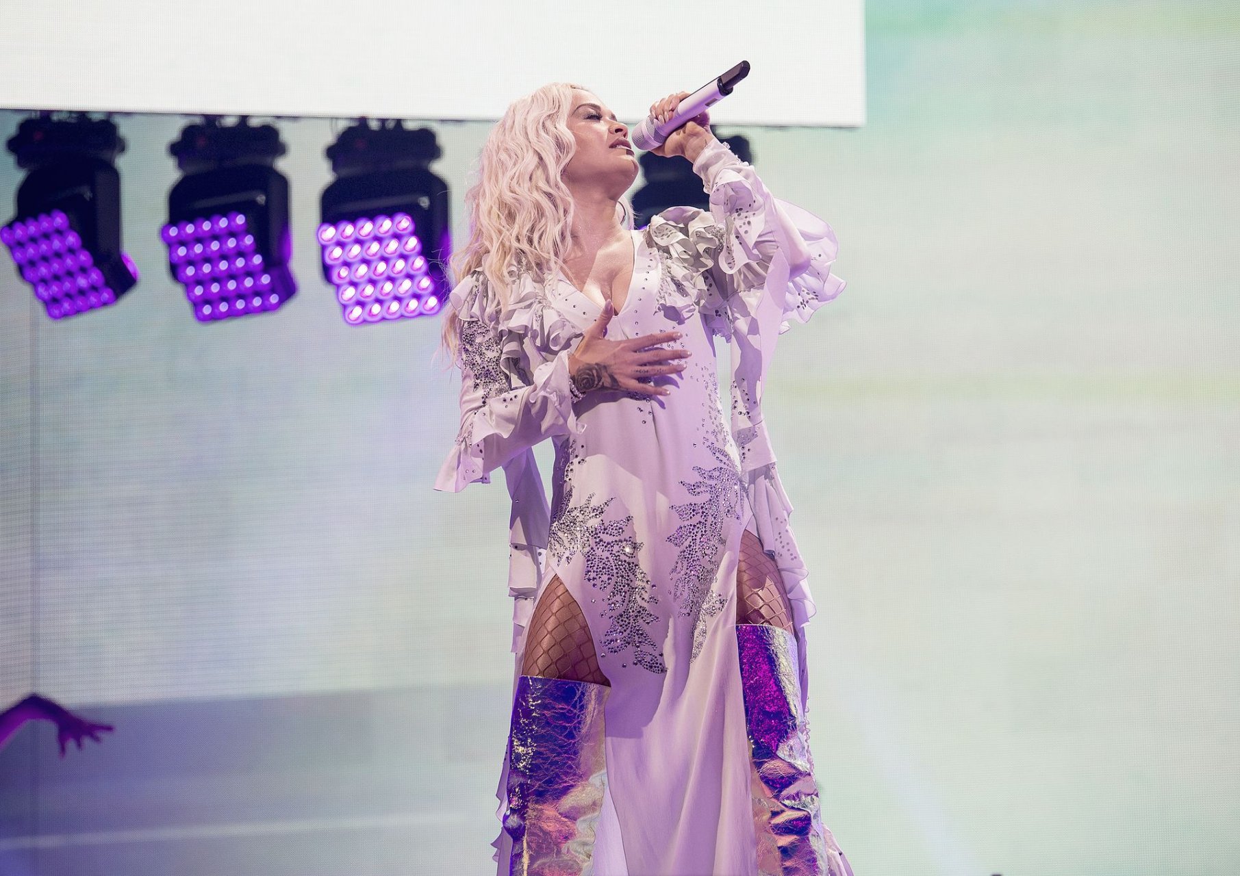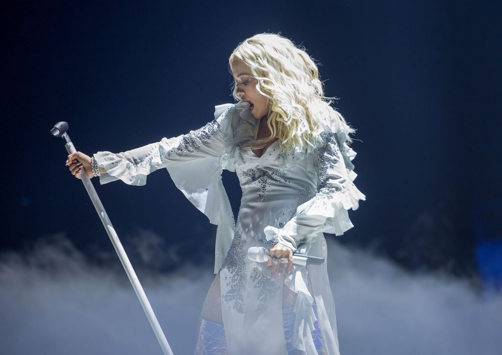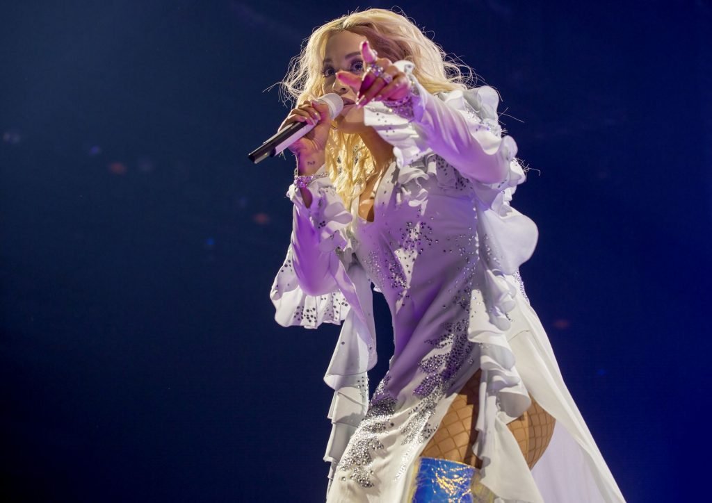 Singer Rita Ora è stata fotografata sul palco durante un concerto live alla Liverpool M & S Bank Arena di Liverpool, 28/05/2019.