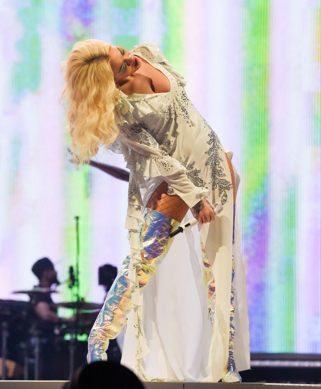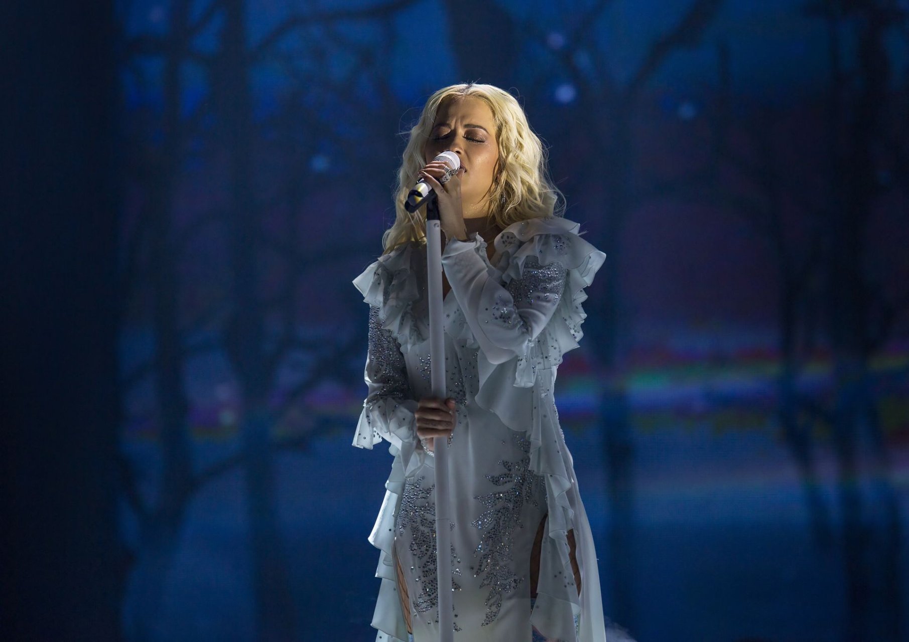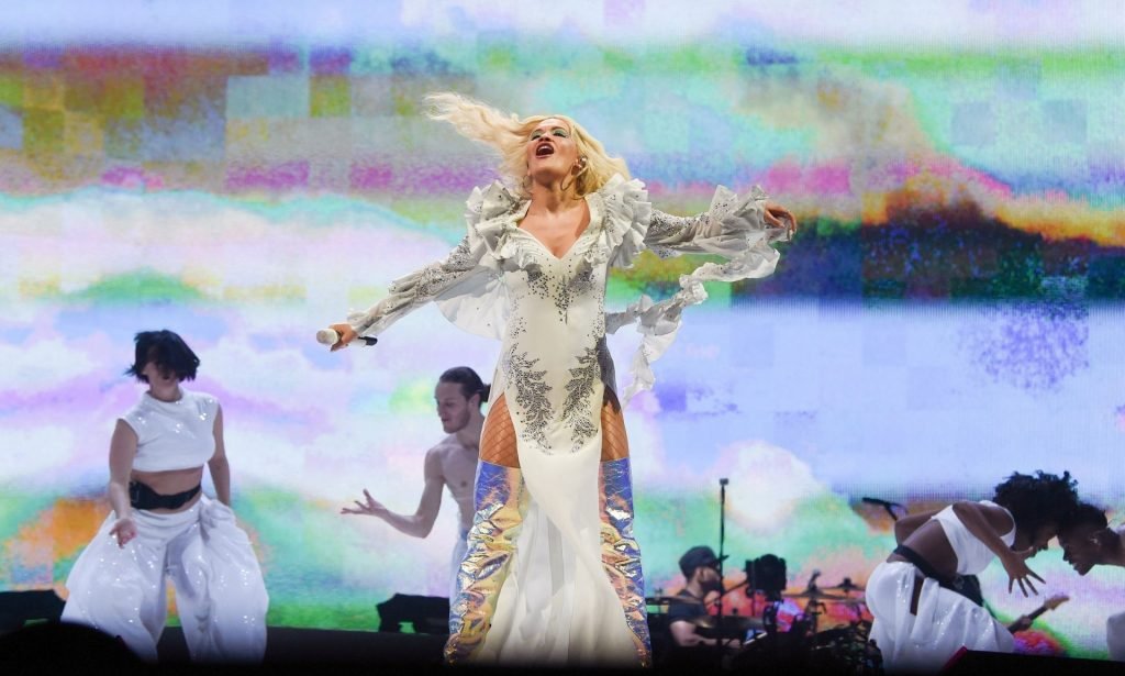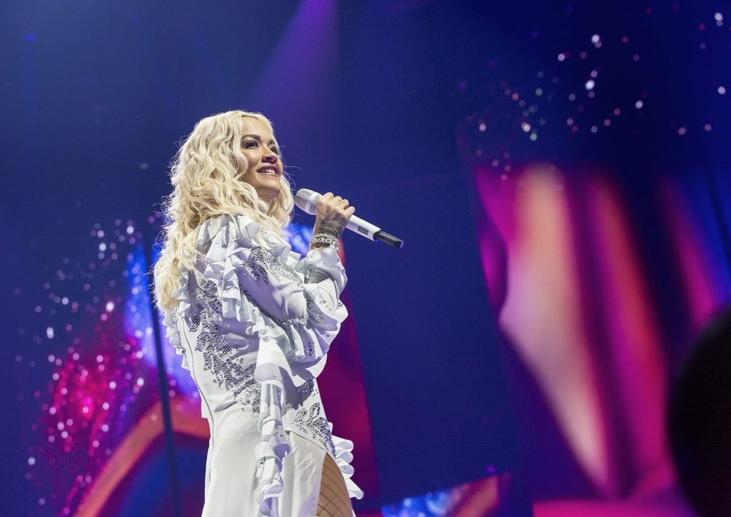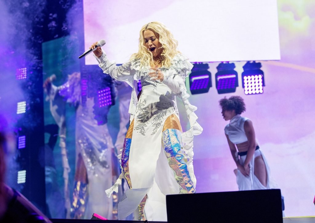 Singer Rita Ora è stata fotografata sul palco durante un concerto live alla Liverpool M & S Bank Arena di Liverpool, 28/05/2019.