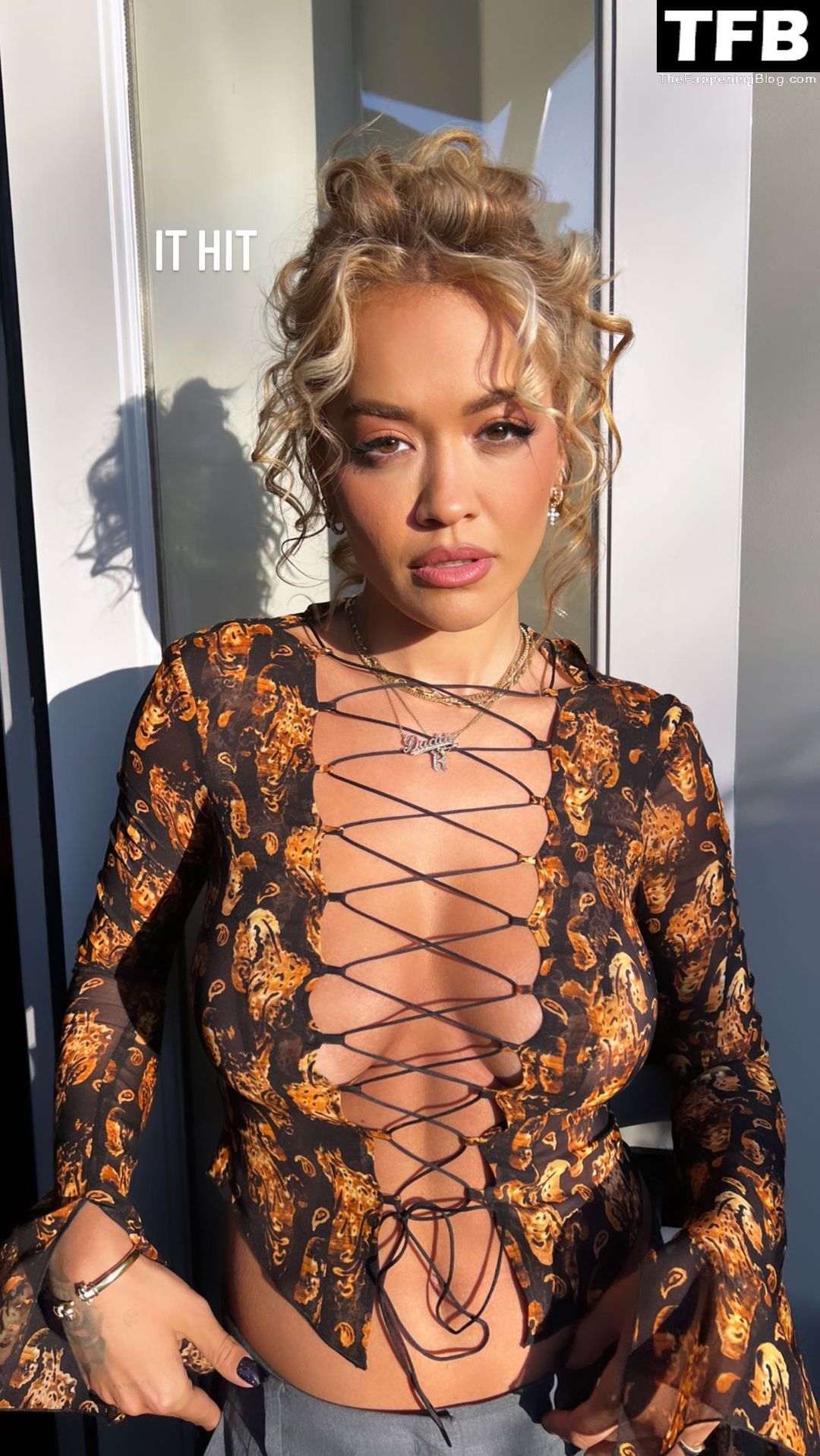 La cantante Rita Ora posa senza reggiseno, mostrando i suoi seni sexy – Instagram, 05/11/2022.