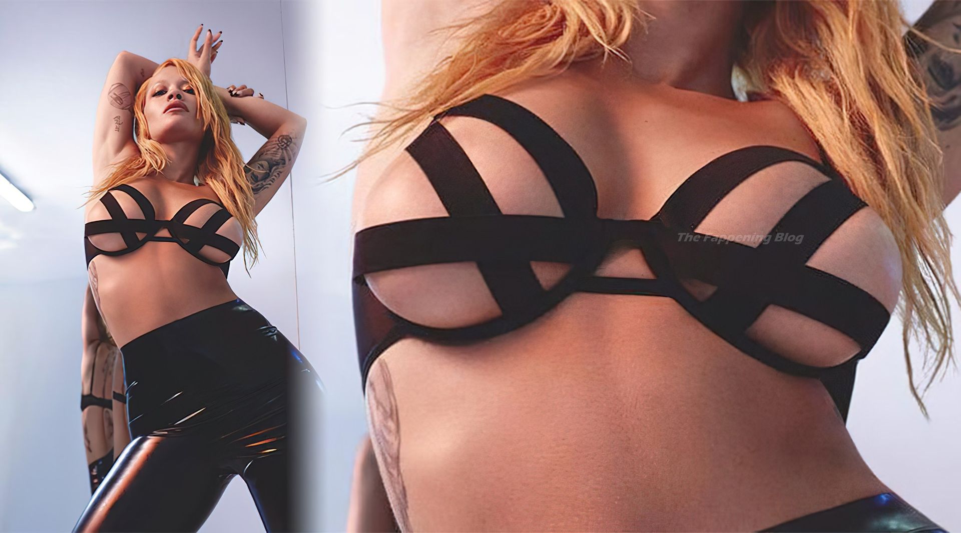 La cantante Rita Ora mostra il suo seno mentre posa con un reggiseno nero e mutandine di pelle per il suo video musicale “Bang”.