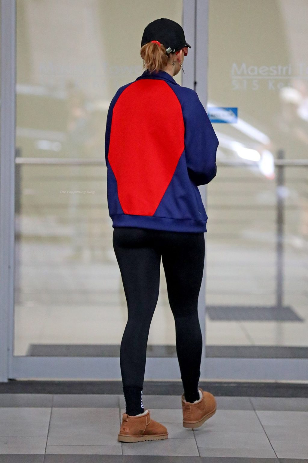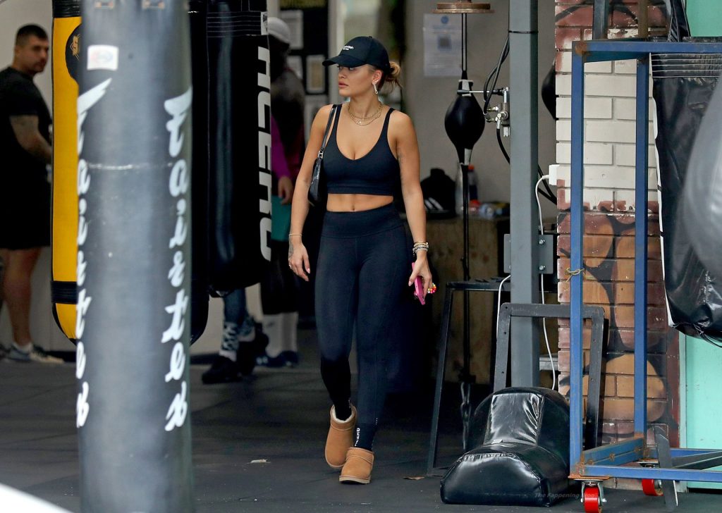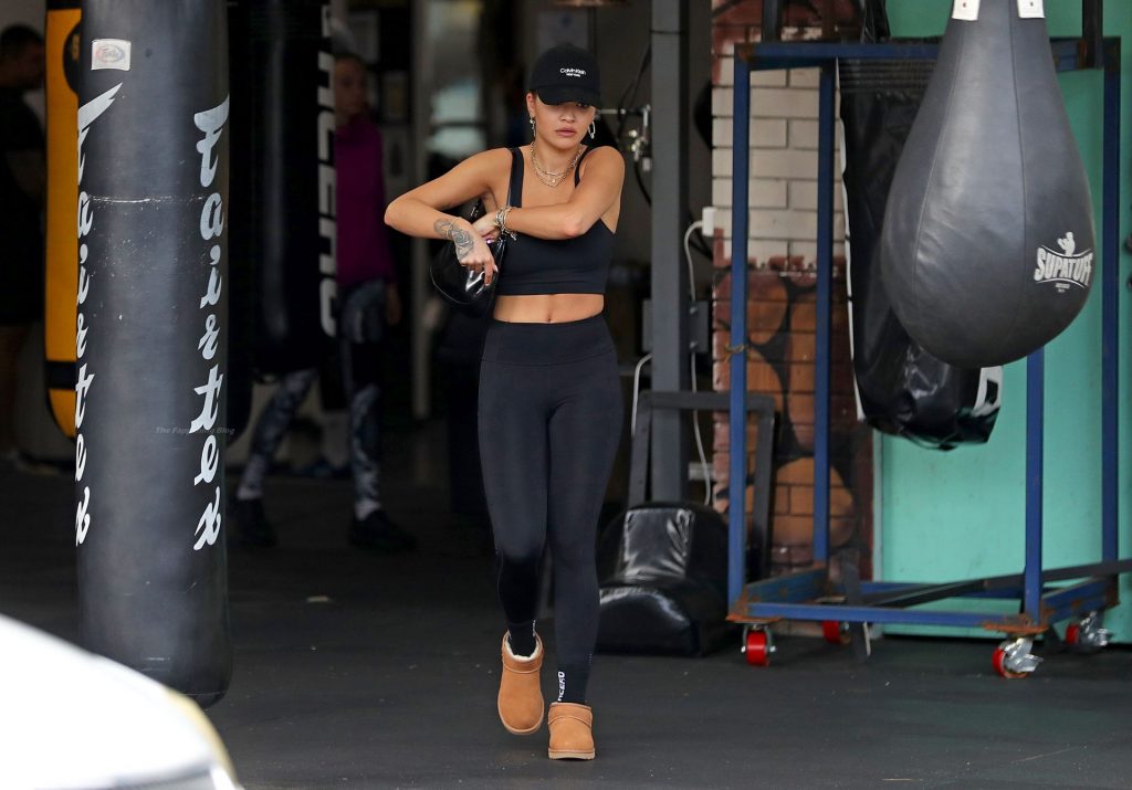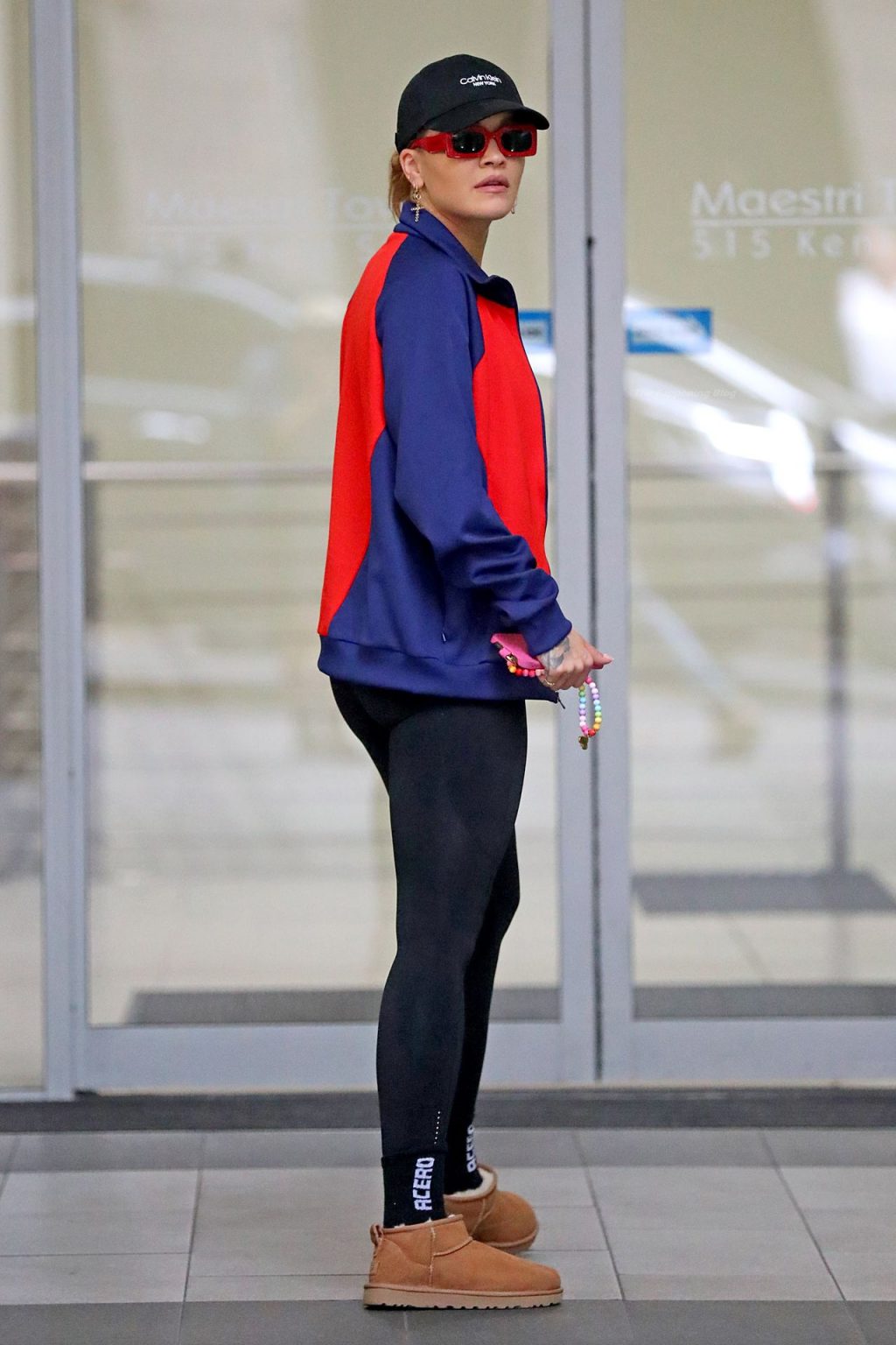 La cantante e attrice inglese di 30 anni indossava un berretto da baseball, una canotta sportiva, leggings neri, calzini e stivali Ugg ‘Ultra Mini’.