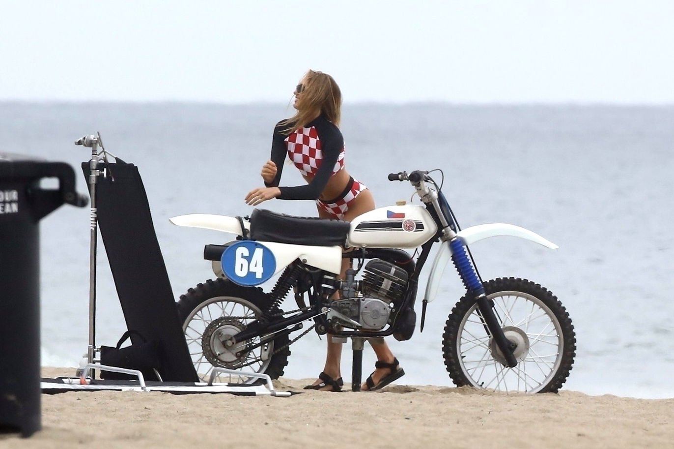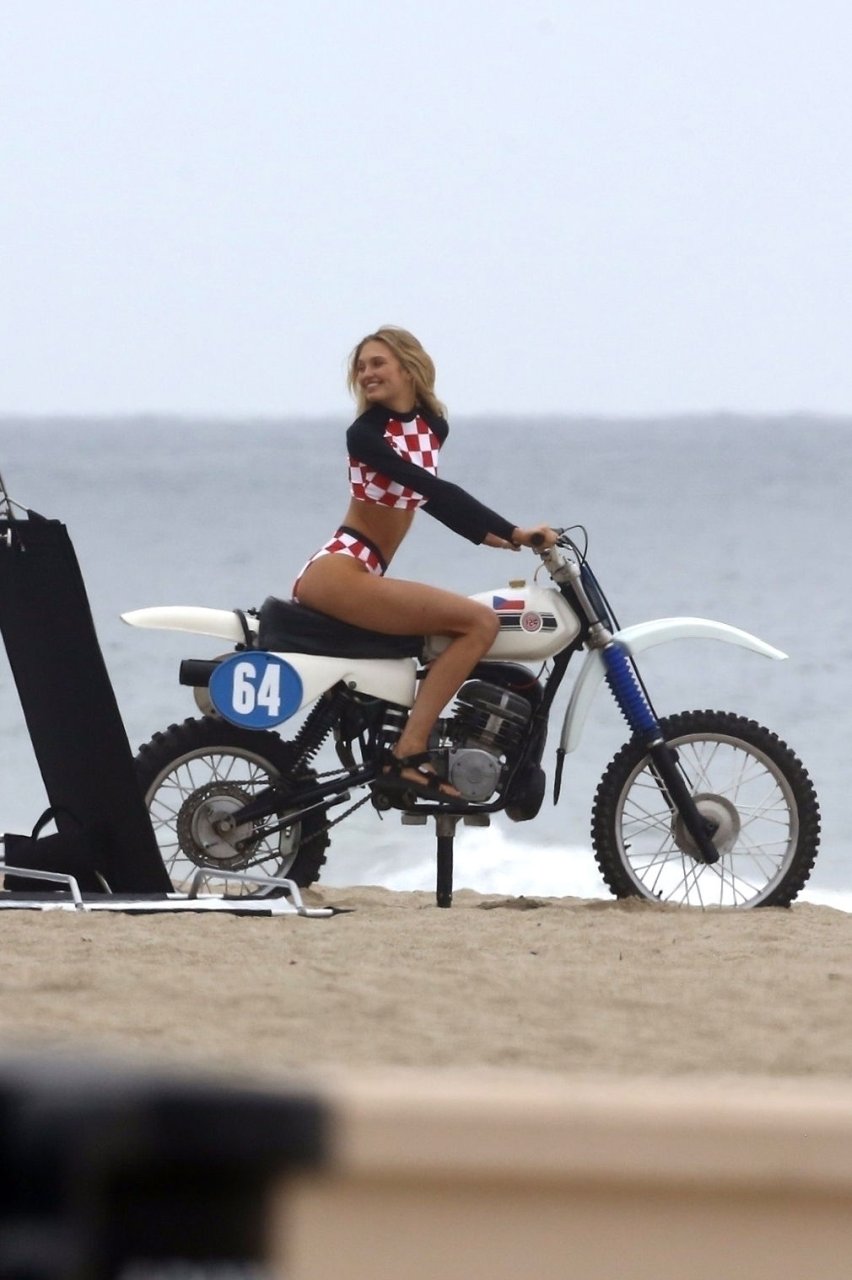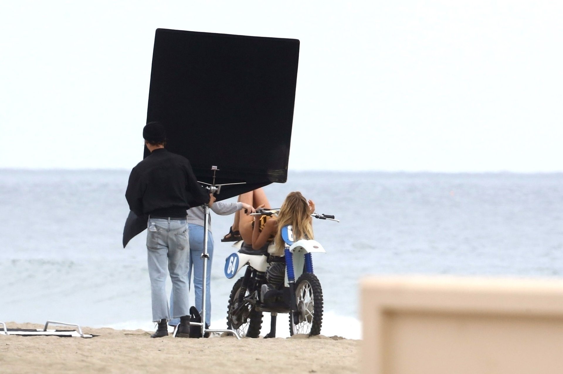 La modella olandese Romee Strijd (22) sfoggia le sue gambe lunghe sulla spiaggia per un servizio fotografico a Malibu, 13/05/2018. Romee indossava un paio di calze sopra il ginocchio, una maglietta tie-dye e slip bikini bianchi per il servizio fotografico.