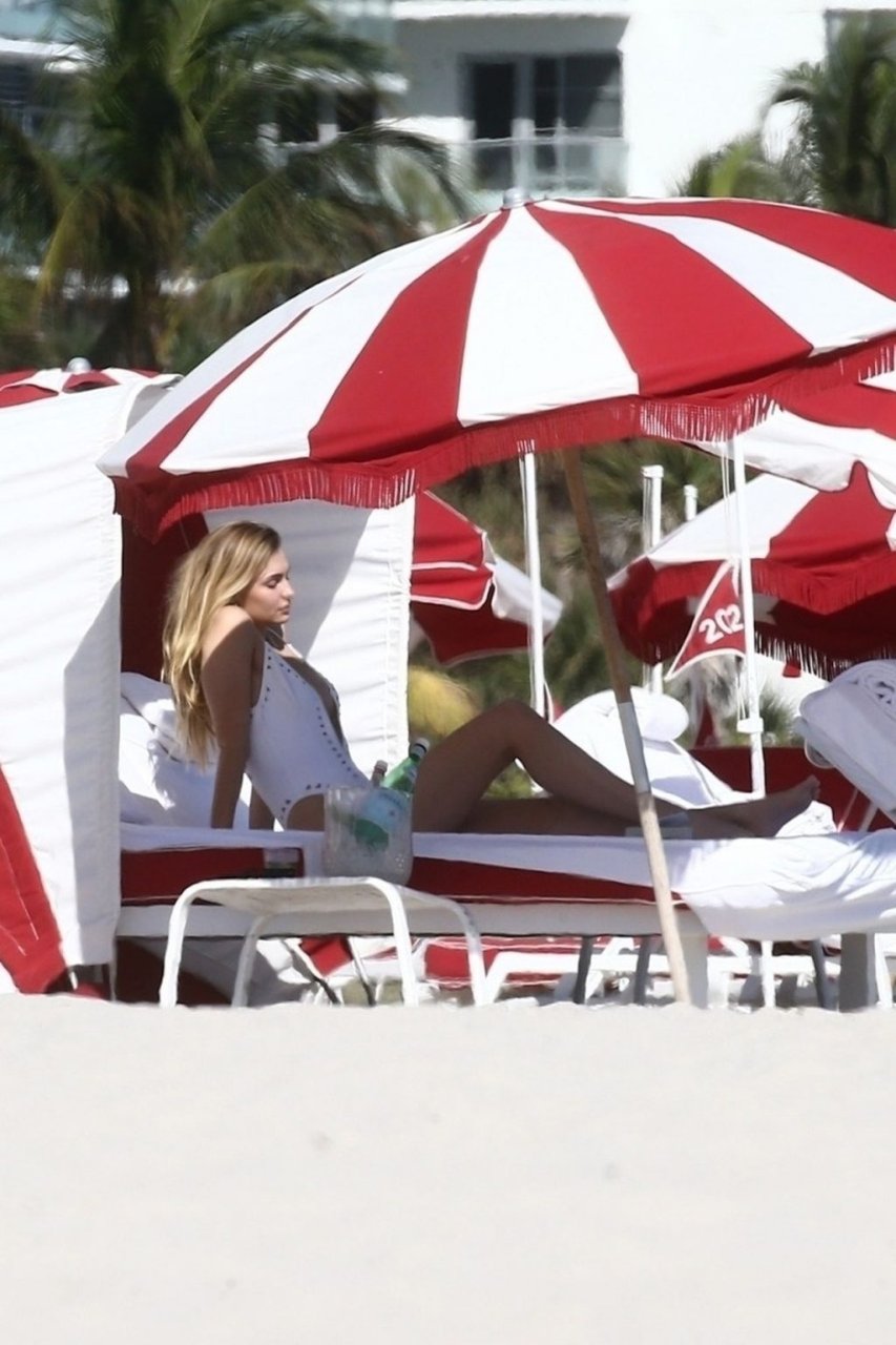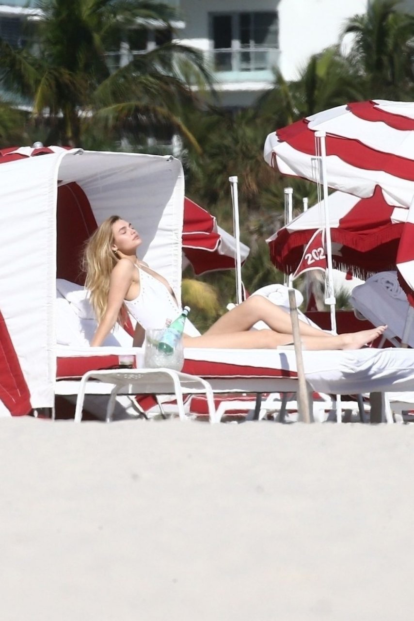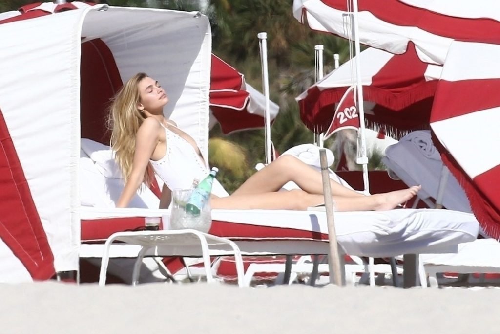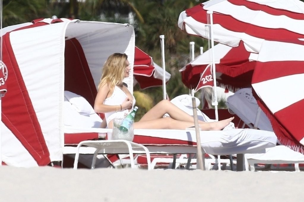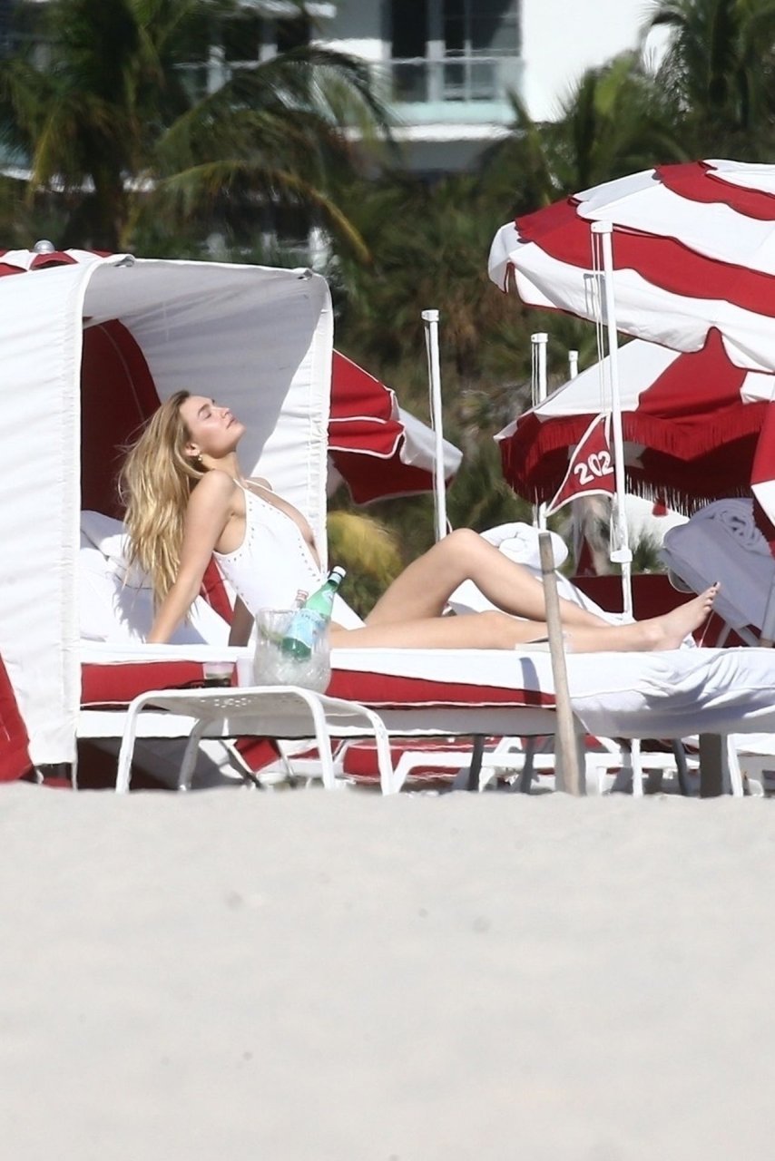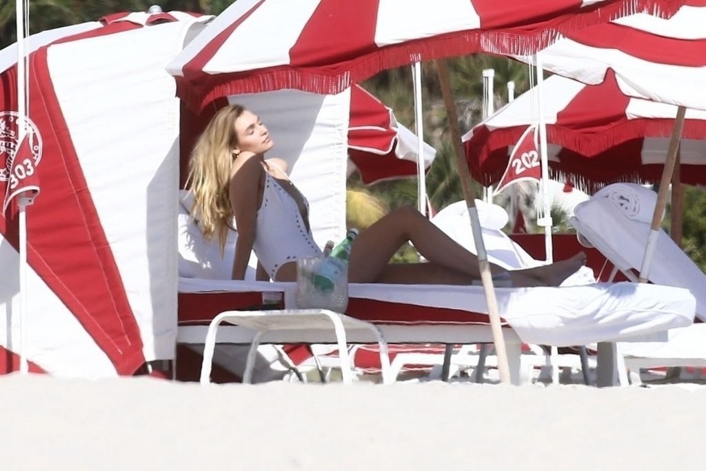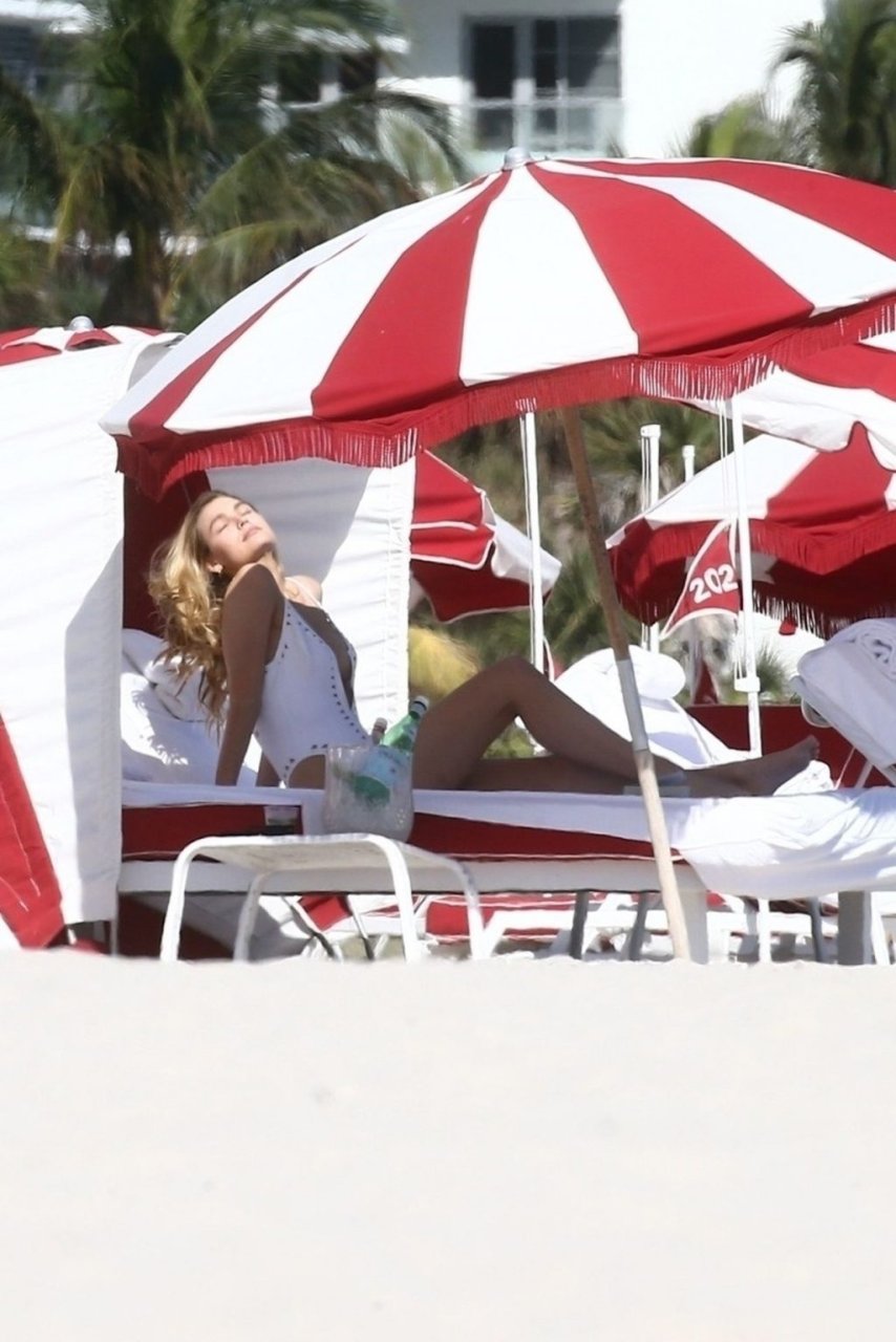 Victoria’s Secret Angel Roosmarijn de Kok (24) si gode una giornata in spiaggia a Miami, 01/06/2019. Roosmarijn (Roos) appare splendida in un costume intero bianco mentre si rilassa al sole e tra le onde.