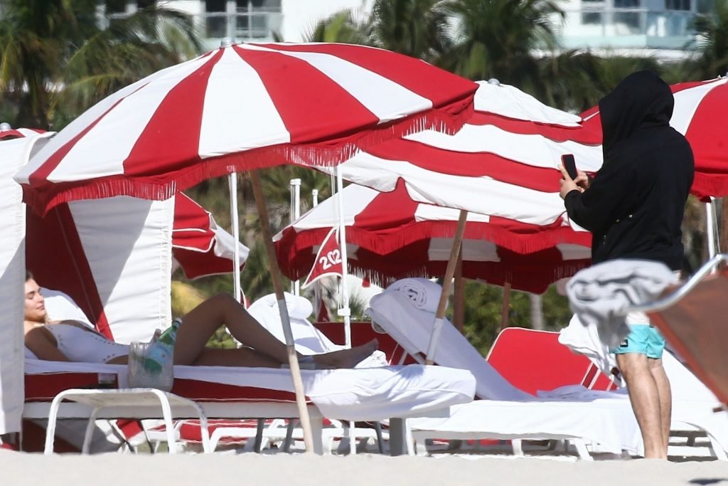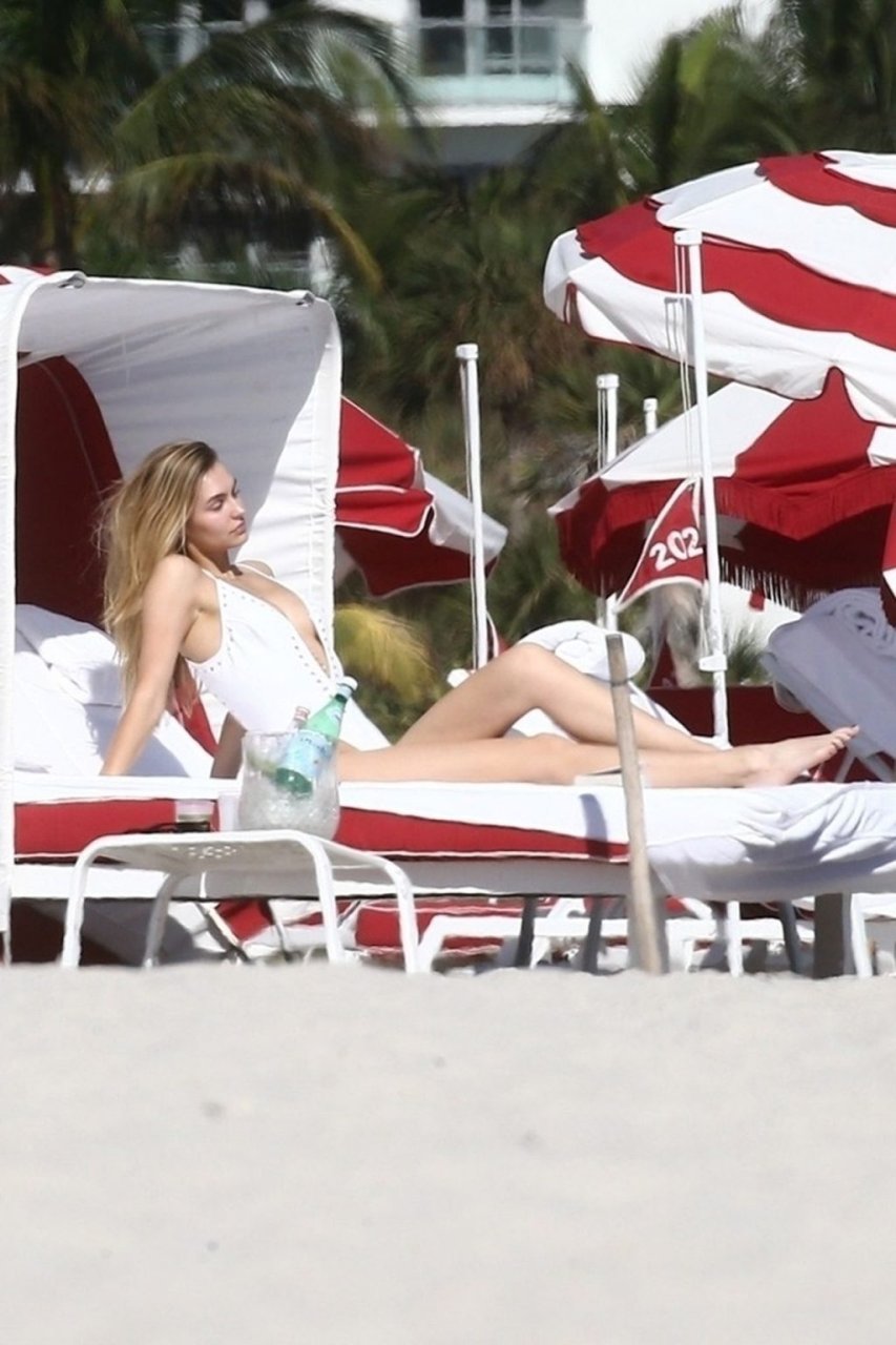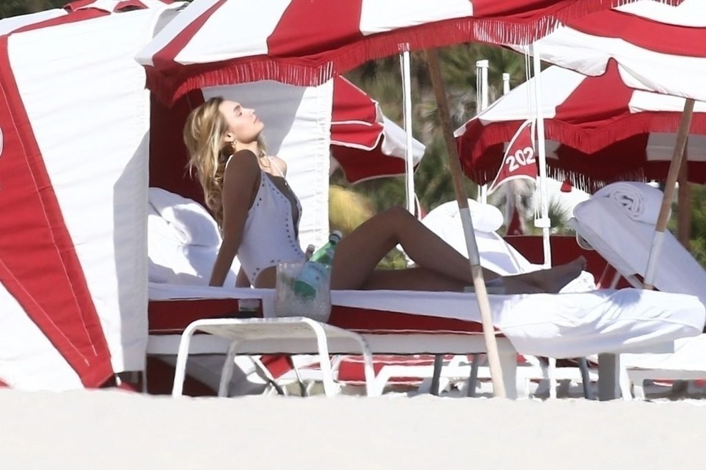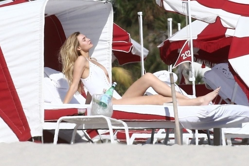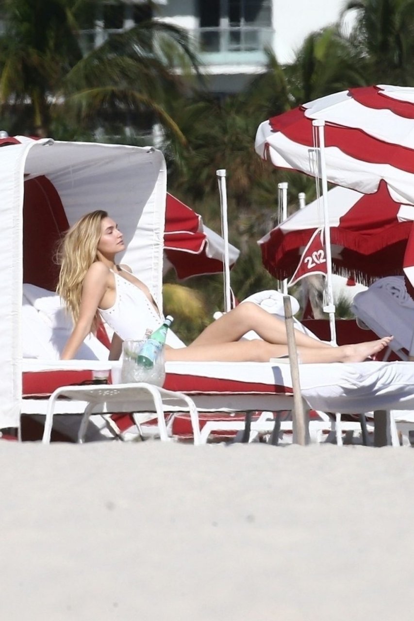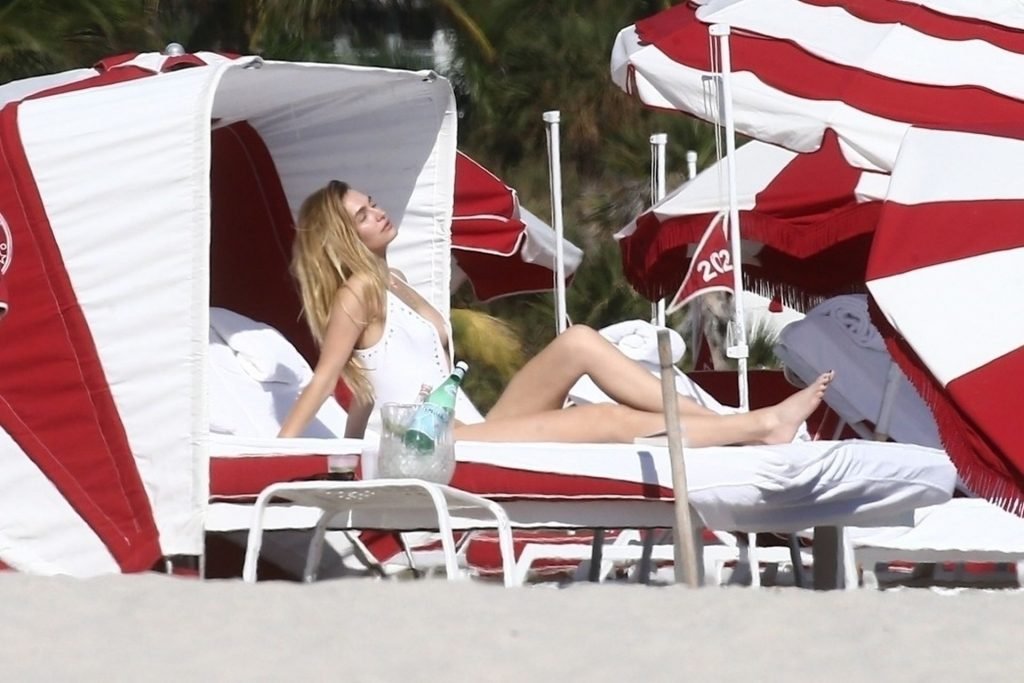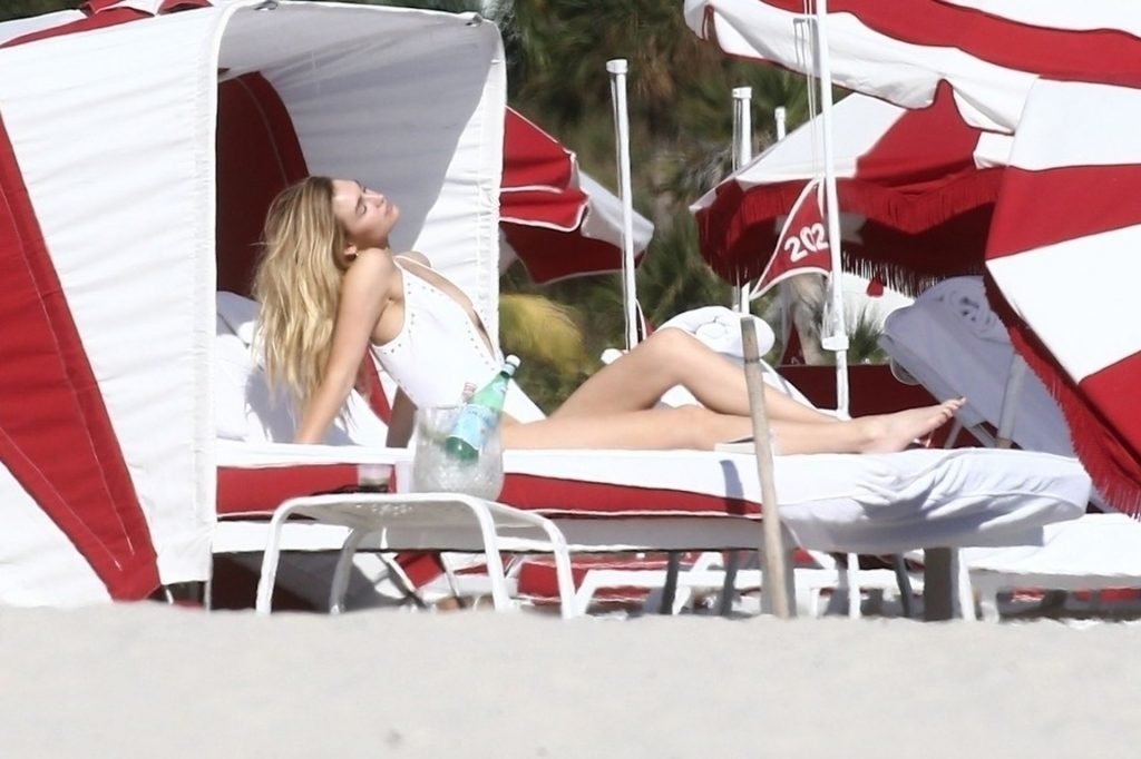 Victoria’s Secret Angel Roosmarijn de Kok (24) si gode una giornata in spiaggia a Miami, 01/06/2019. Roosmarijn (Roos) appare splendida in un costume intero bianco mentre si rilassa al sole e tra le onde.