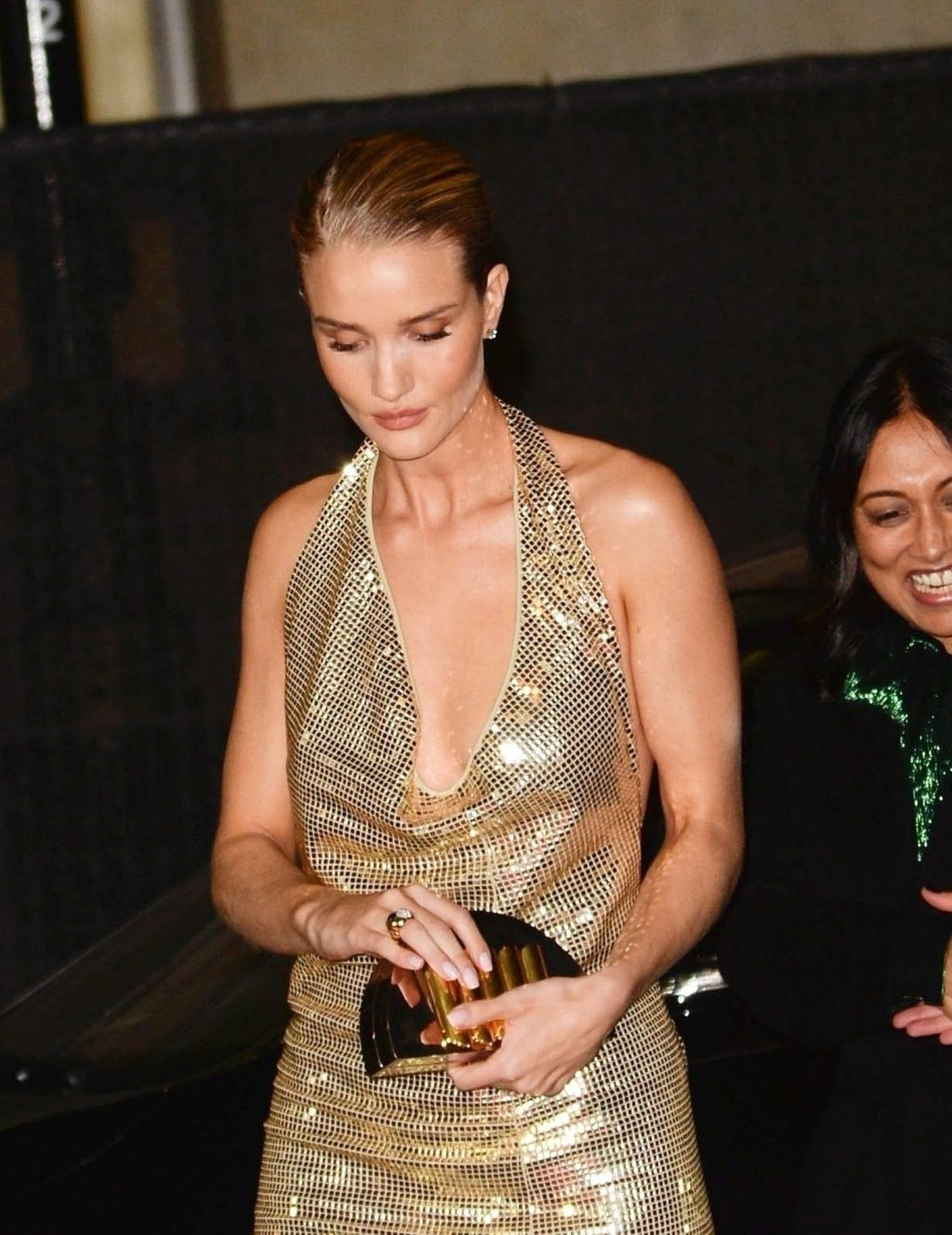 La modella e attrice inglese Rosie Huntington-Whiteley posa con un abito dorato sul red carpet all’arrivo ai Fashion Awards 2019 a Londra, 12/02/2019.
