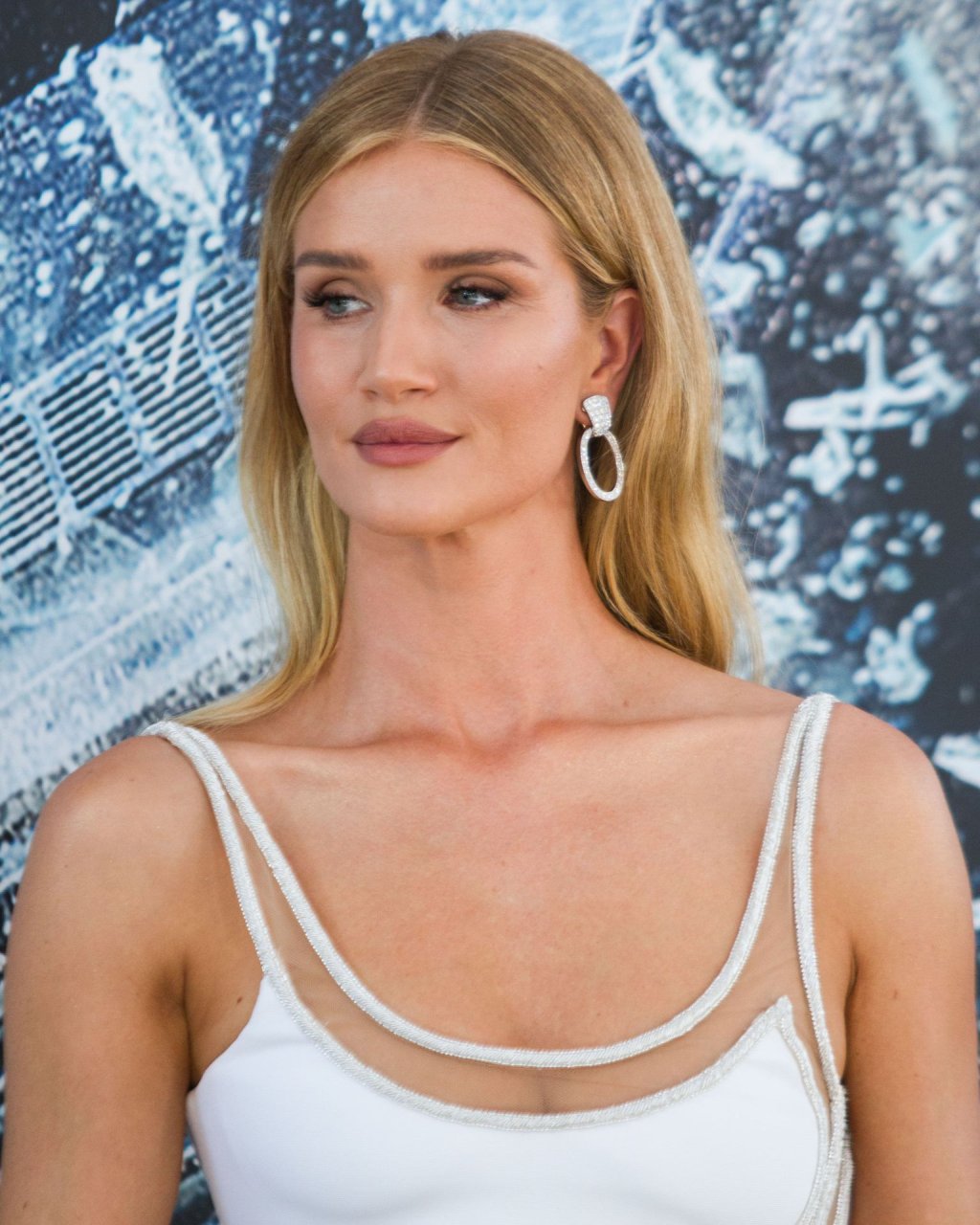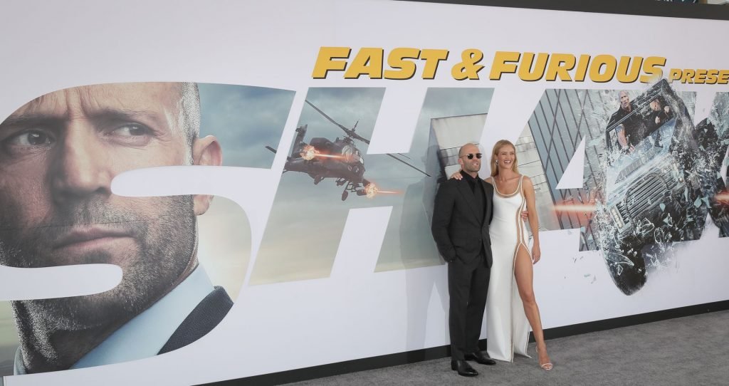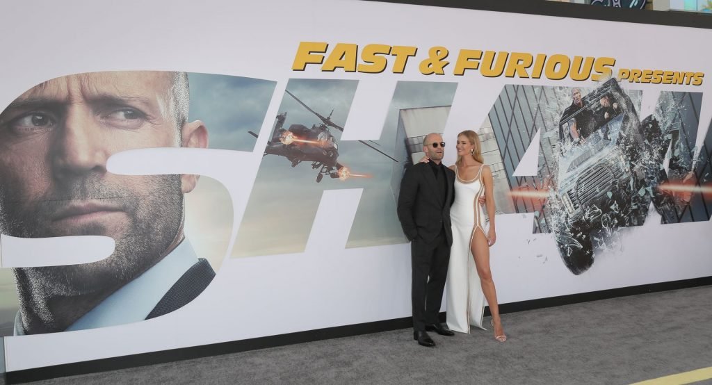 Rosie Huntington-Whiteley arriva con Jason Statham alla prima di “Fast & Furious Presents: Hobbs & Shaw” di Universal Pictures al Dolby Theatre di Hollywood, 13/07/2019. La modella ha mostrato la sua sexy gamba indossando un abito bianco attillato.