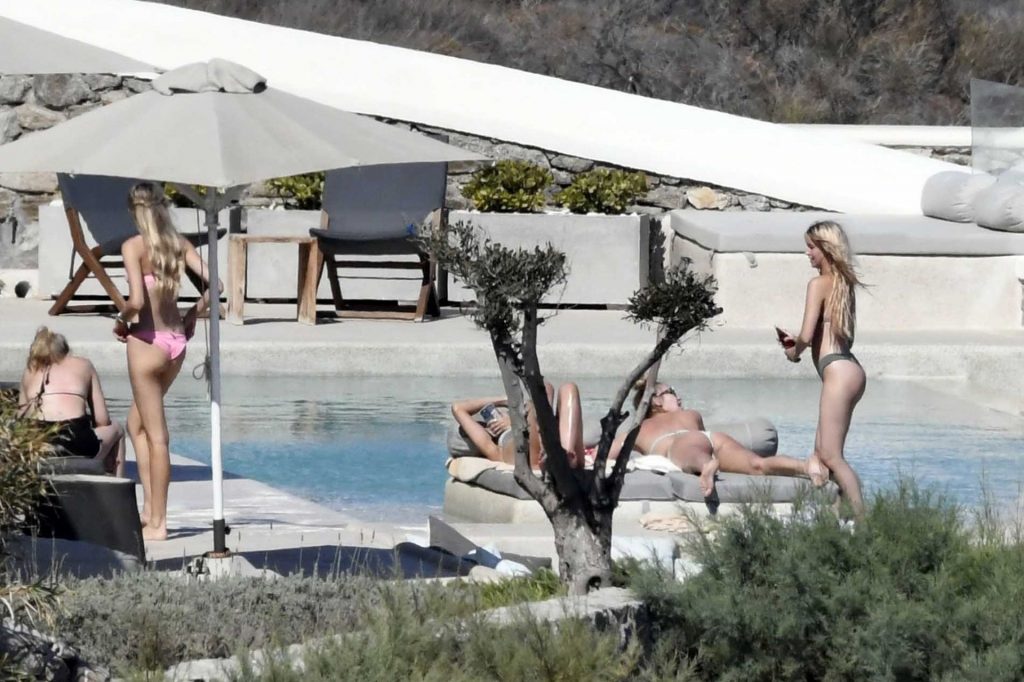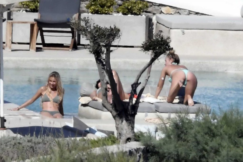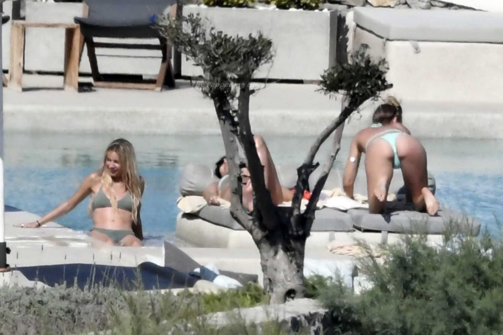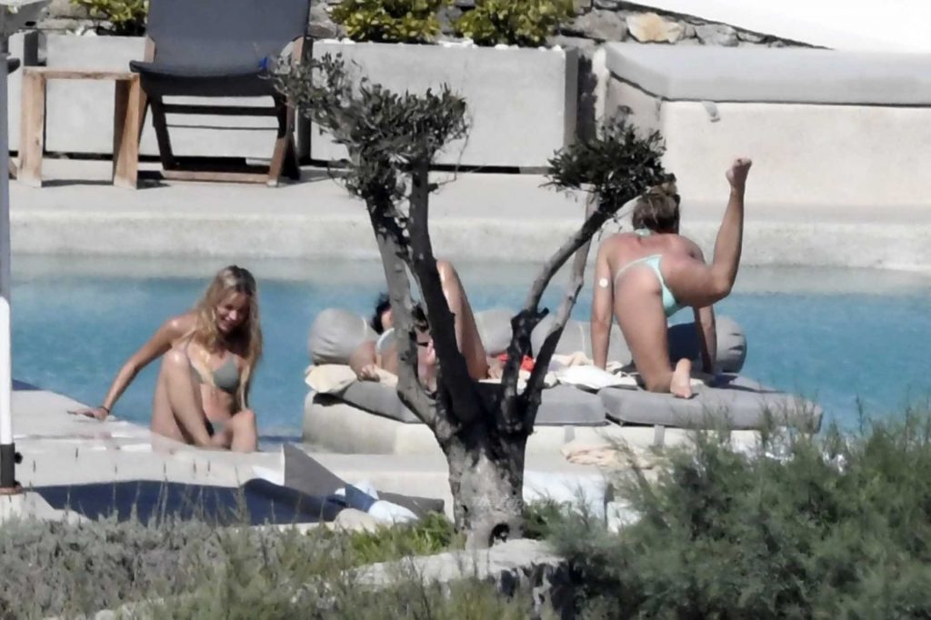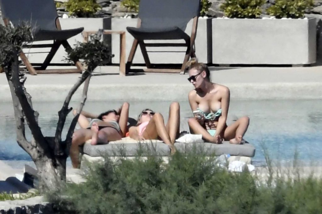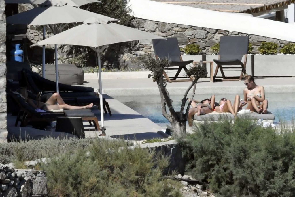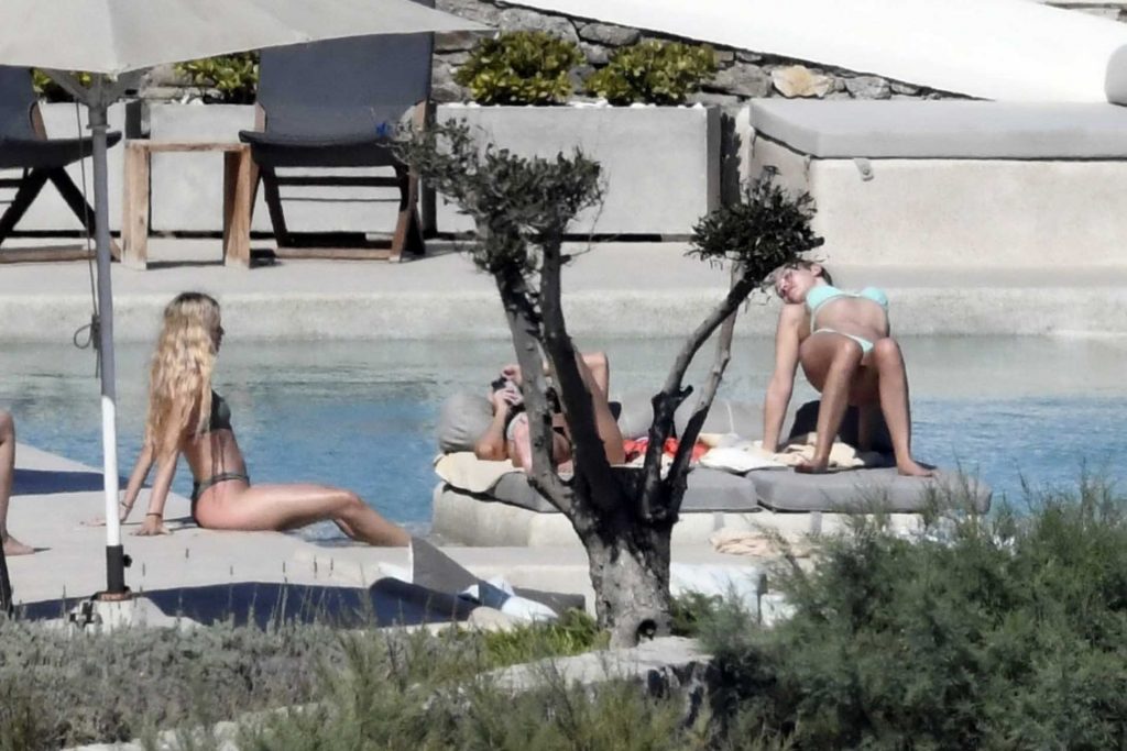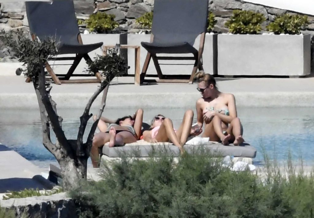 Le due bellezze in bikini e anche topless si rilassano e scherzano con altri amici mentre prendono il sole a bordo piscina durante la loro vacanza a Mykonos.