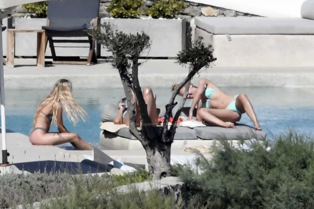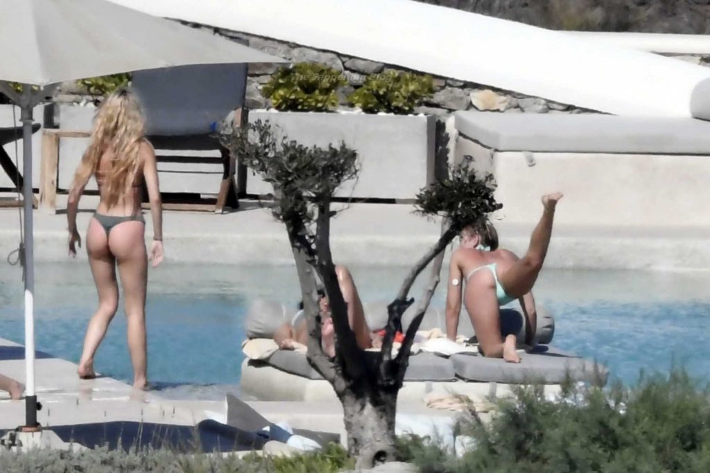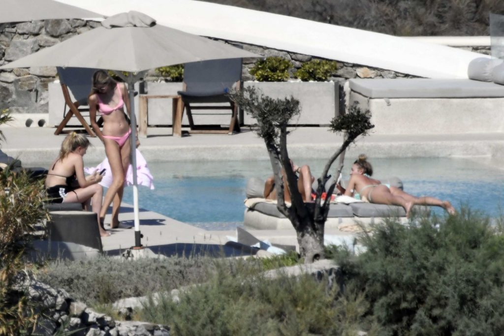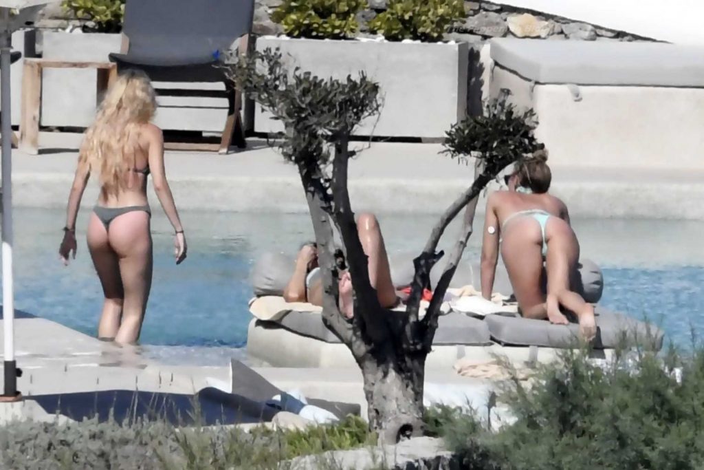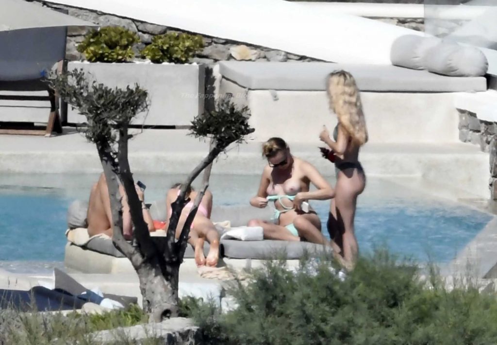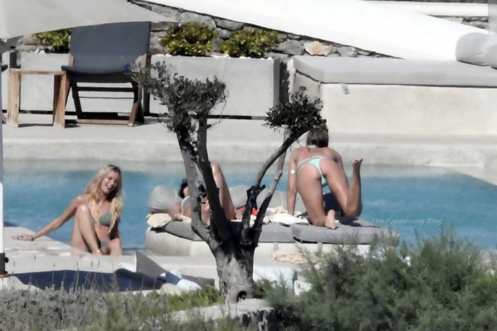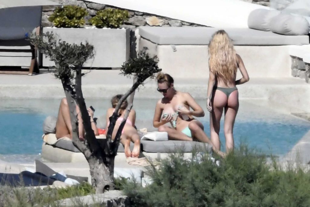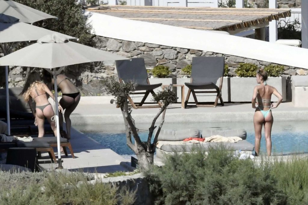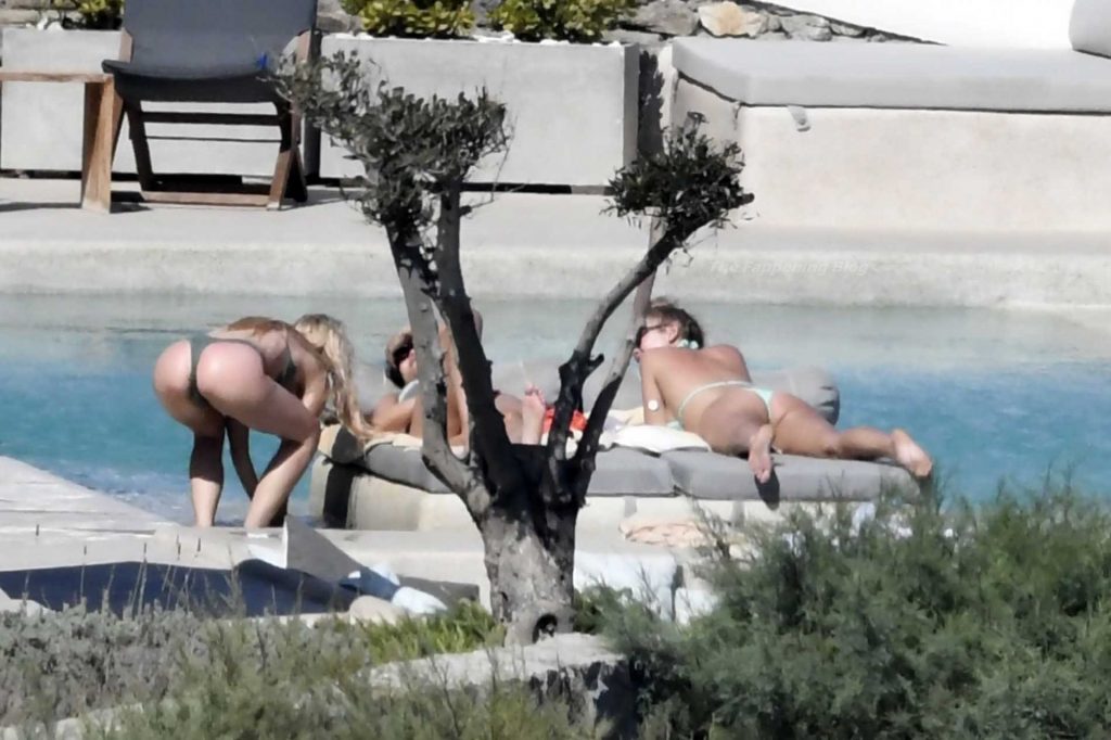 Le due bellezze in bikini e anche topless si rilassano e scherzano con altri amici mentre prendono il sole a bordo piscina durante la loro vacanza a Mykonos.