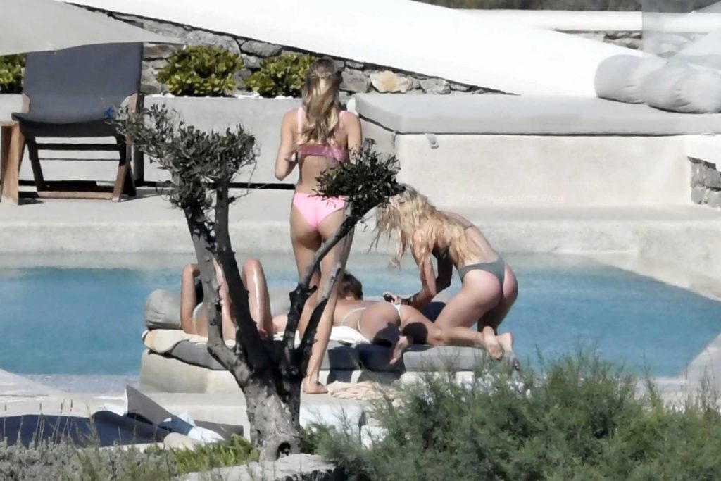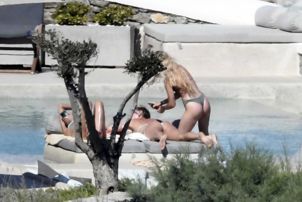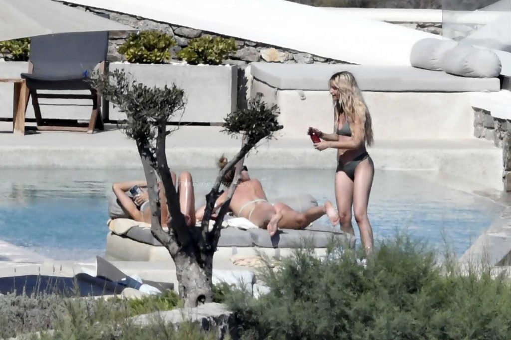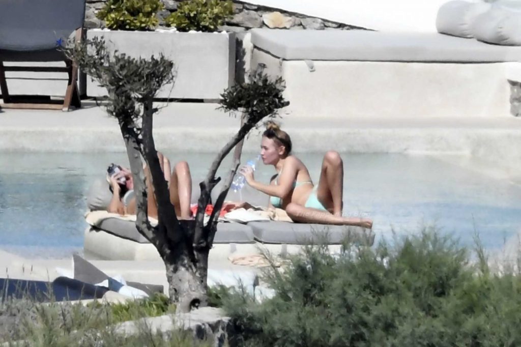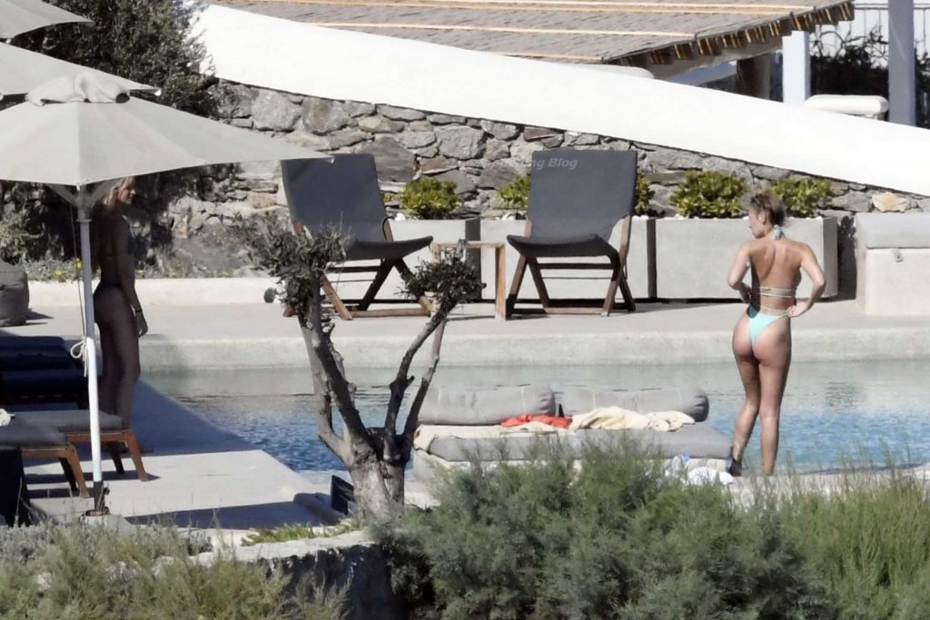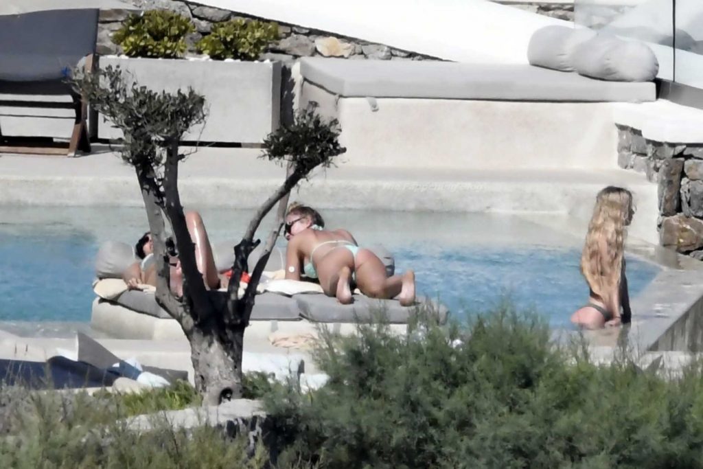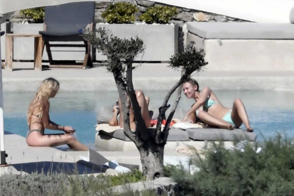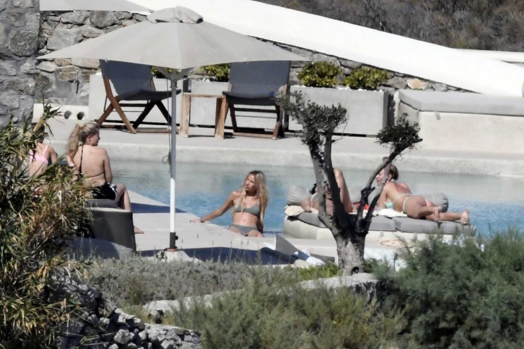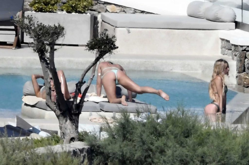 Le due bellezze in bikini e anche topless si rilassano e scherzano con altri amici mentre prendono il sole a bordo piscina durante la loro vacanza a Mykonos.
