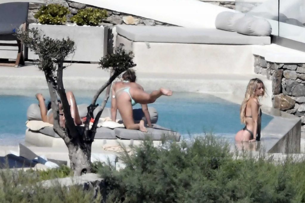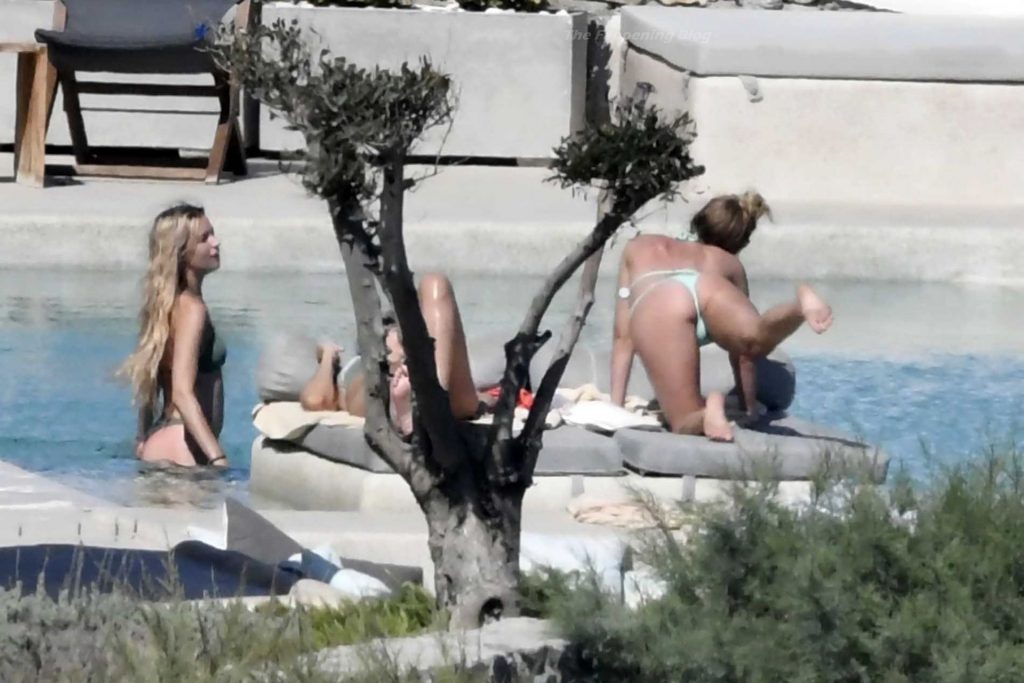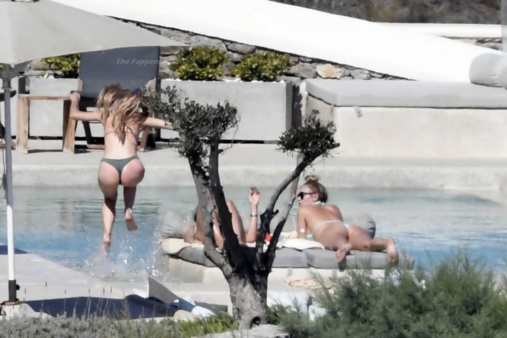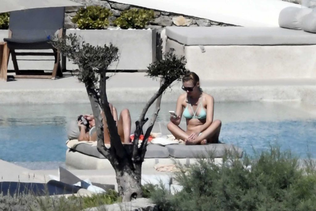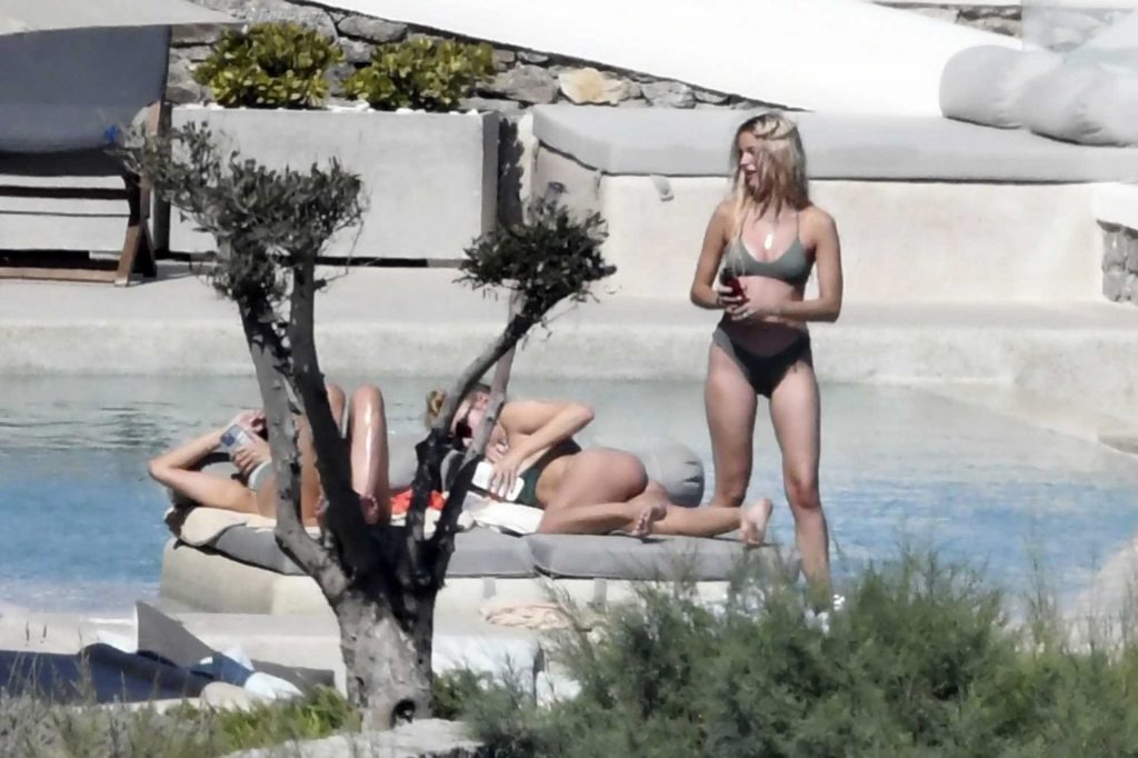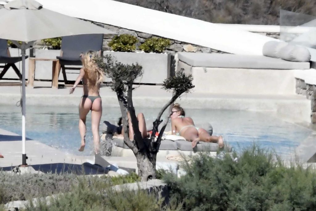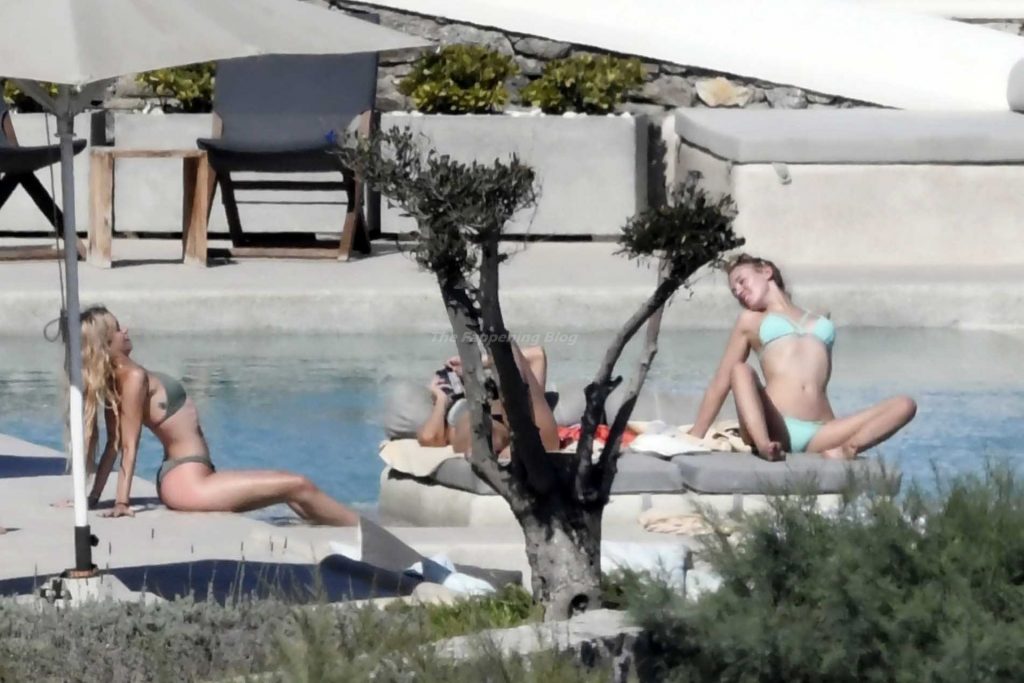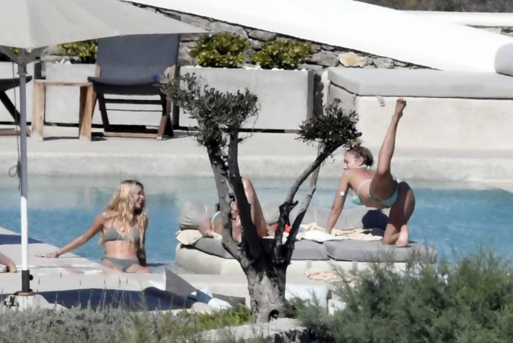 Le due bellezze in bikini e anche topless si rilassano e scherzano con altri amici mentre prendono il sole a bordo piscina durante la loro vacanza a Mykonos.