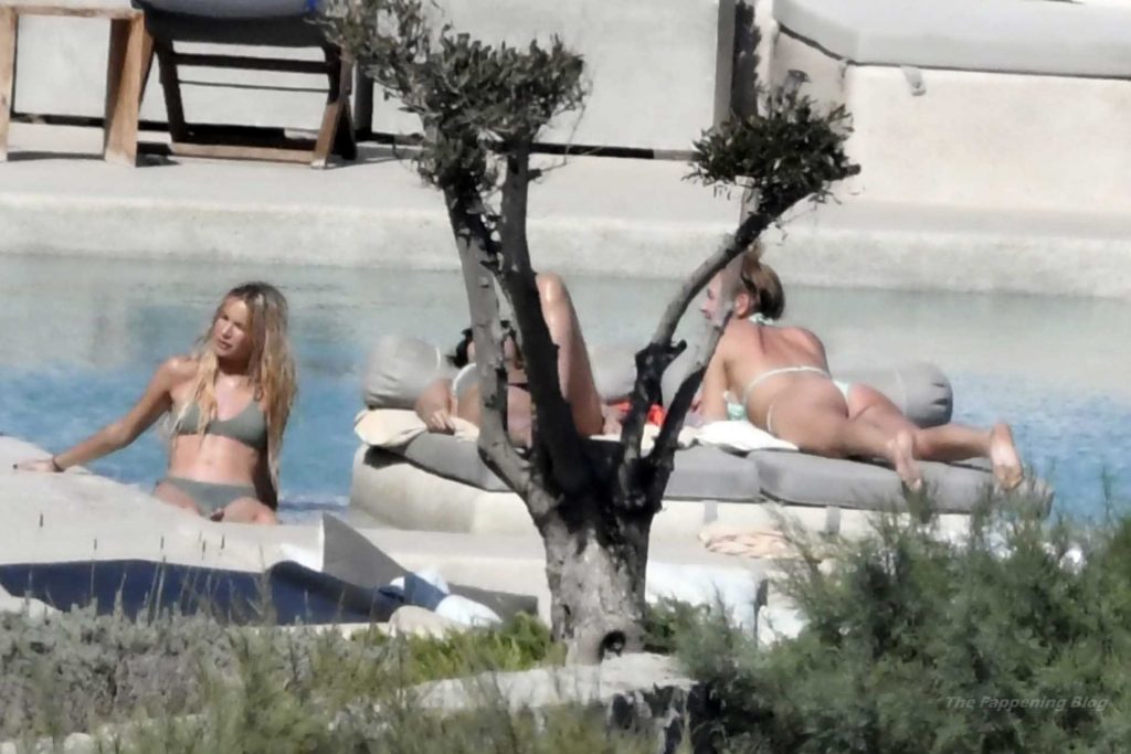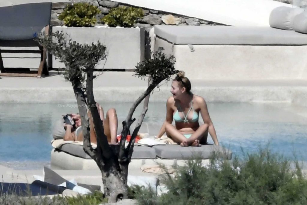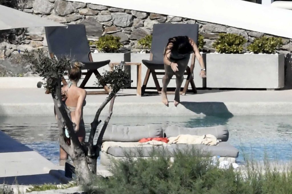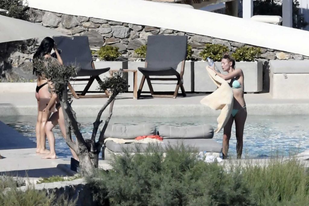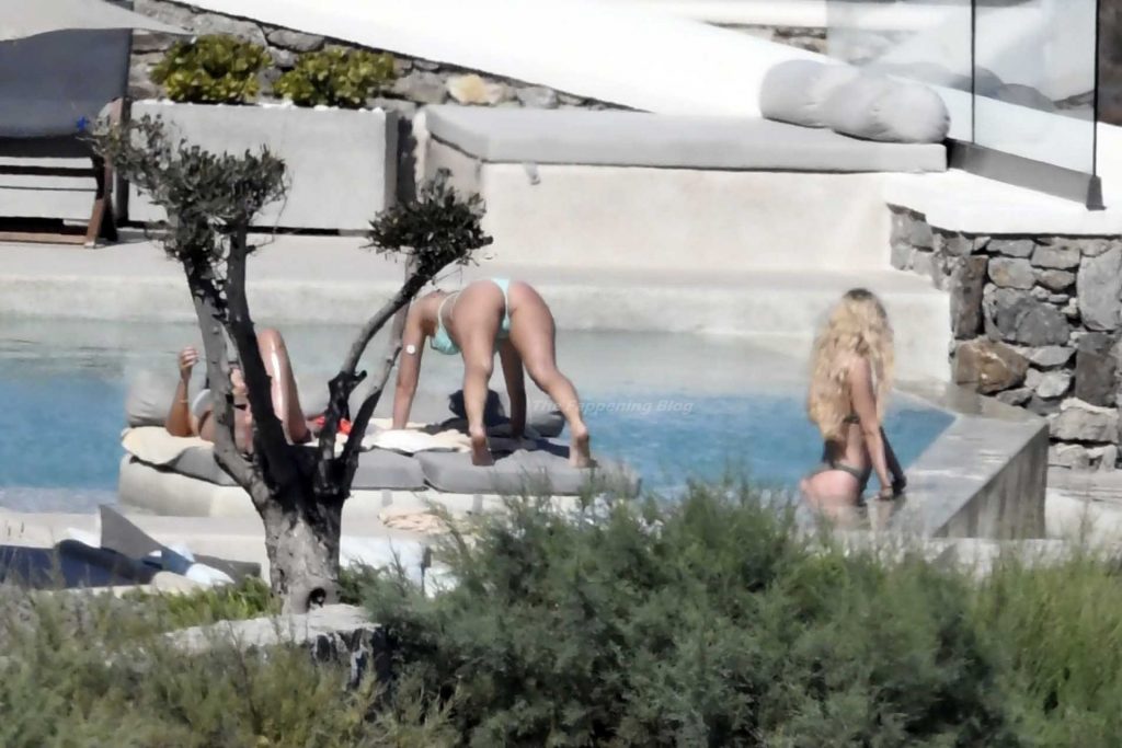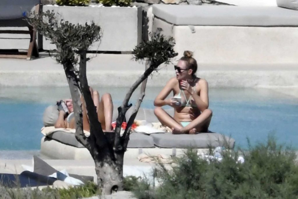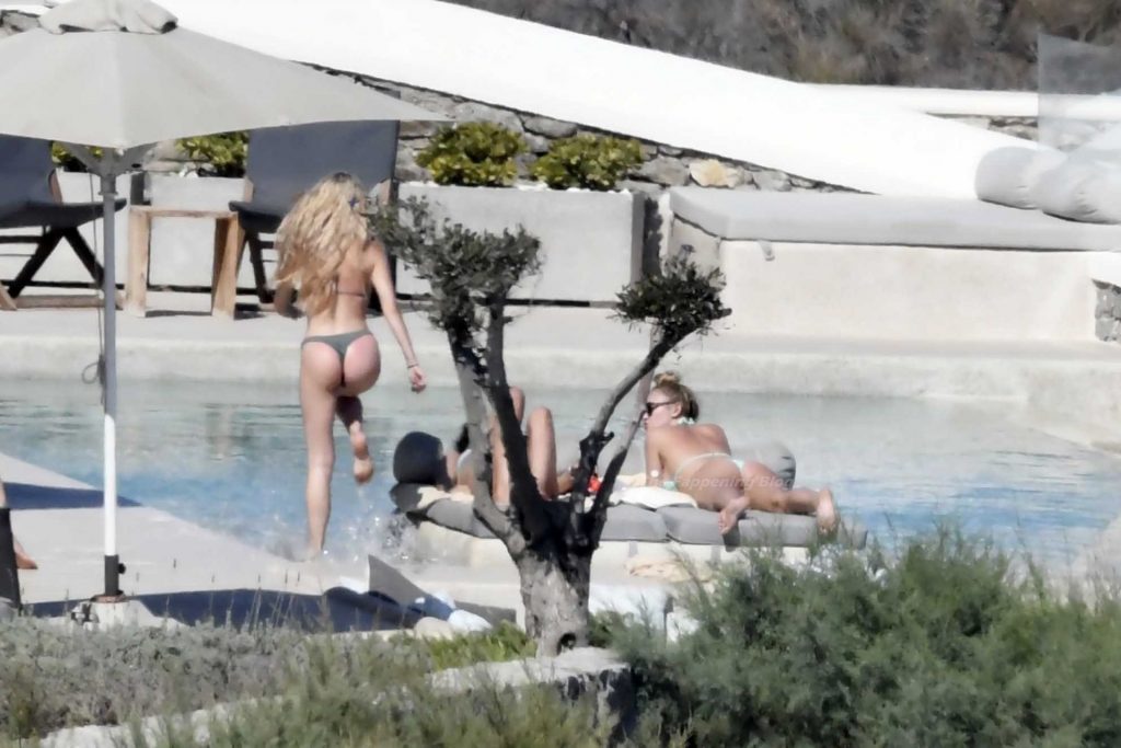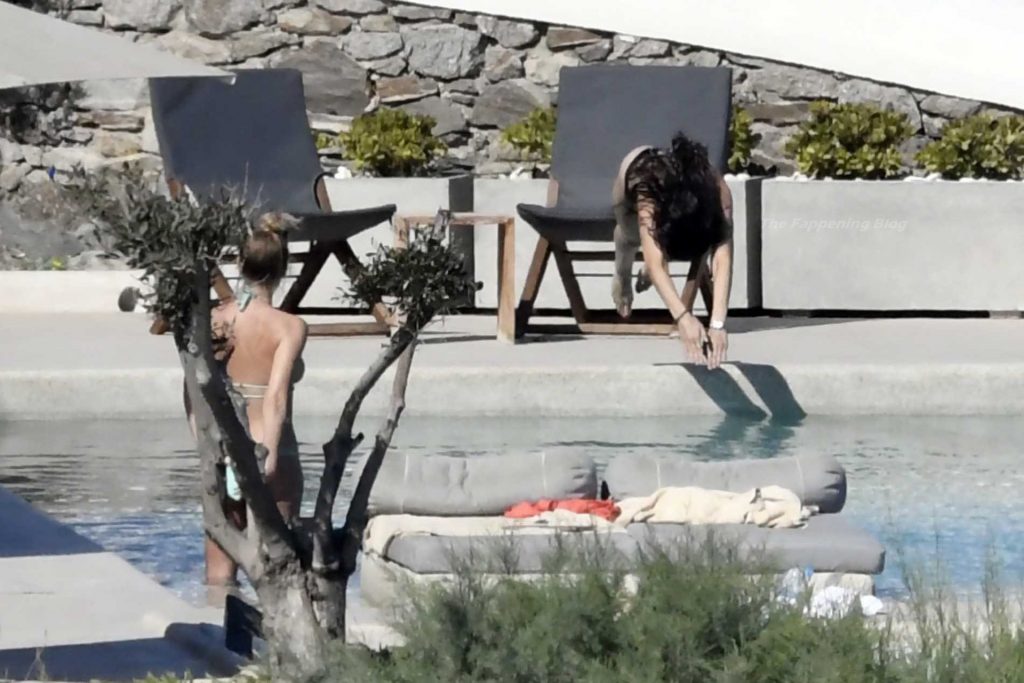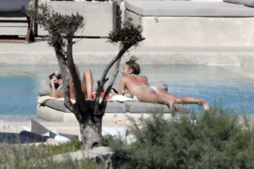 Le due bellezze in bikini e anche topless si rilassano e scherzano con altri amici mentre prendono il sole a bordo piscina durante la loro vacanza a Mykonos.
