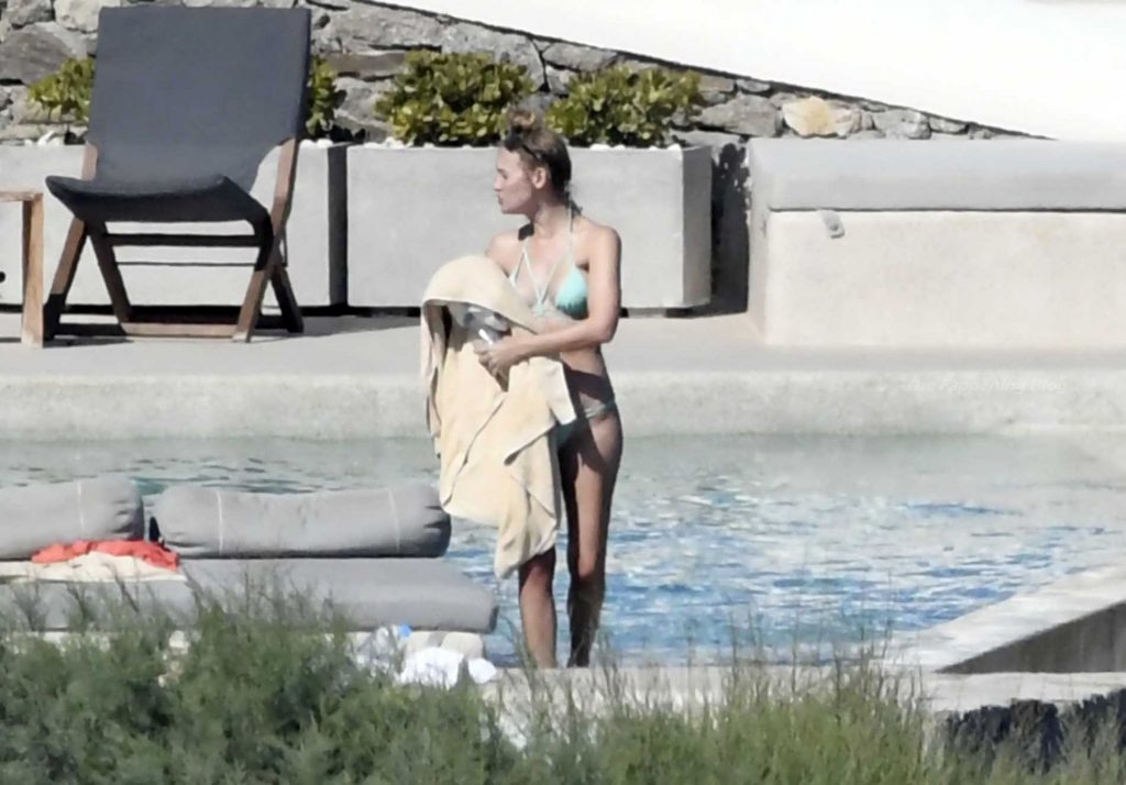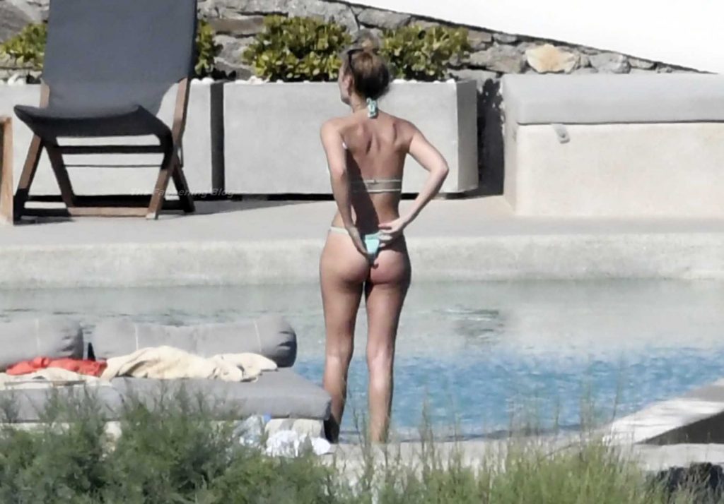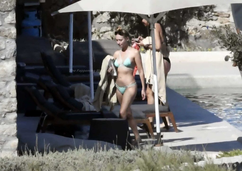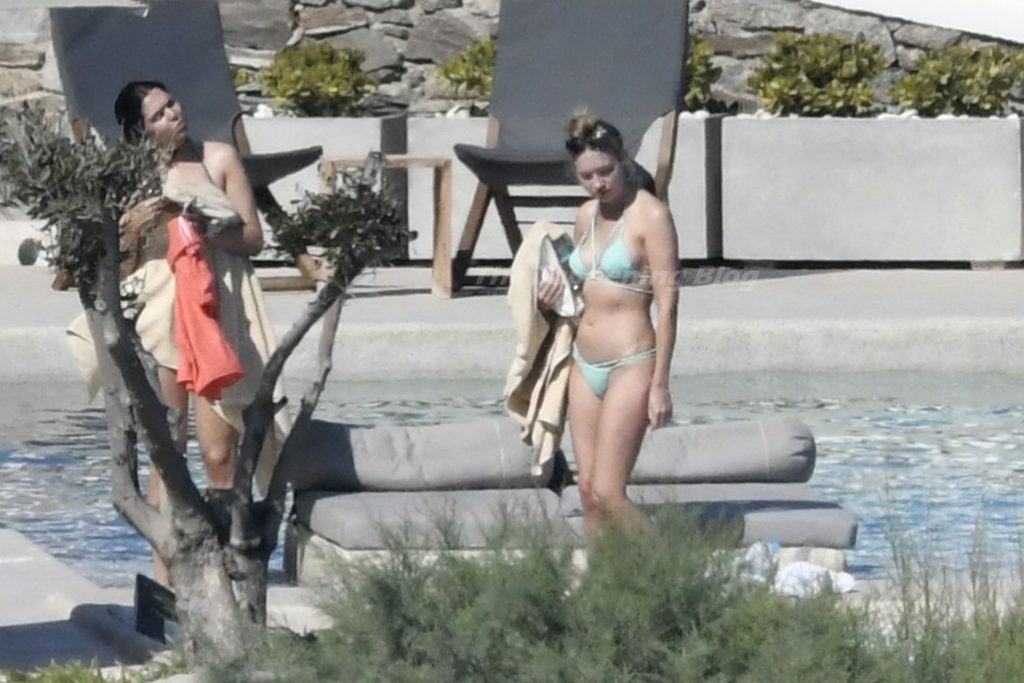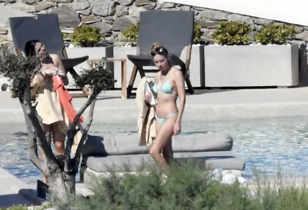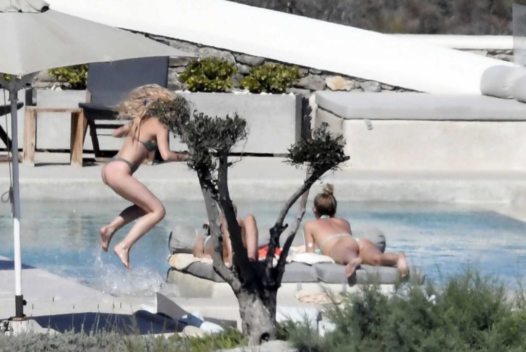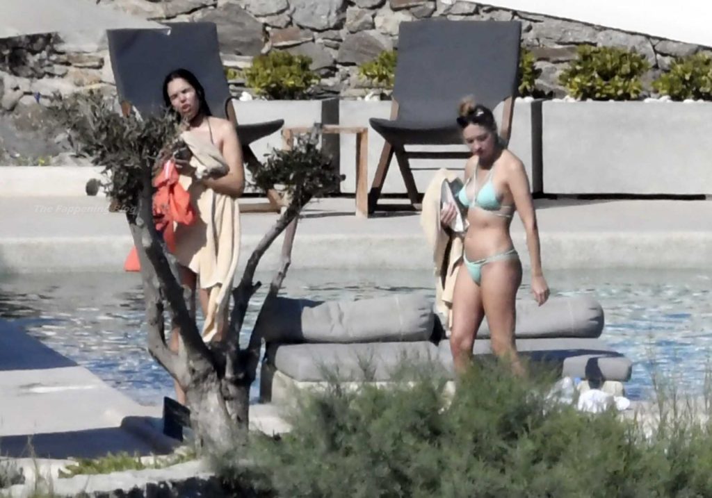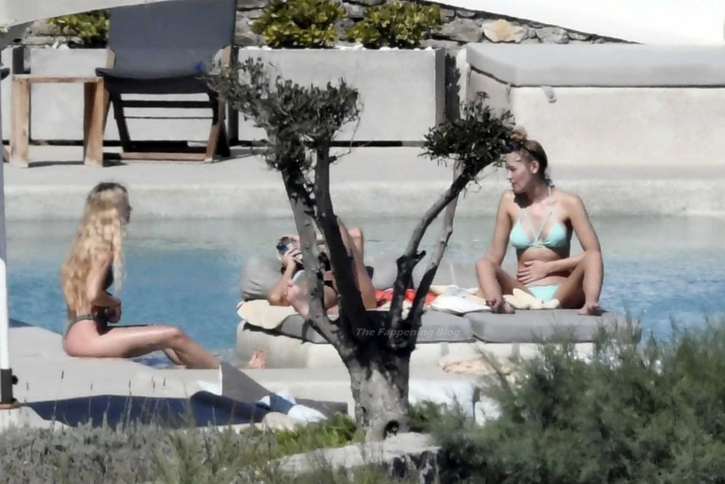 Le due bellezze in bikini e anche topless si rilassano e scherzano con altri amici mentre prendono il sole a bordo piscina durante la loro vacanza a Mykonos.