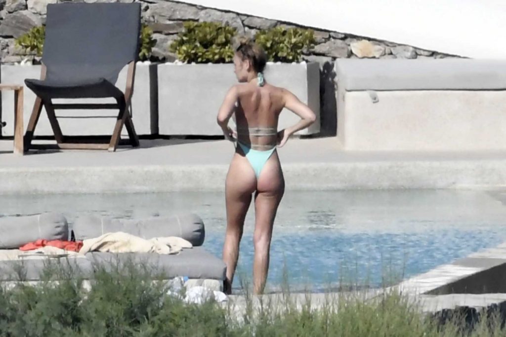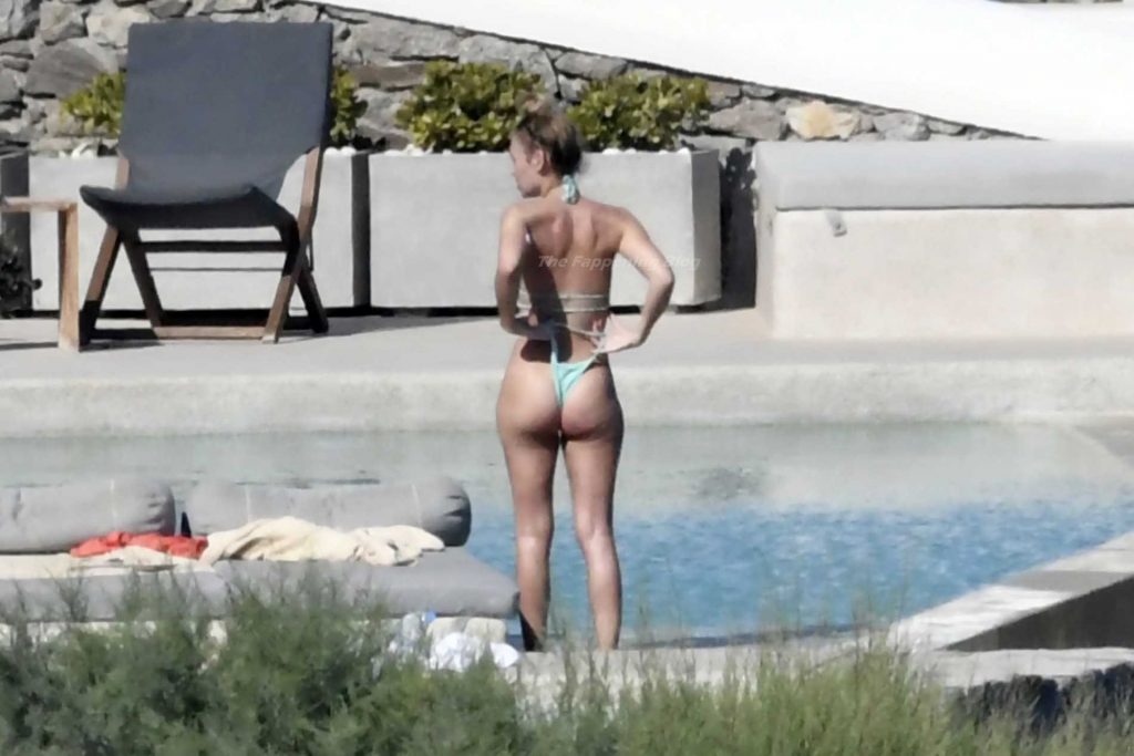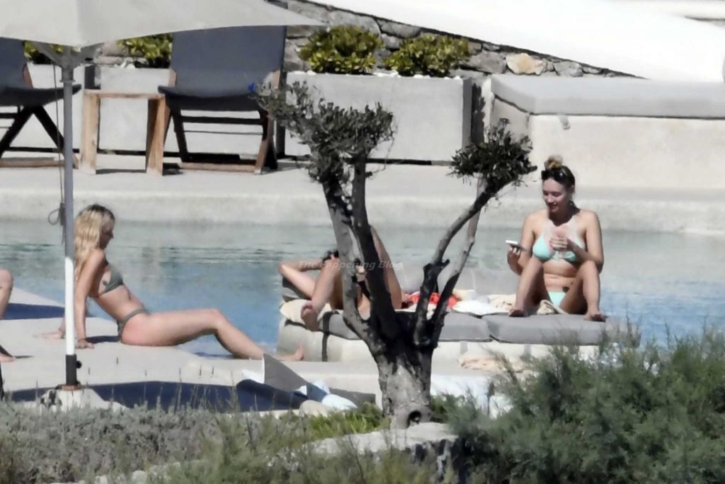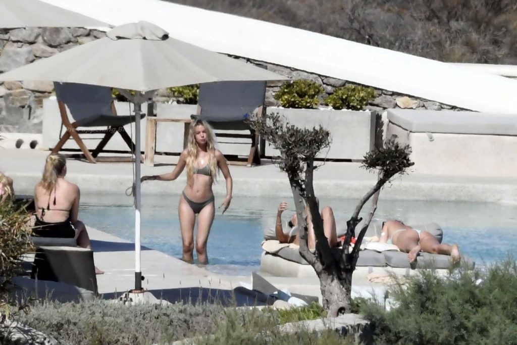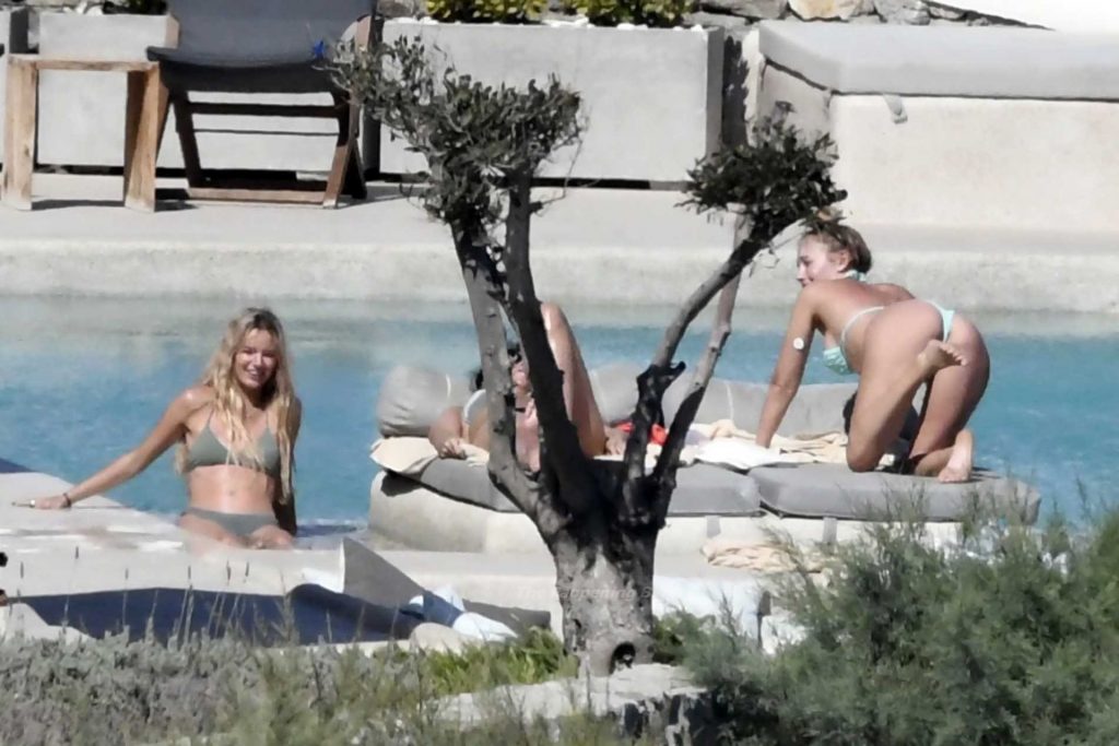 Modelle Roxy Horner, fidanzata dell’attore Jack Peter Benedict Whitehall, Sophie Longford e Sarah Elizabeth Lovegrove si godono l’estate greca a bordo piscina, 16/08/2021.