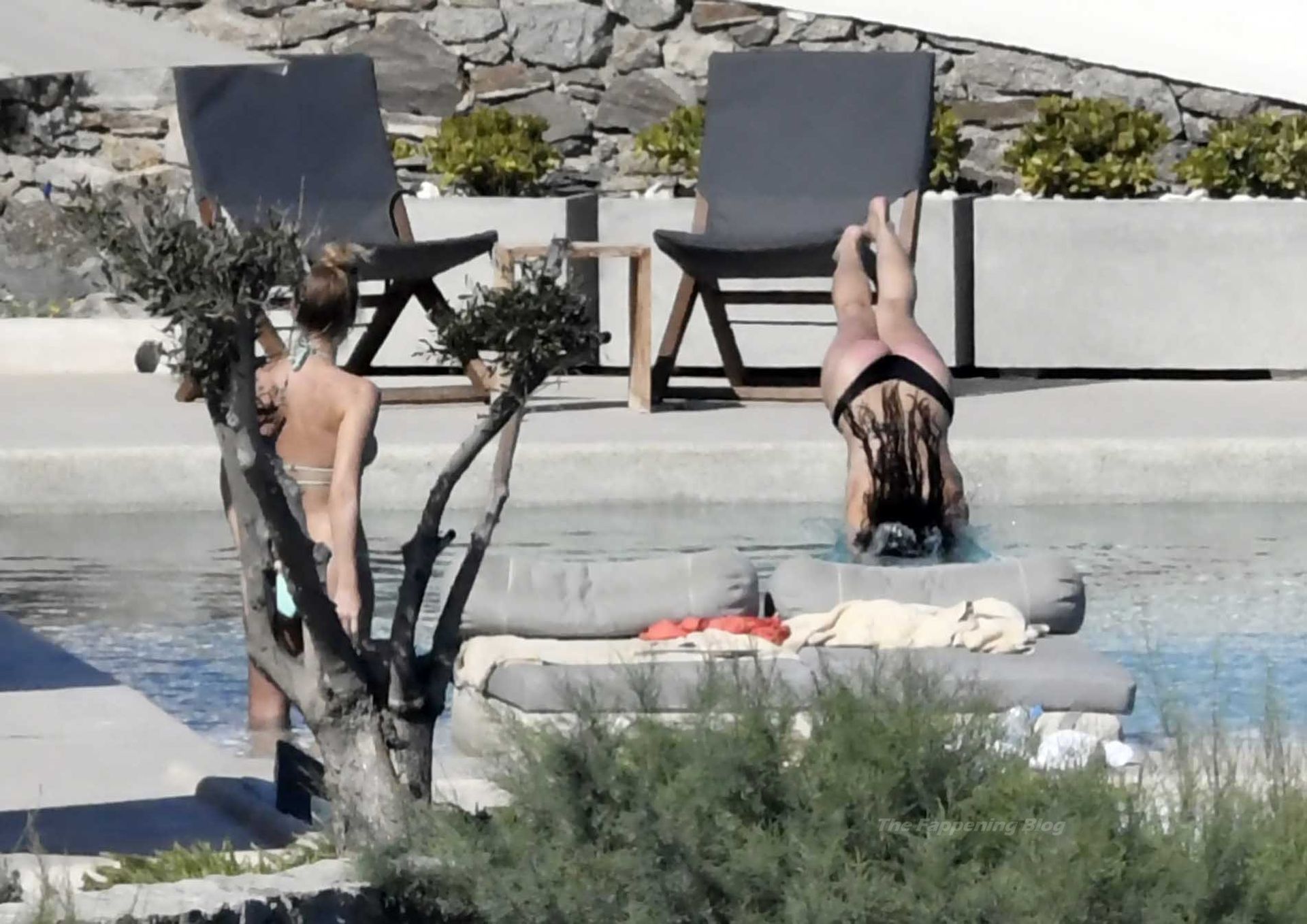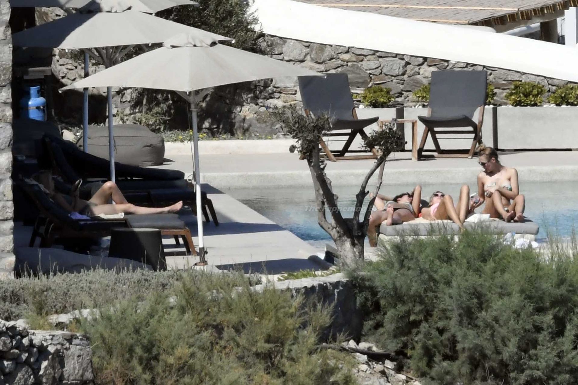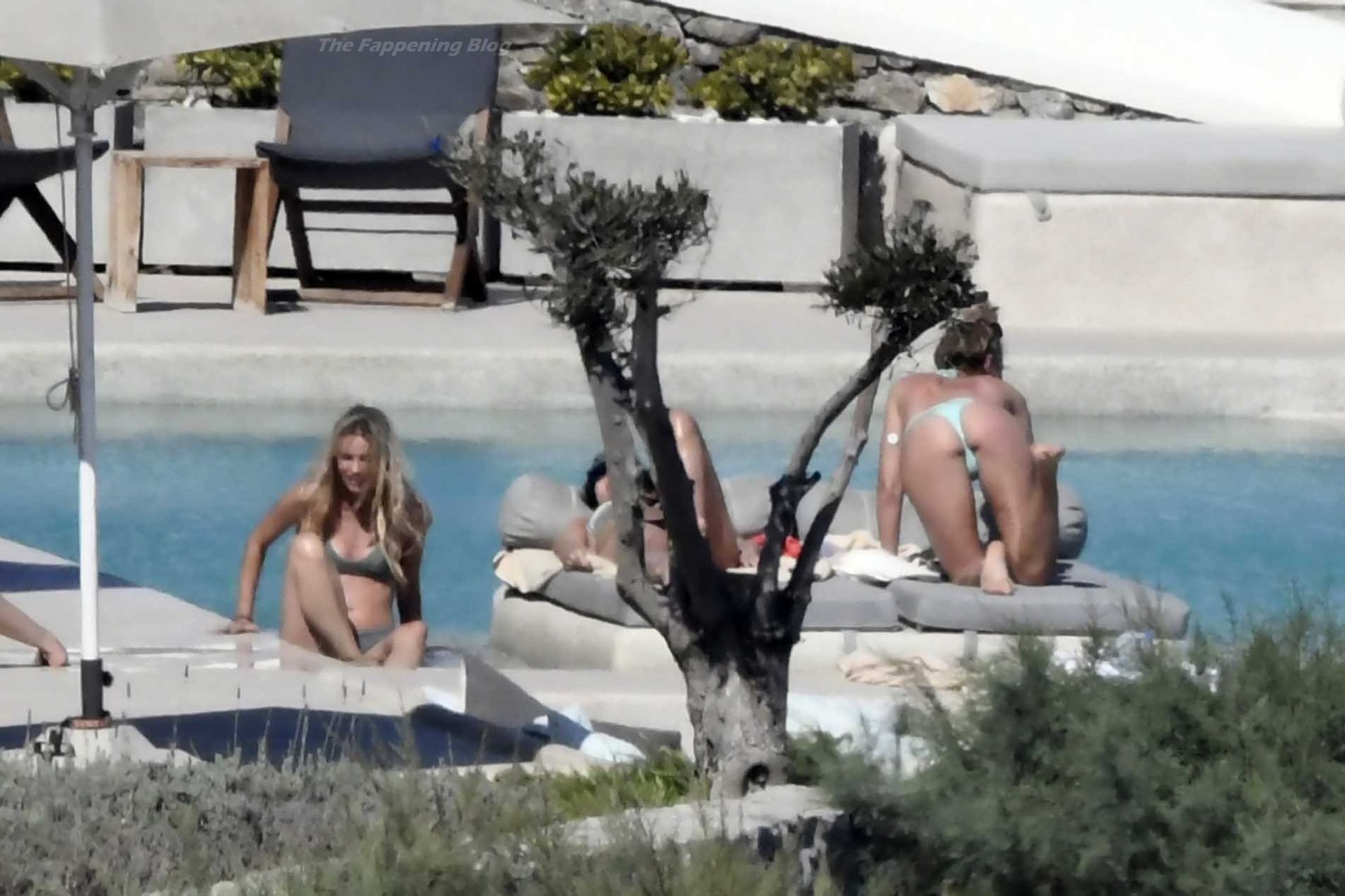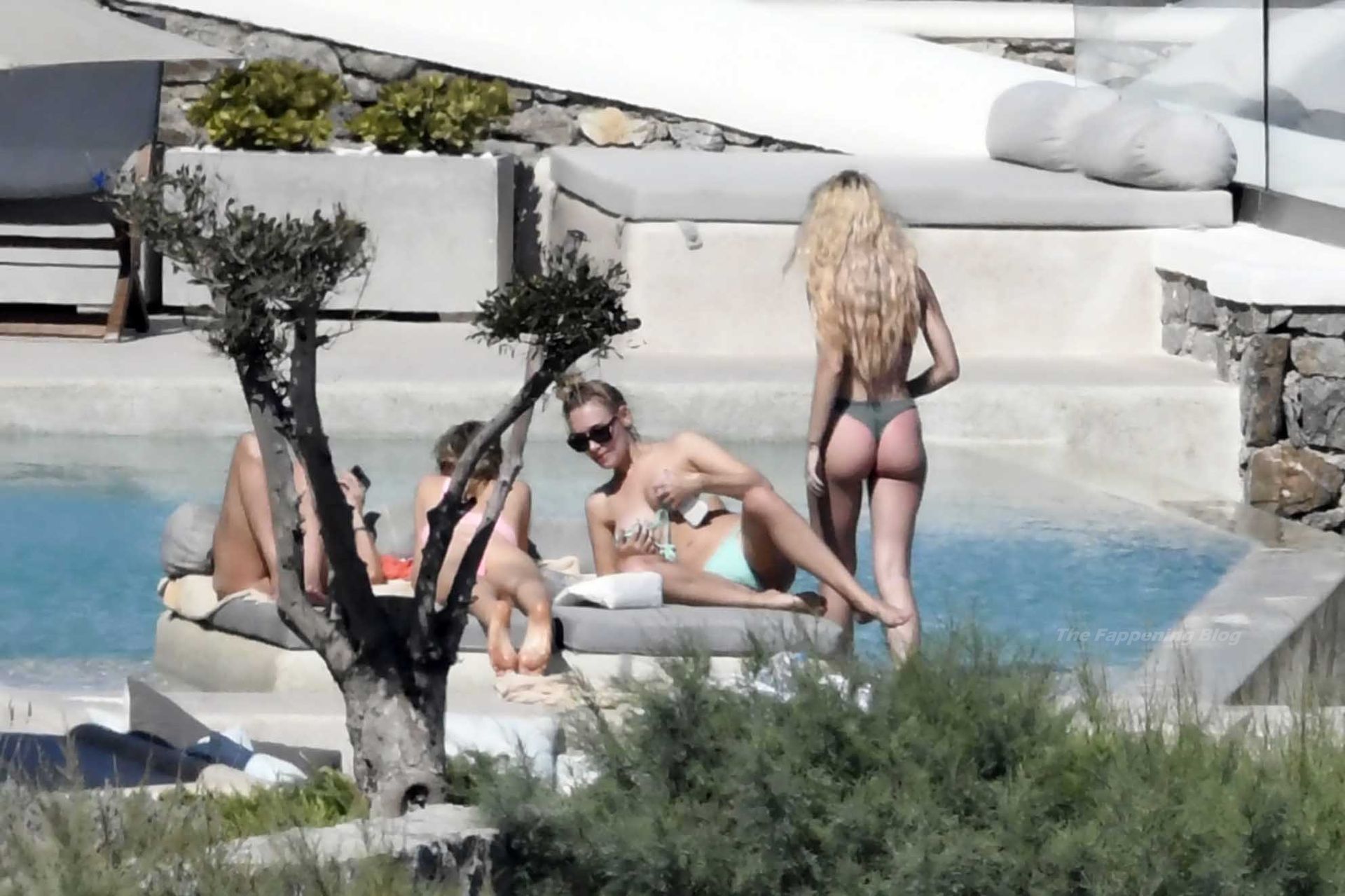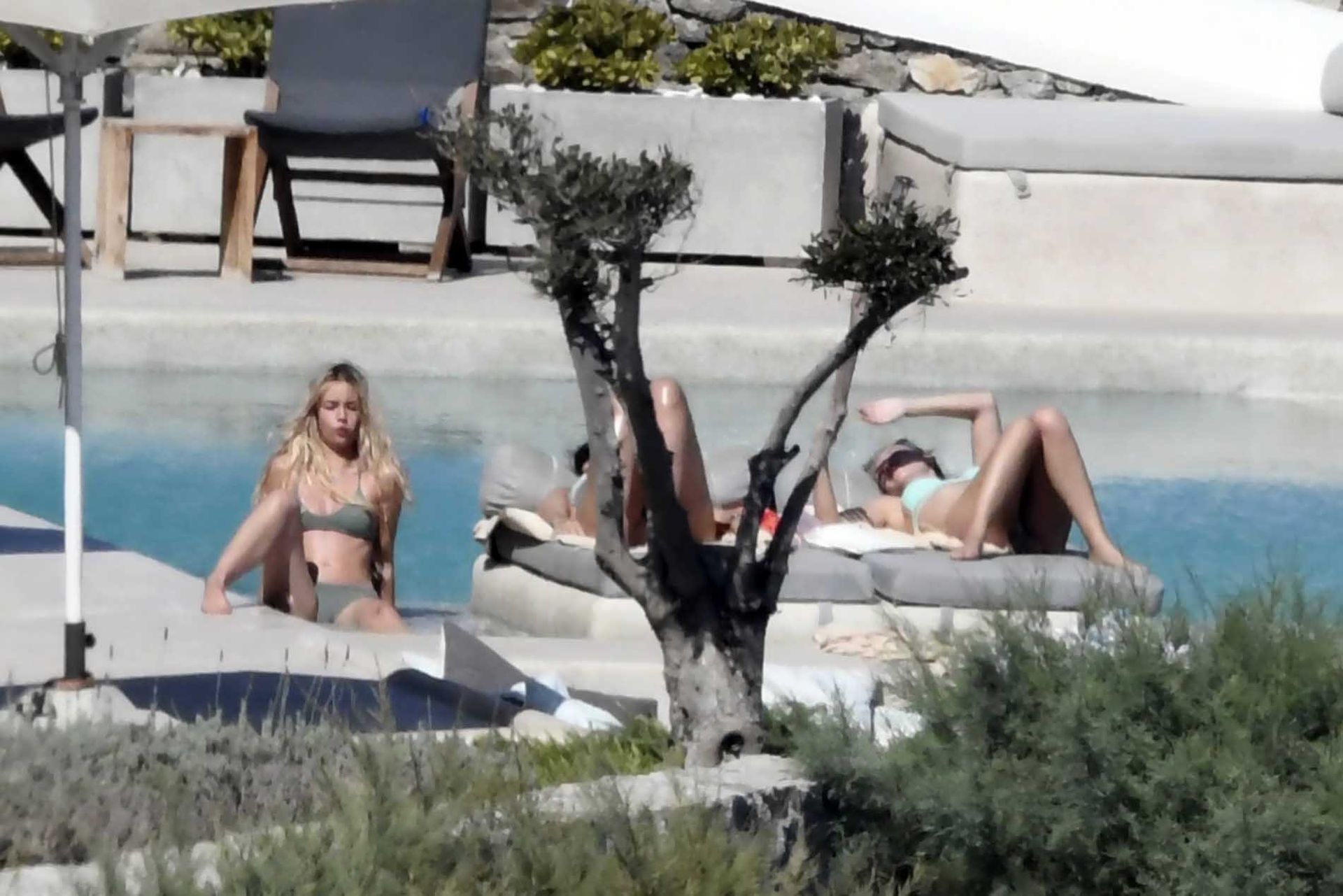 Le due bellezze in bikini e anche topless si rilassano e scherzano con altri amici mentre prendono il sole a bordo piscina durante la loro vacanza a Mykonos.