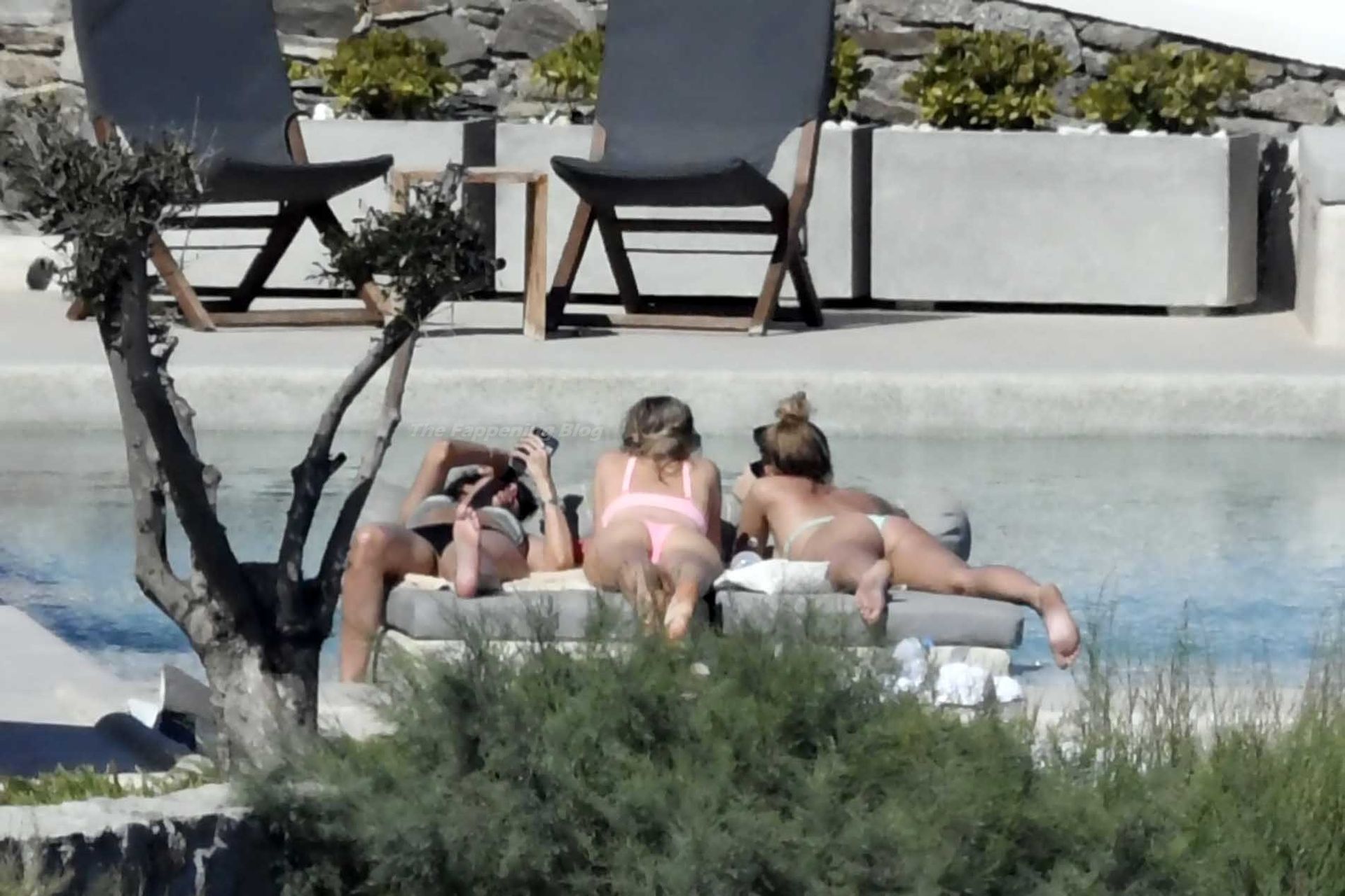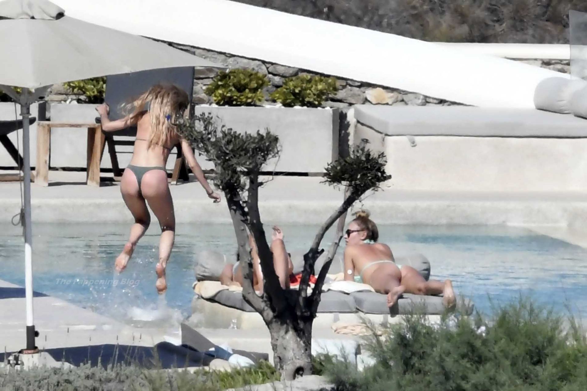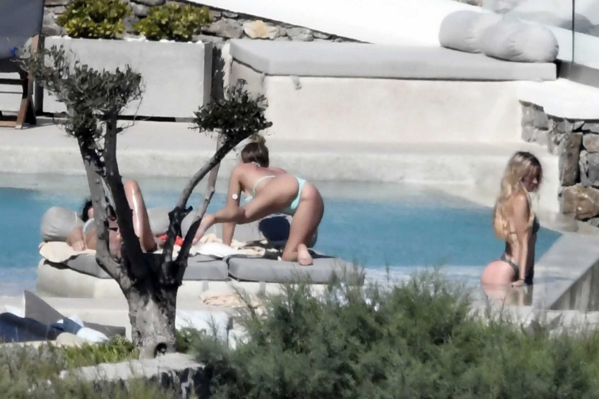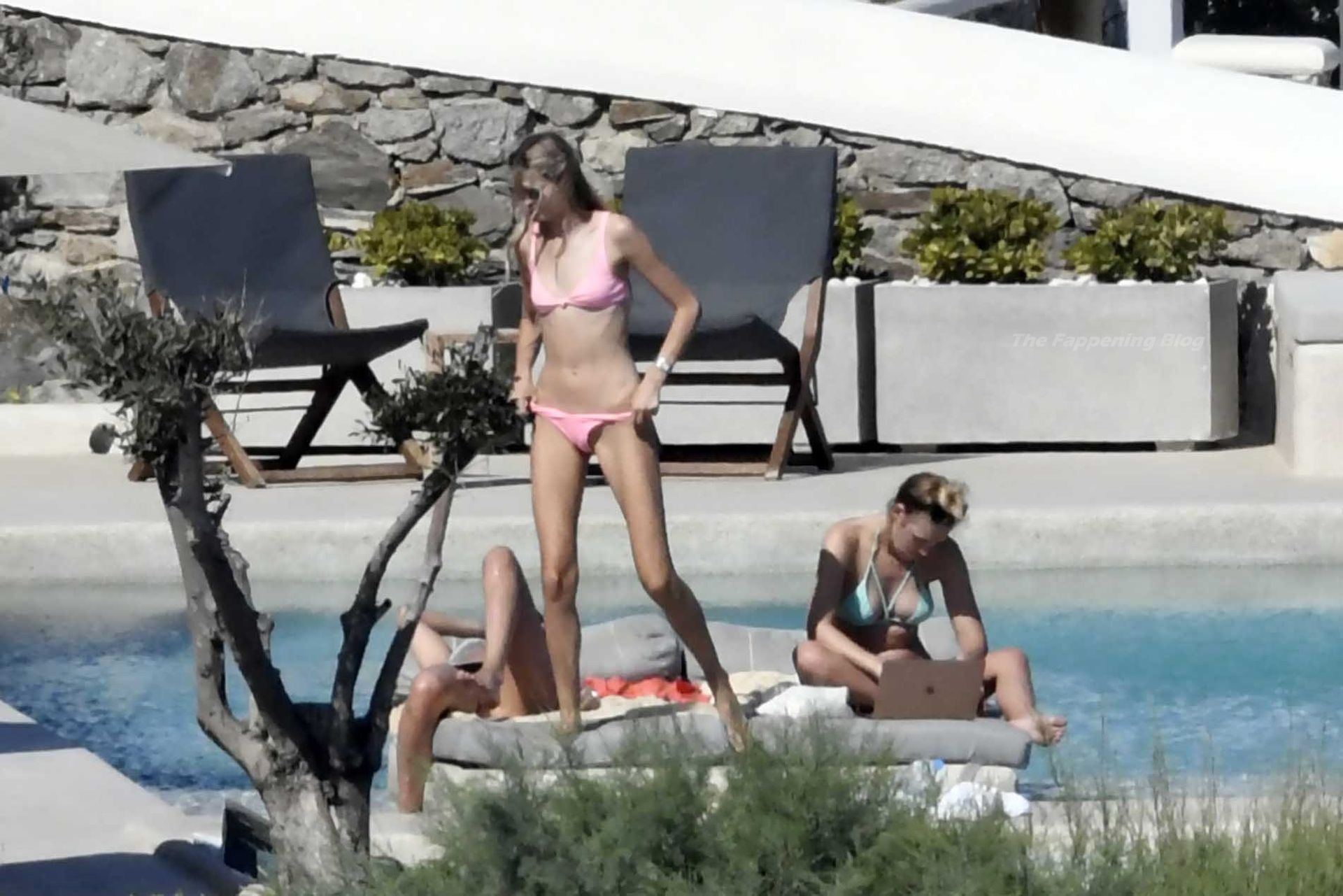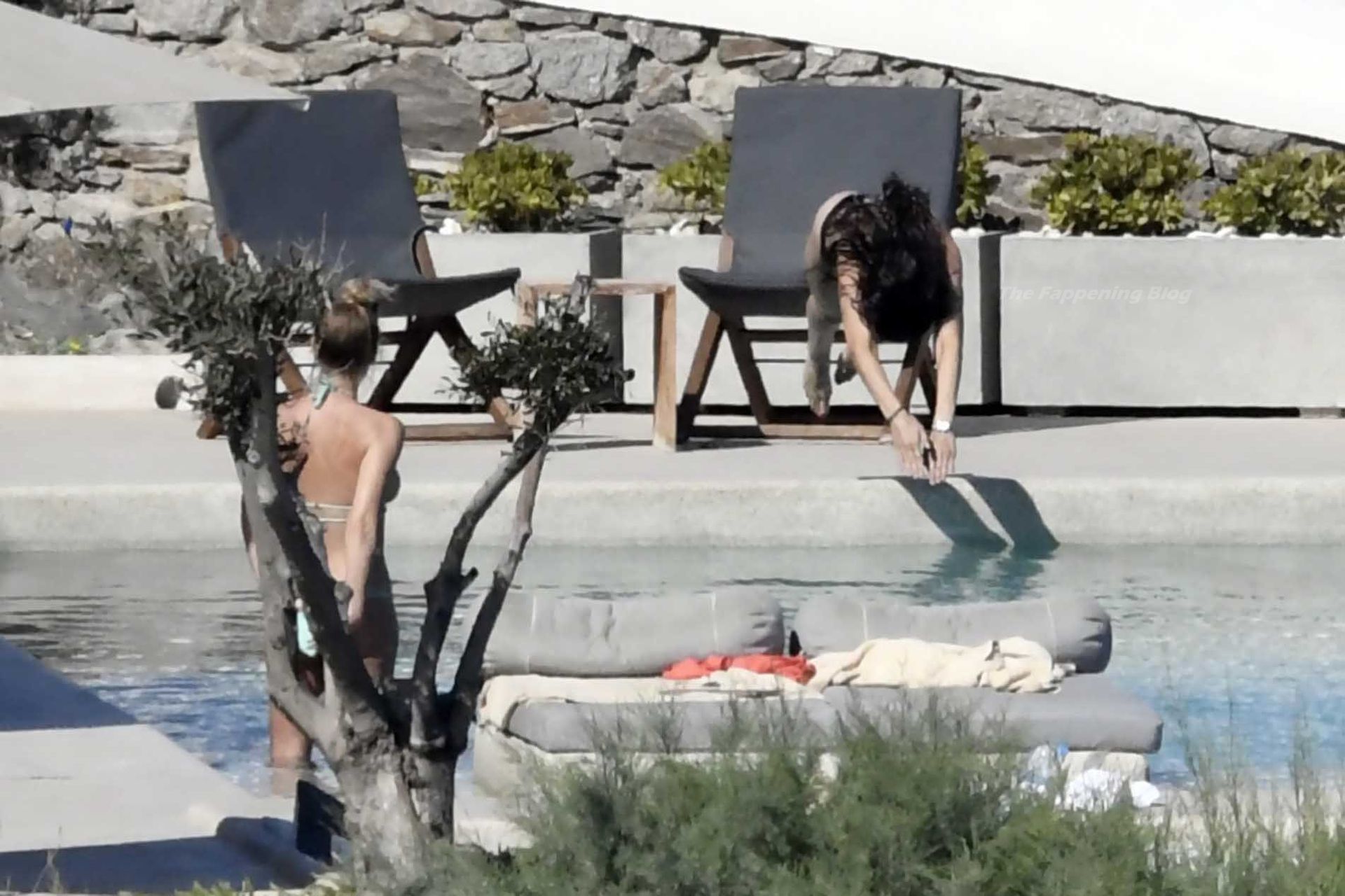 Le due bellezze in bikini e anche topless si rilassano e scherzano con altri amici mentre prendono il sole a bordo piscina durante la loro vacanza a Mykonos.