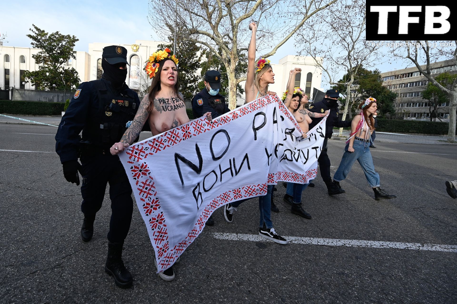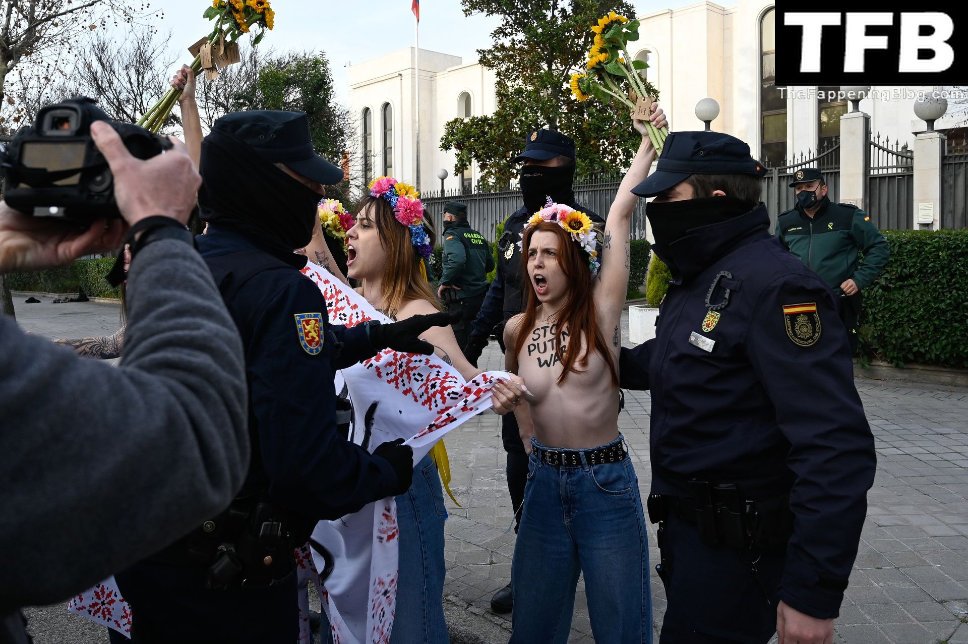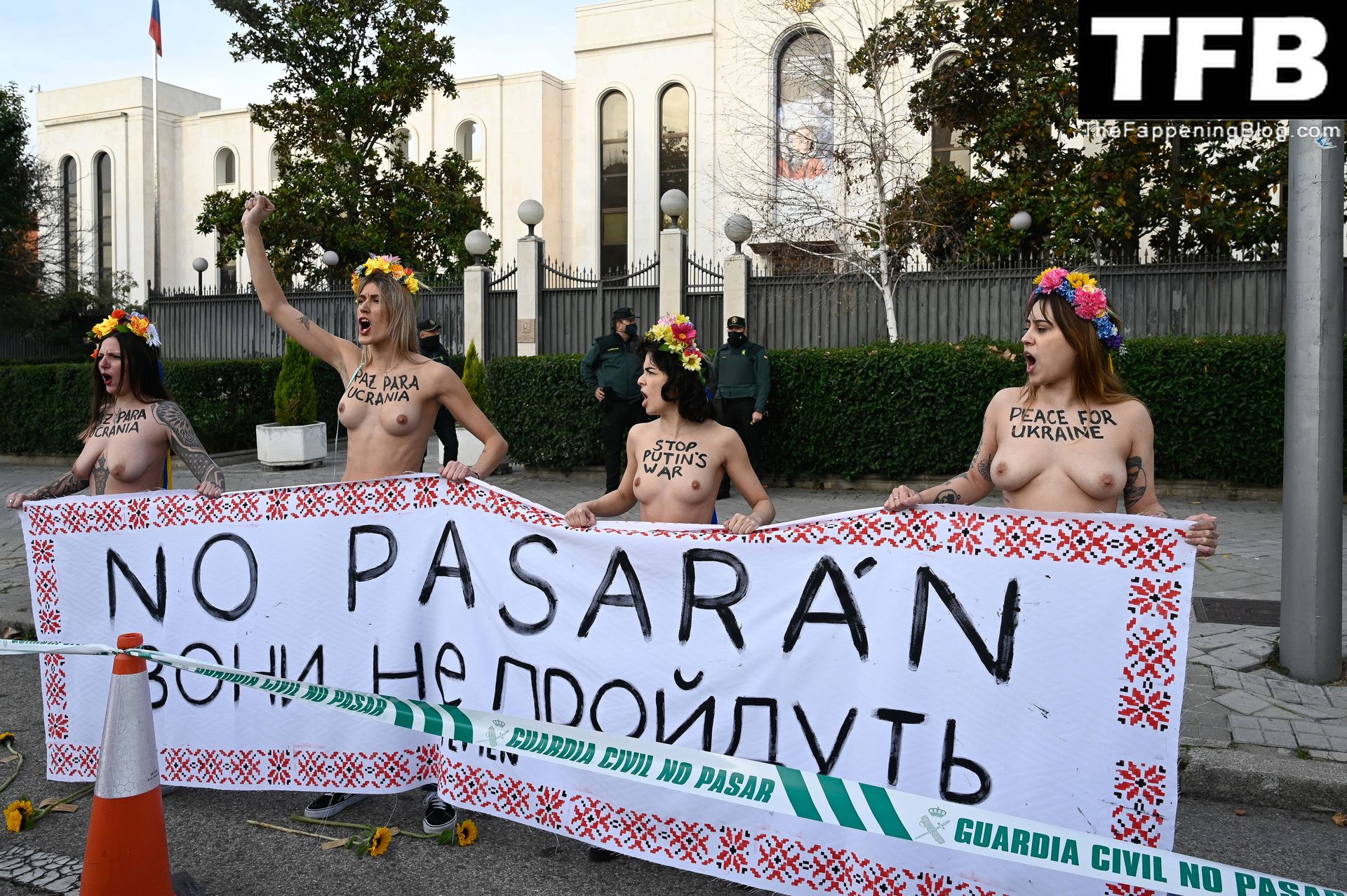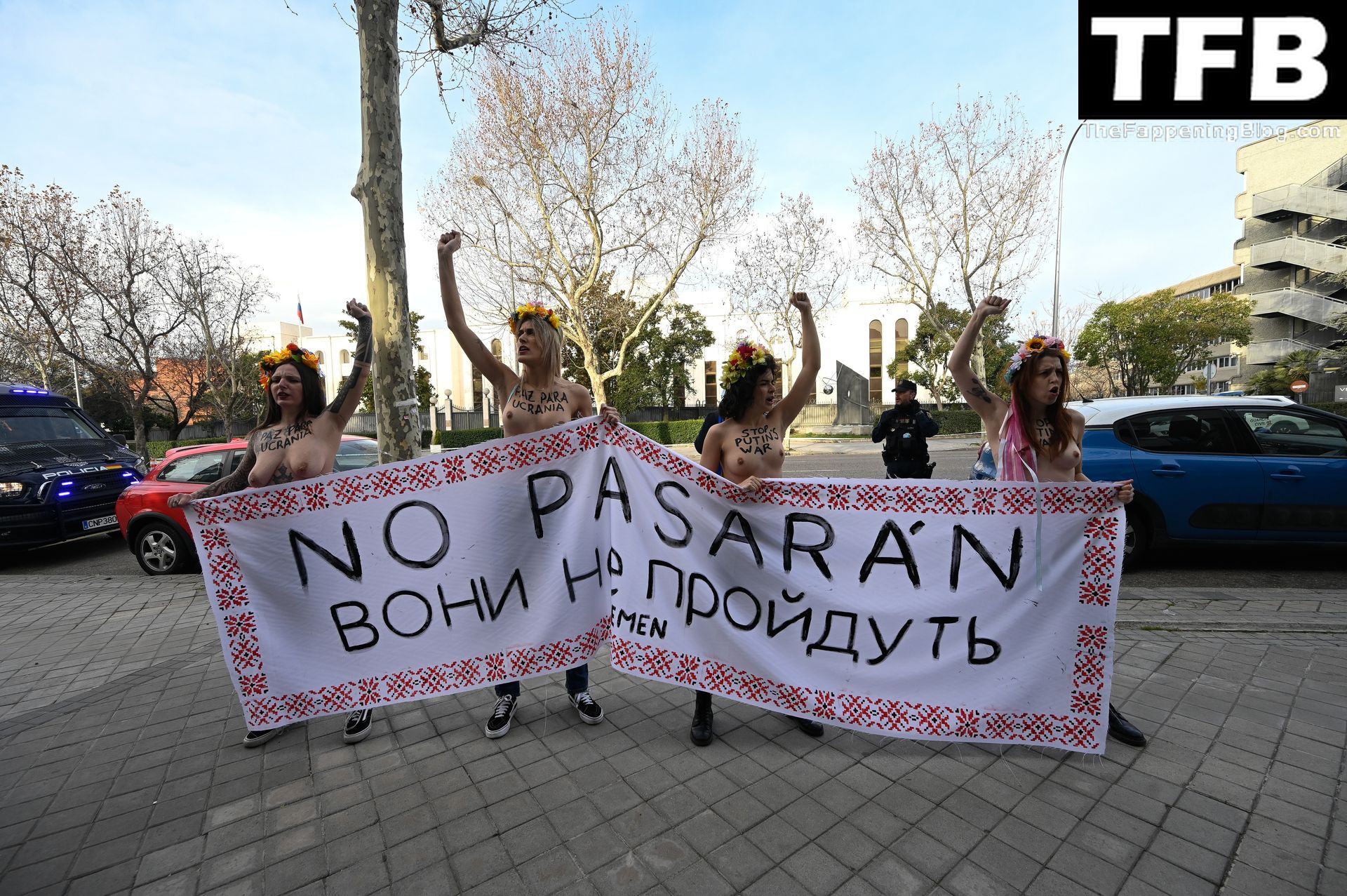 Attiviste topless con segni sul petto tengono uno striscione con scritto “No pasaran” (Non passeranno) davanti all’ambasciata russa durante la manifestazione. Con questa azione, Femen vuole mostrare il proprio rifiuto all’invasione dell’Ucraina da parte della Russia, che oggi compie otto giorni.