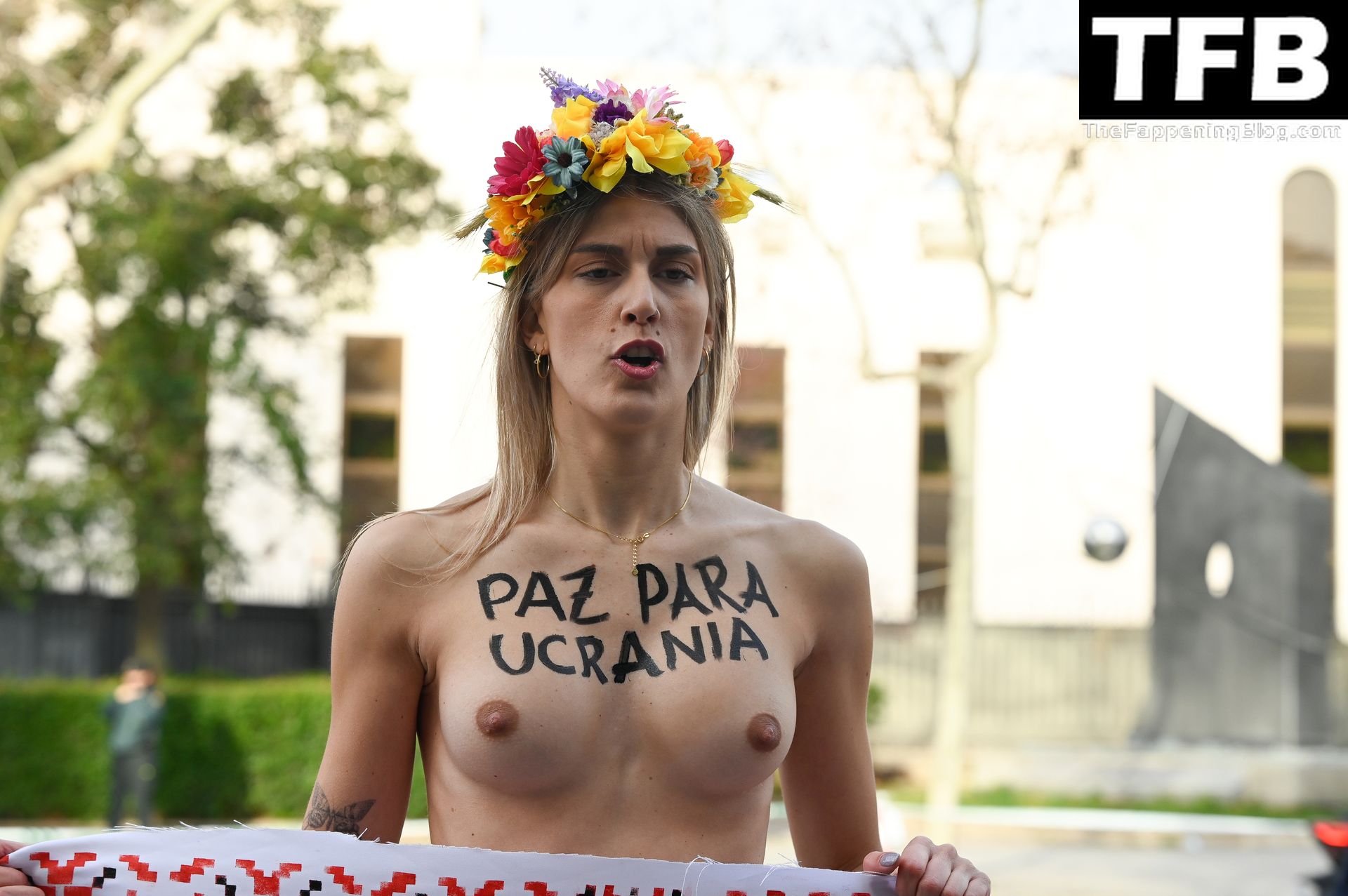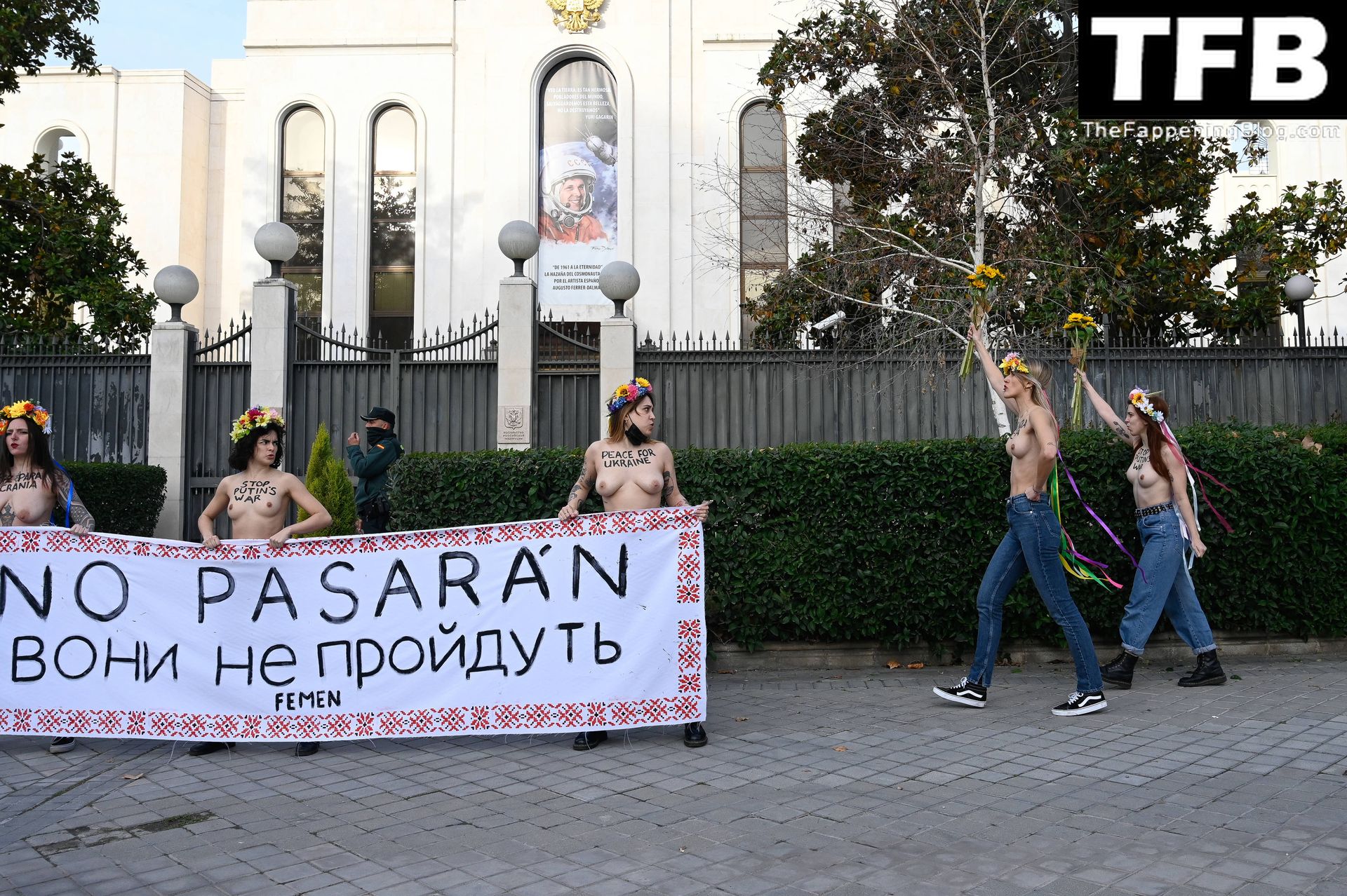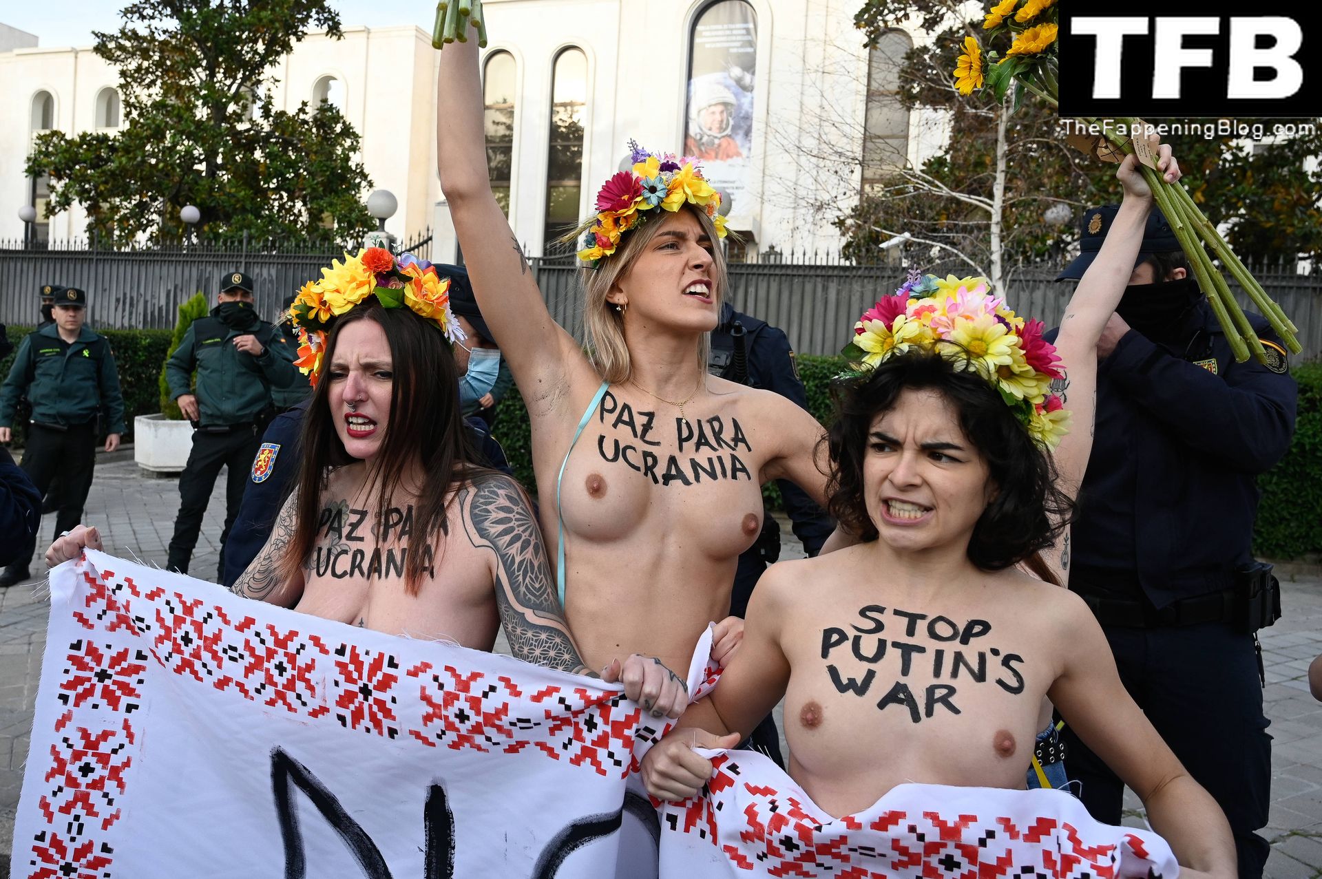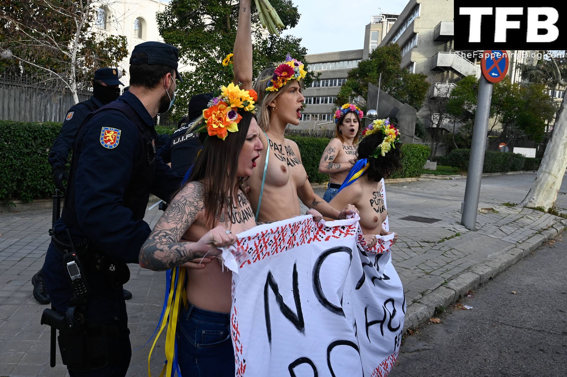 Attiviste topless con segni sul petto tengono uno striscione con scritto “No pasaran” (Non passeranno) davanti all’ambasciata russa durante la manifestazione. Con questa azione, Femen vuole mostrare il proprio rifiuto all’invasione dell’Ucraina da parte della Russia, che oggi compie otto giorni.